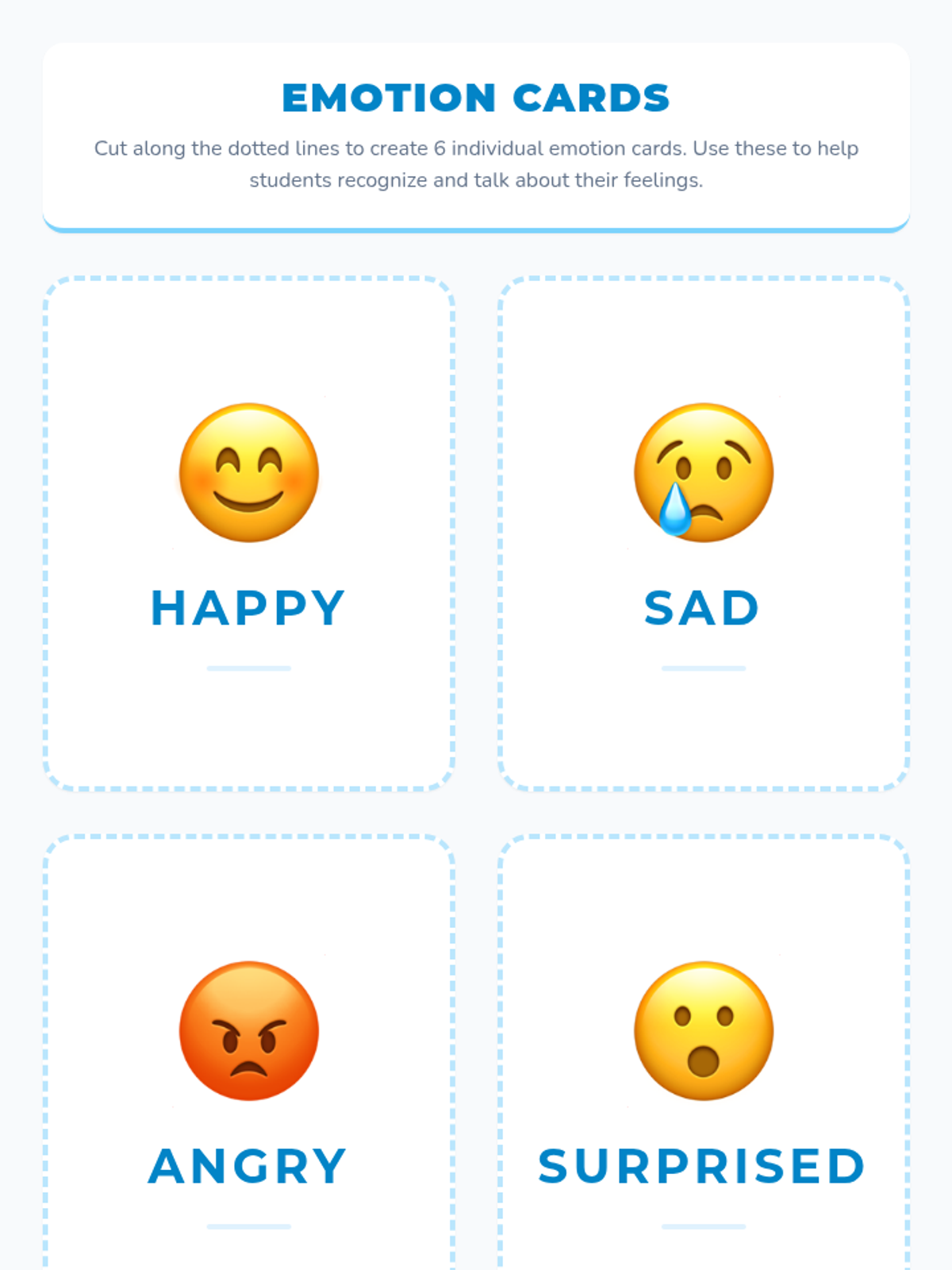 A social-emotional learning lesson focused on identifying and expressing core emotions through interactive task cards and group discussion. Students learn to recognize physiological and situational cues for different feelings.