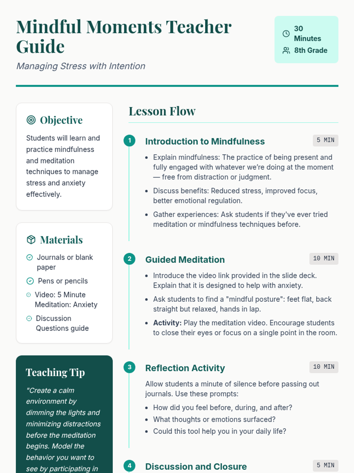 A 30-minute lesson for 8th graders introducing mindfulness and meditation techniques to manage stress and anxiety effectively through guided practice and reflection.