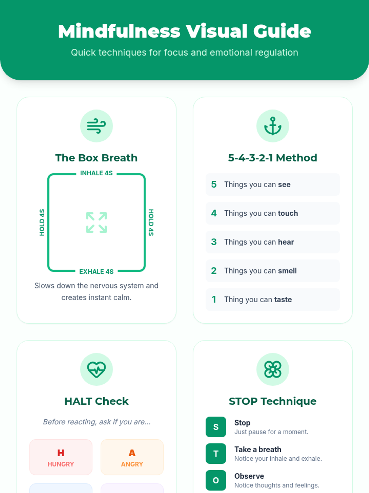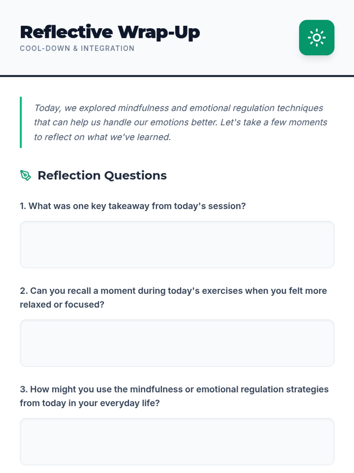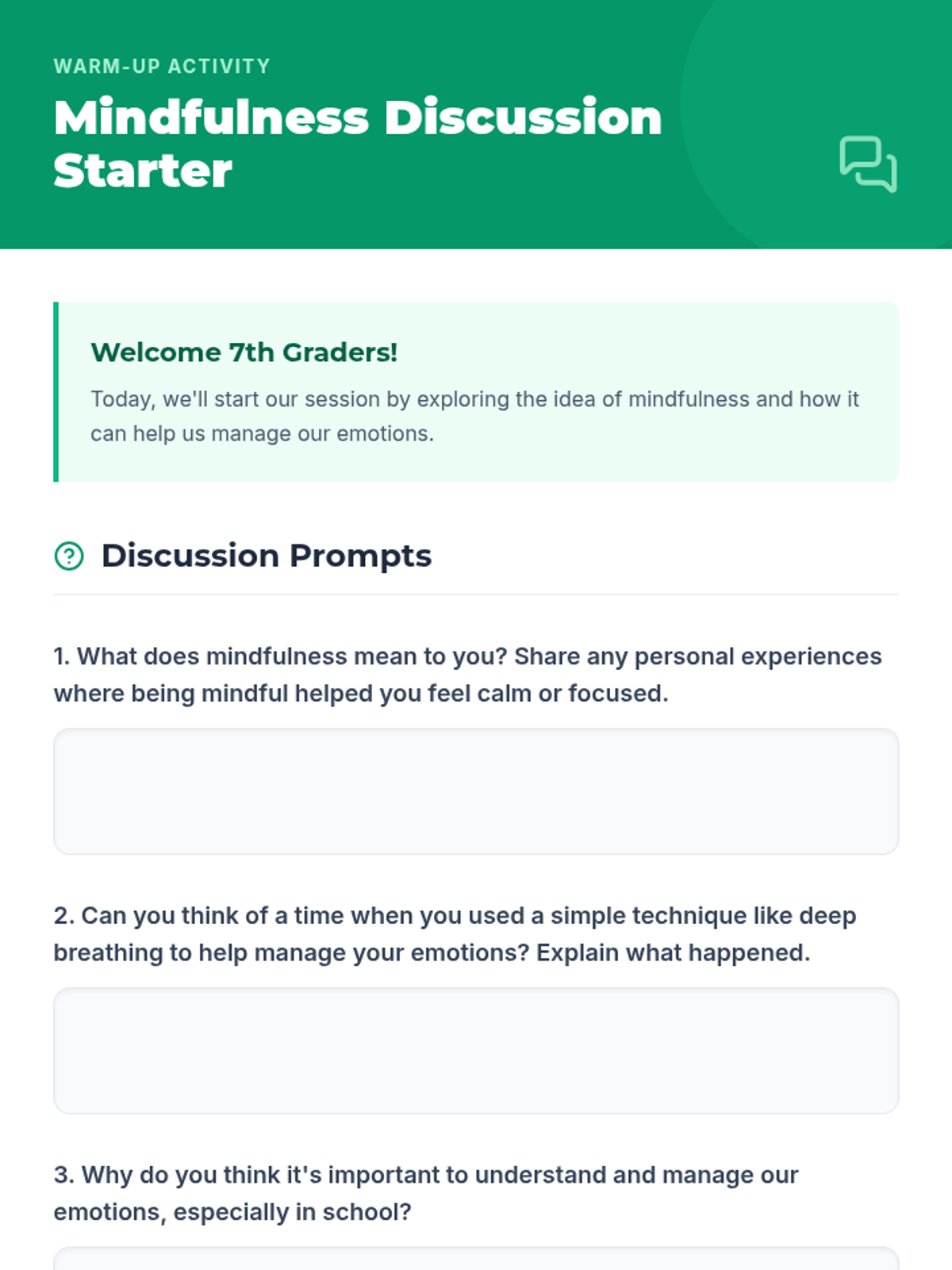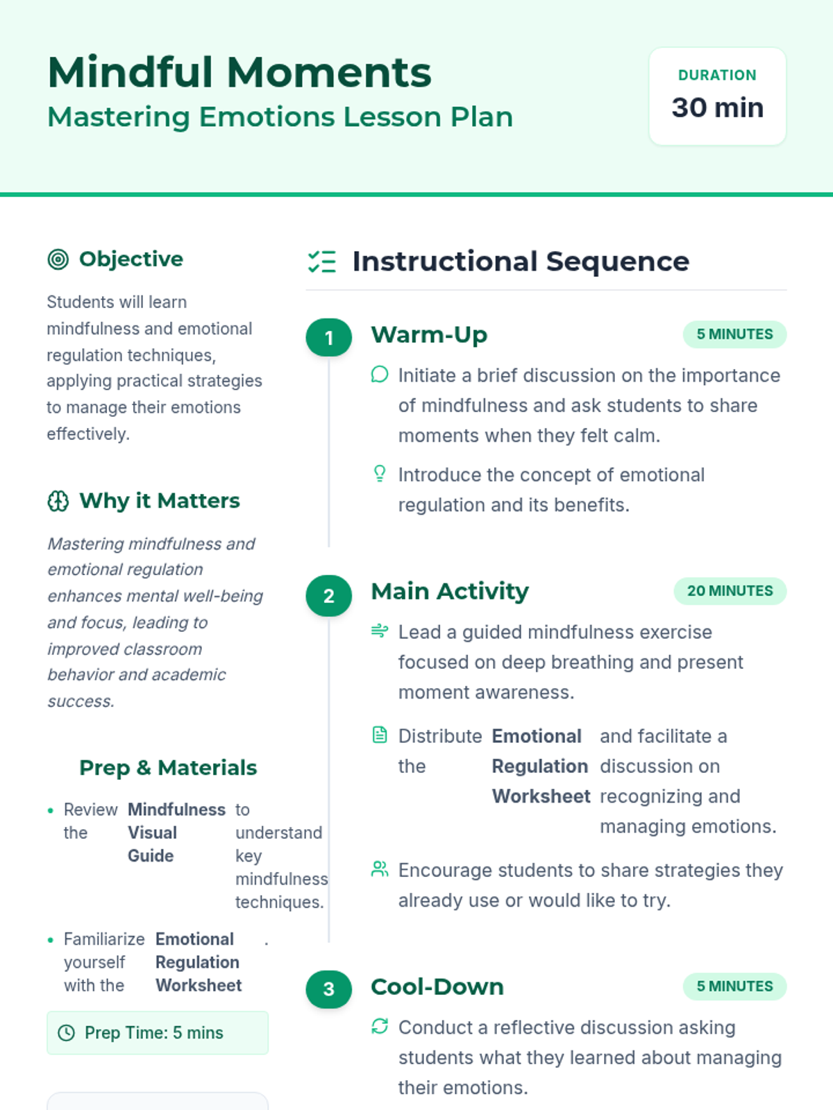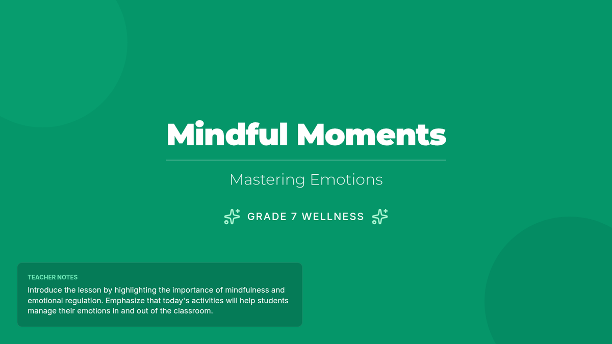 A lesson for 7th graders on mindfulness and emotional regulation, featuring guided exercises, reflective activities, and practical strategies for managing well-being.