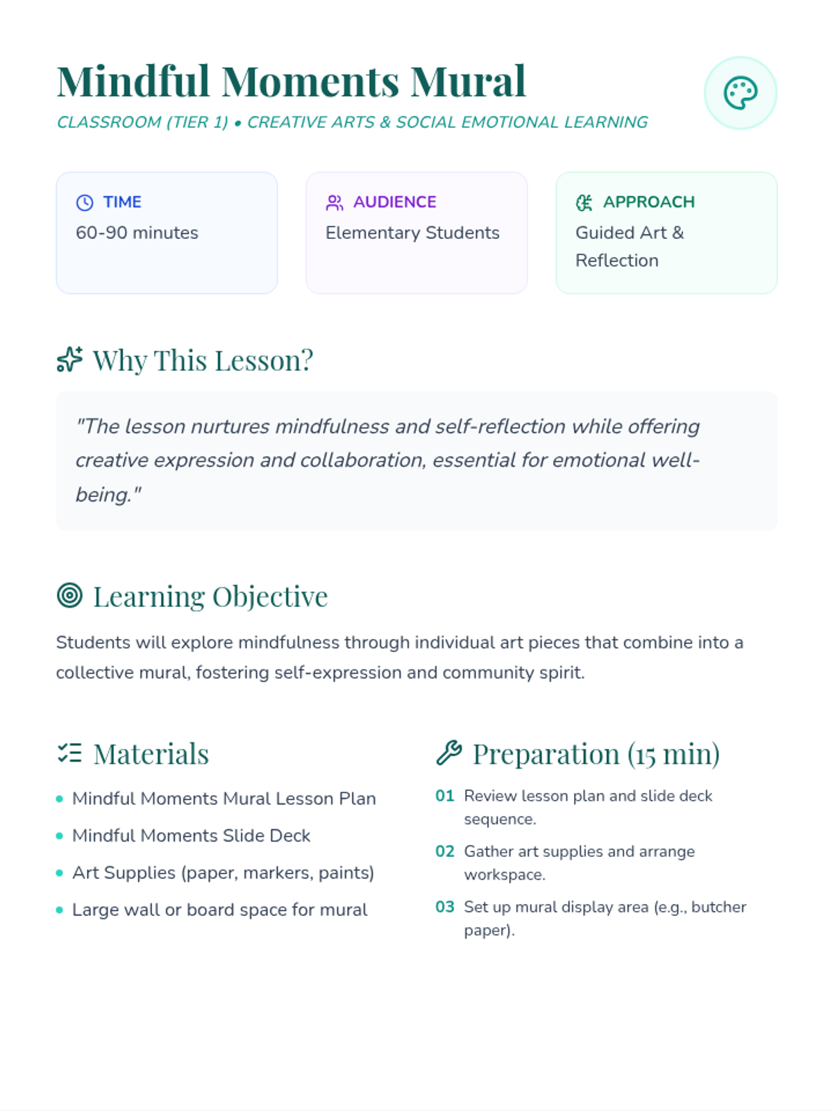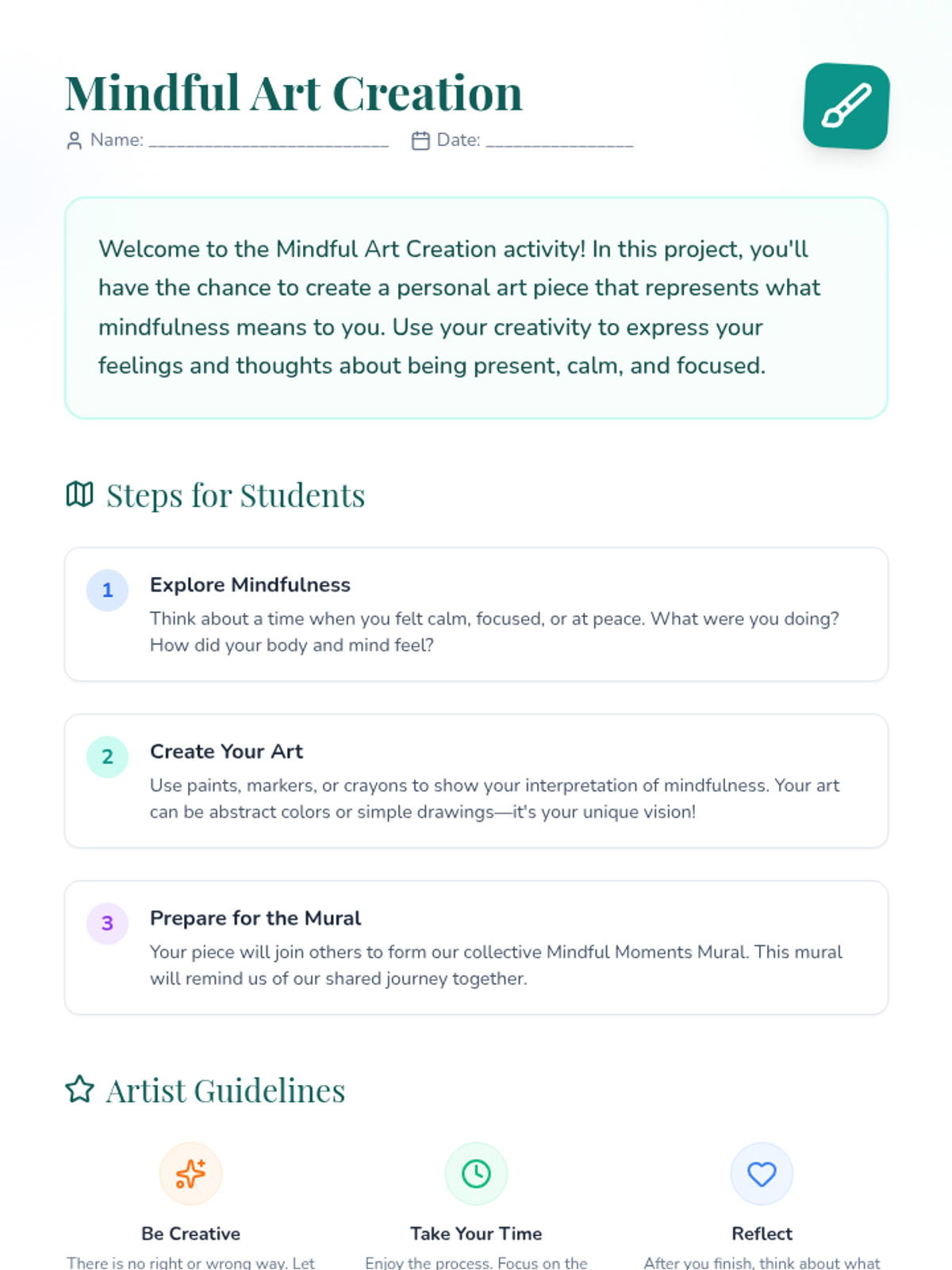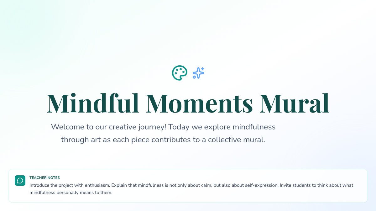 A creative project where students explore mindfulness through individual art pieces that combine into a large mural, promoting self-expression and community.