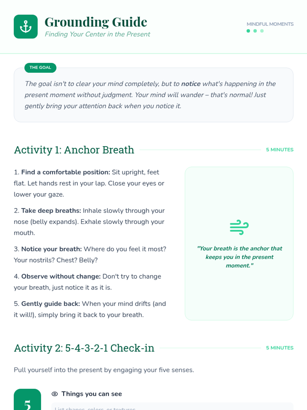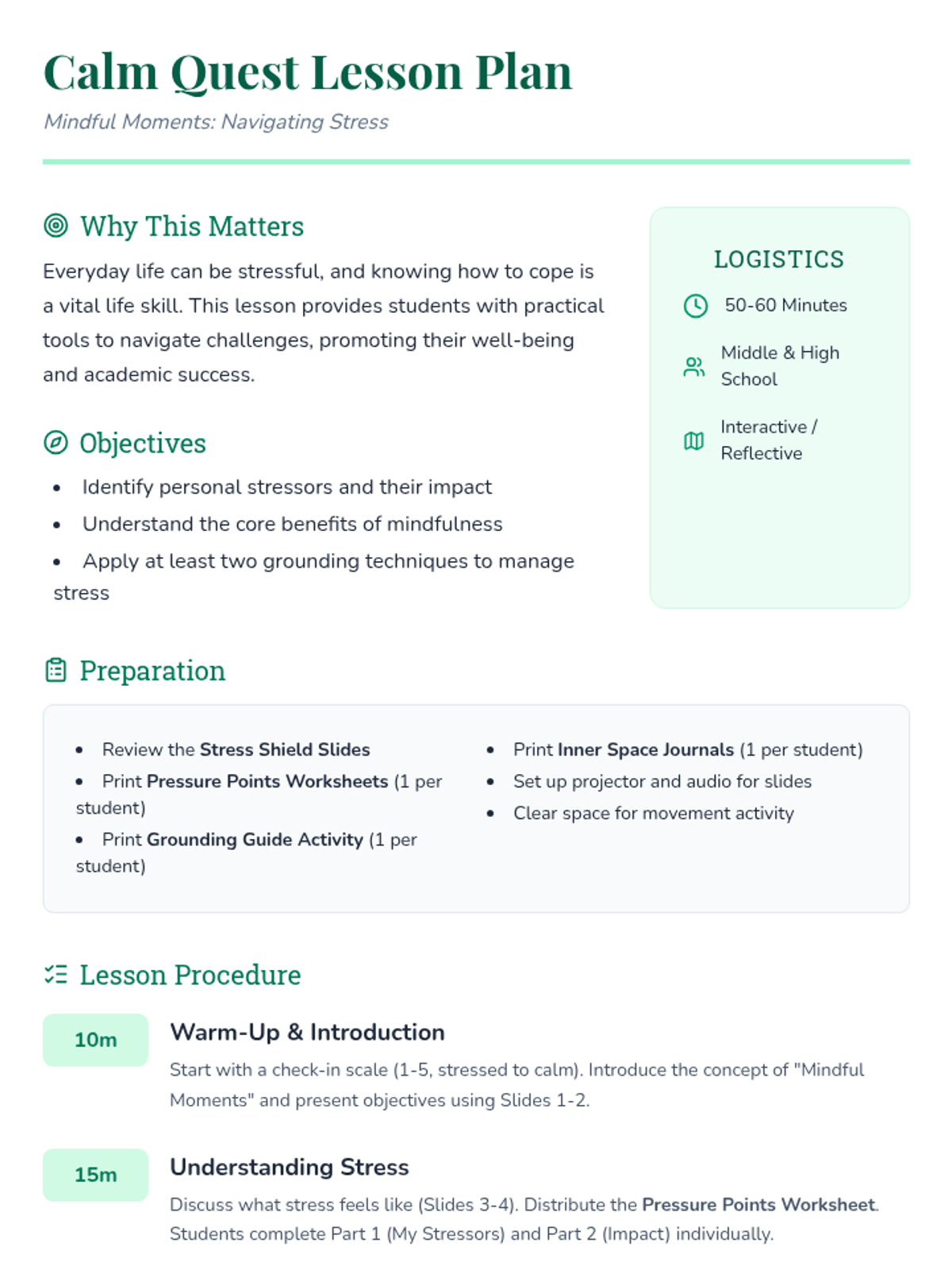 A comprehensive lesson for middle and high school students to identify stressors and learn practical mindfulness techniques to build resilience and manage daily pressure.