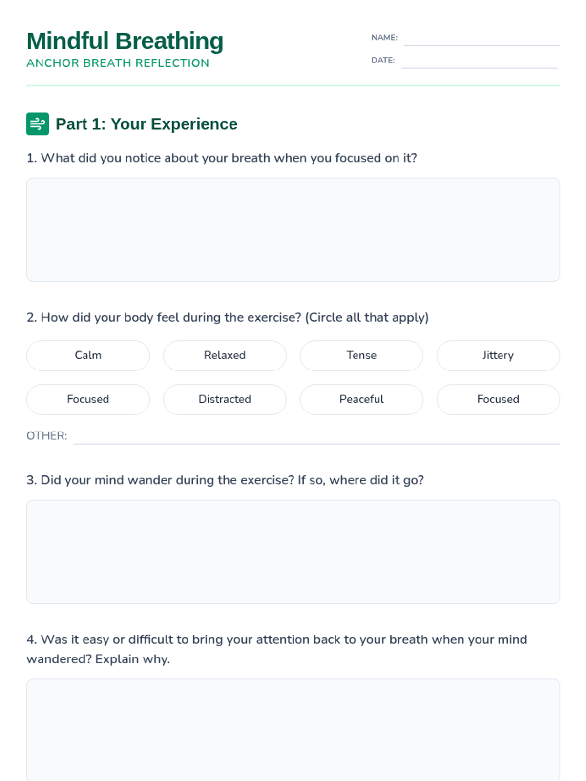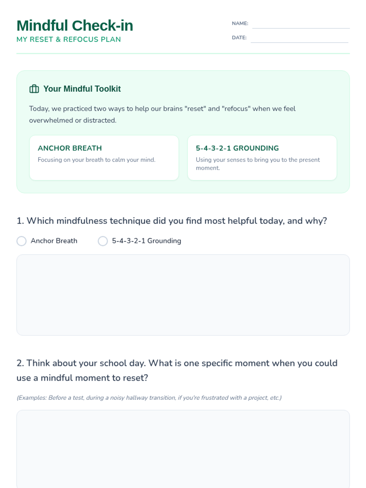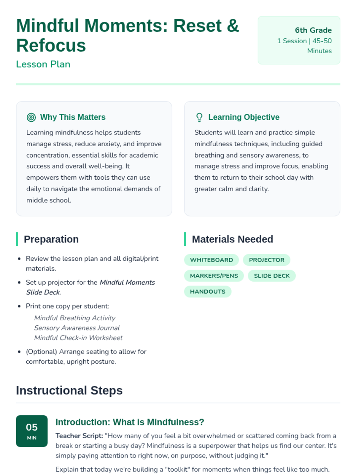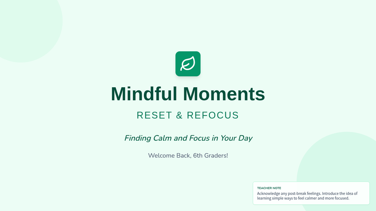 A 45-50 minute mindfulness lesson for 6th graders to help them manage post-break overwhelm through guided breathing and sensory grounding techniques.