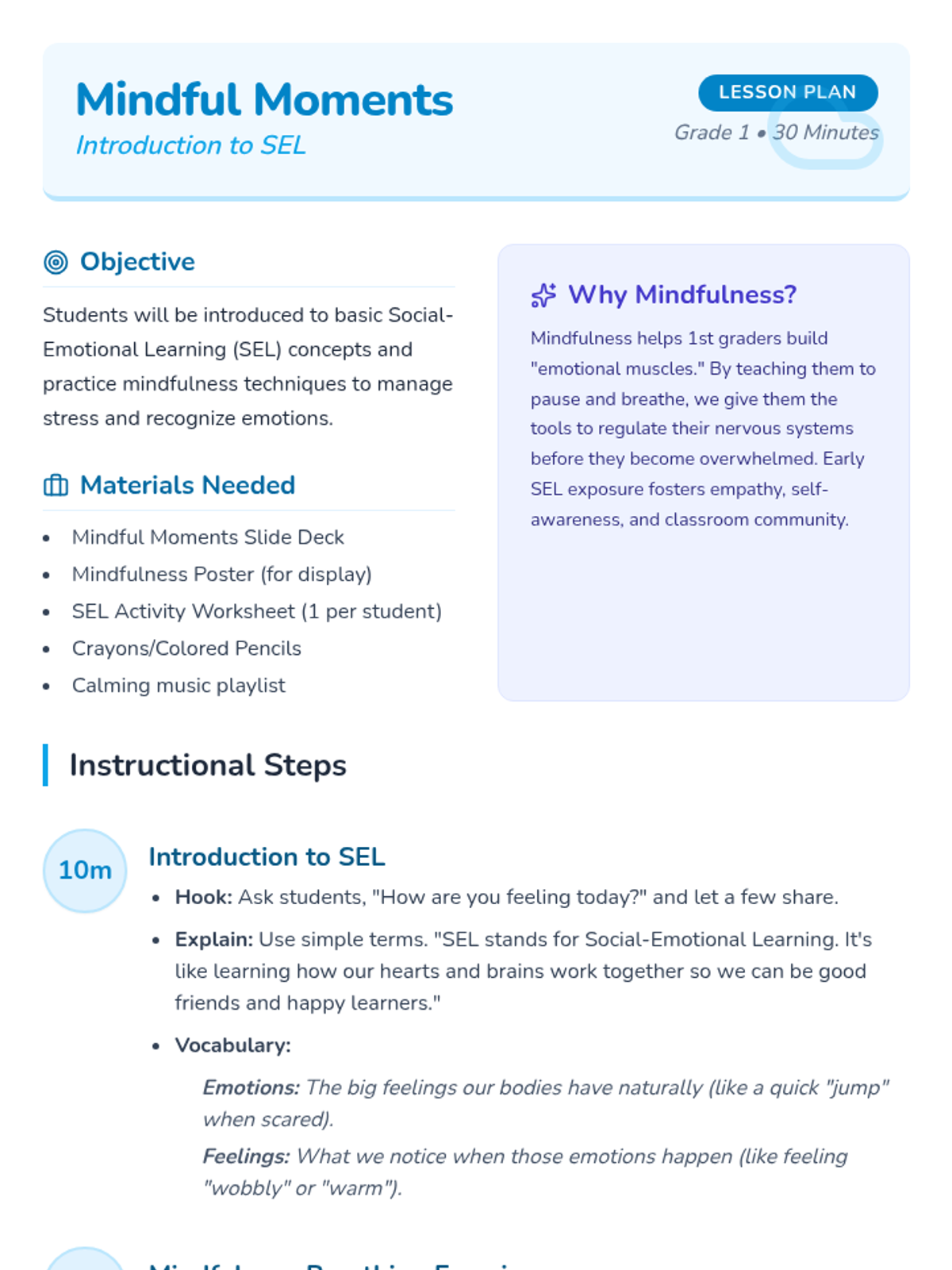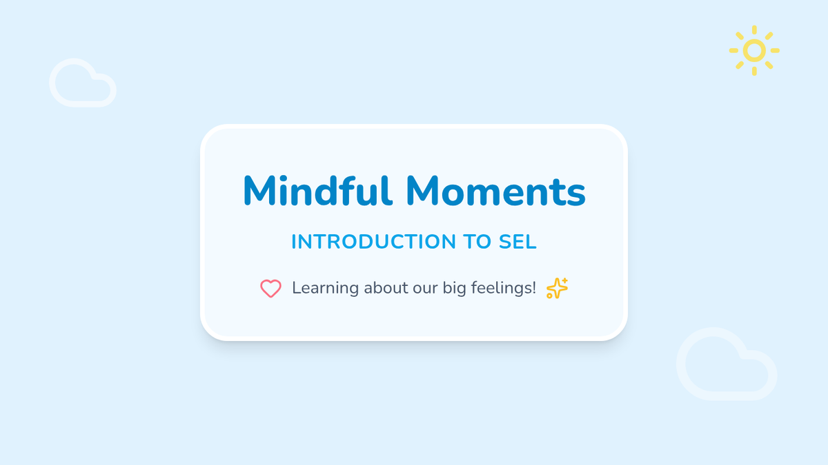 A gentle introduction to Social-Emotional Learning for 1st graders, focusing on mindfulness, breathing techniques, and emotion identification.