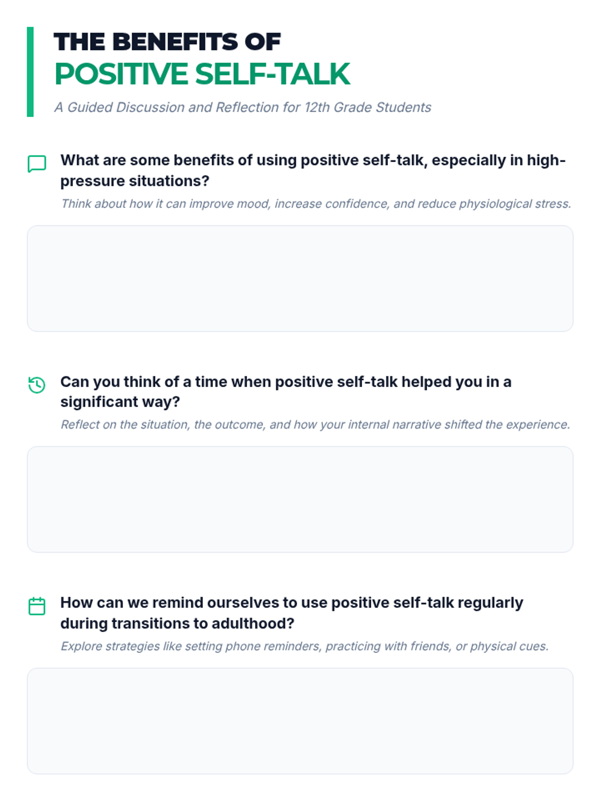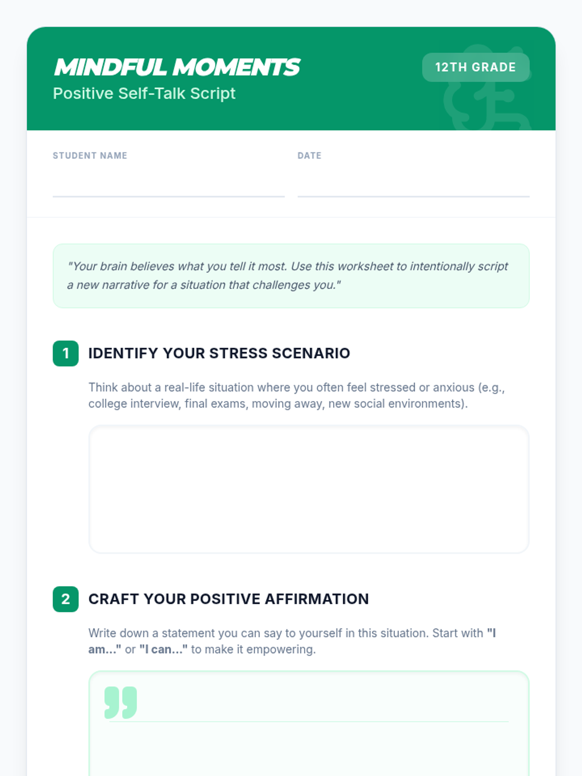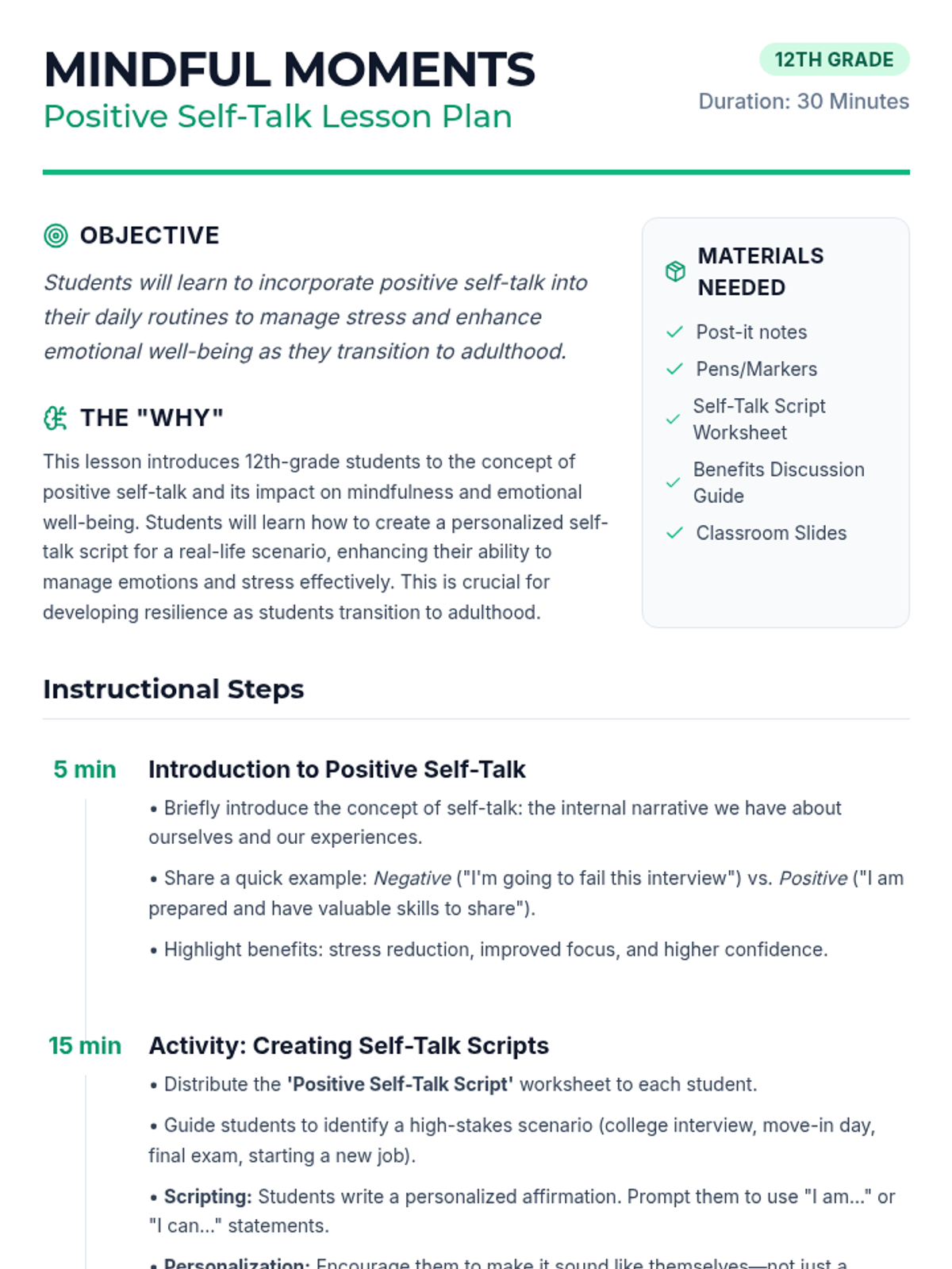 This lesson introduces 12th-grade students to the concept of positive self-talk and its impact on mindfulness and emotional well-being, helping them build resilience for life's transitions.