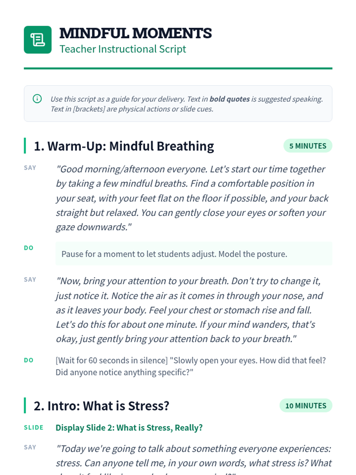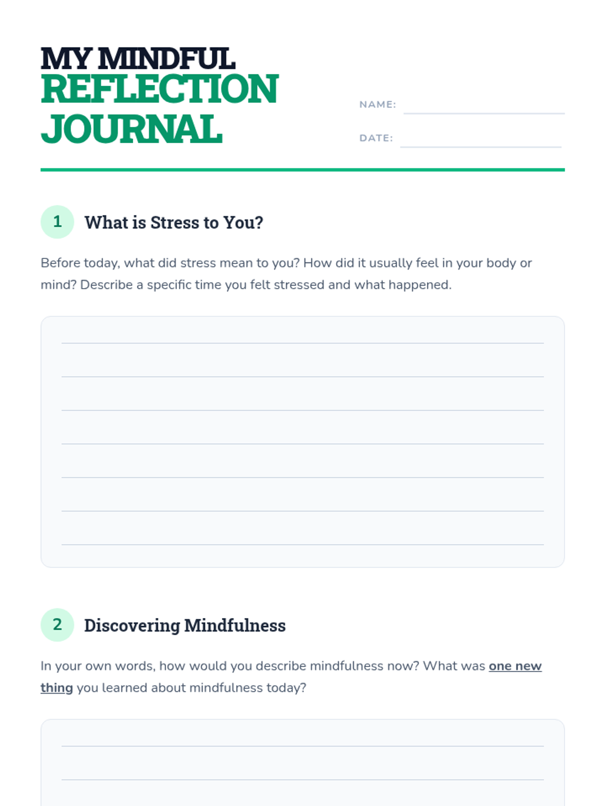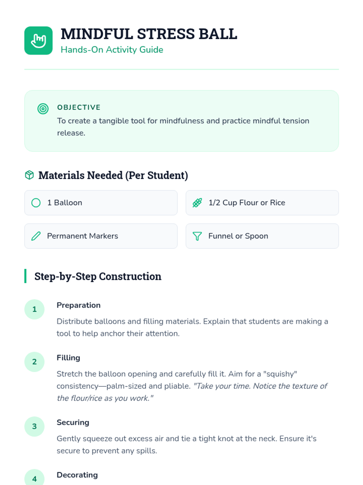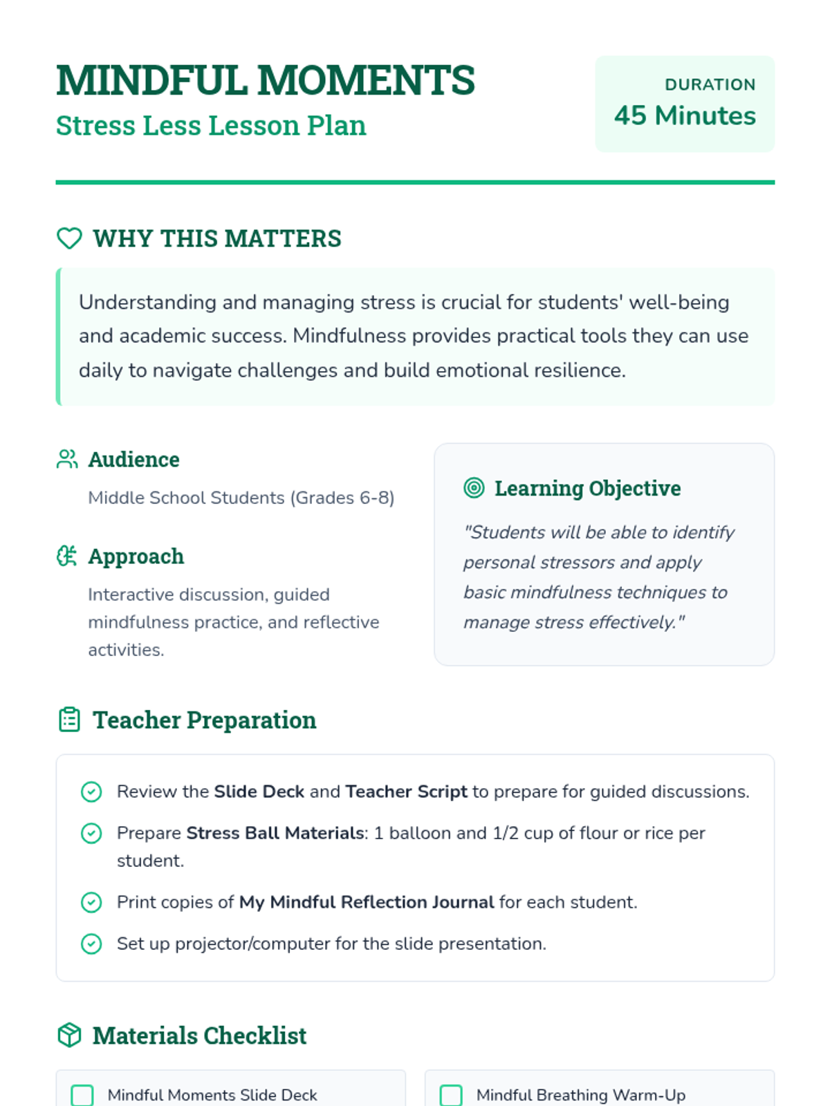 A 45-minute lesson for middle school students to understand stress and learn mindfulness techniques, featuring a hands-on stress ball activity and reflective journaling.
