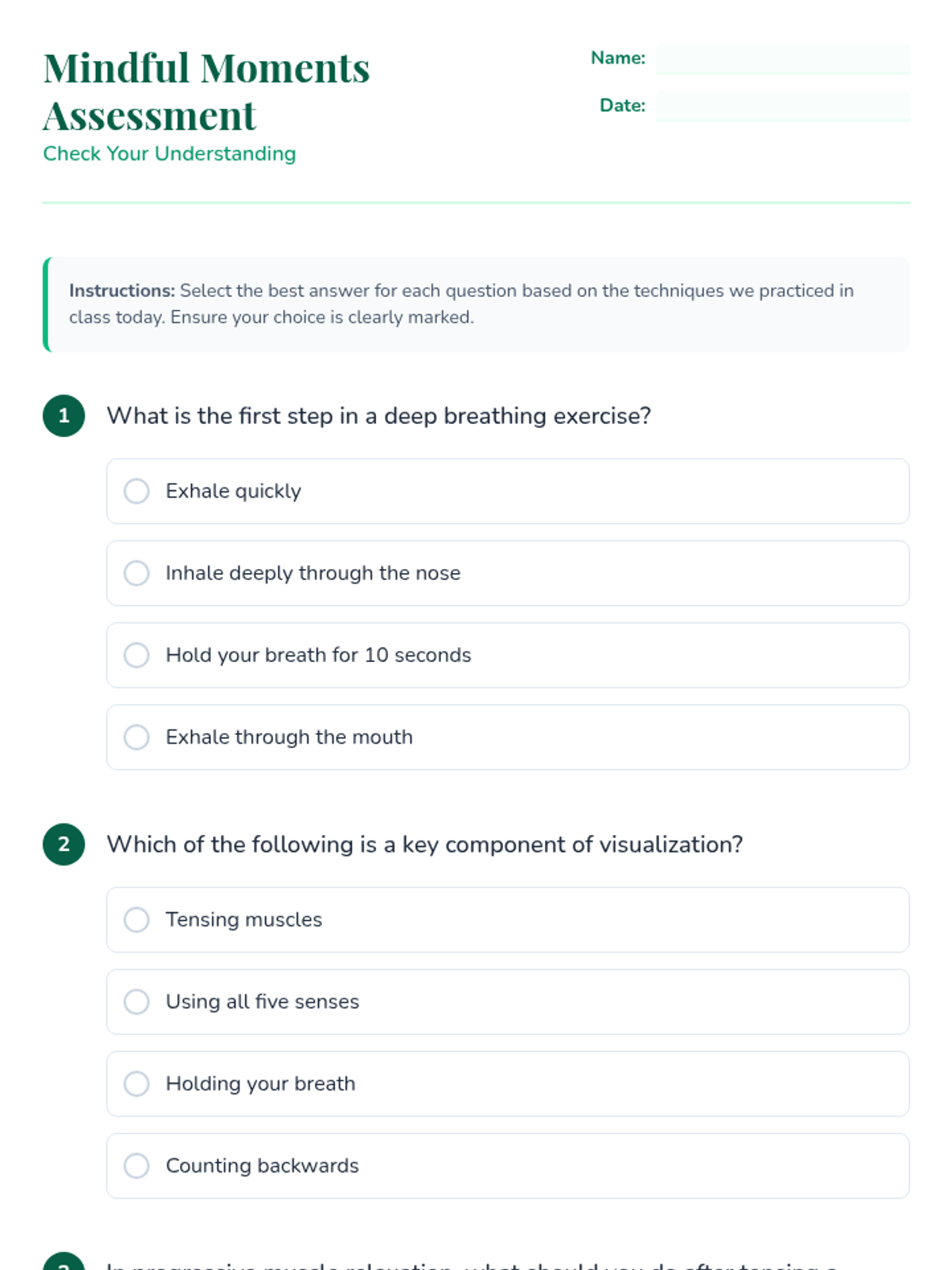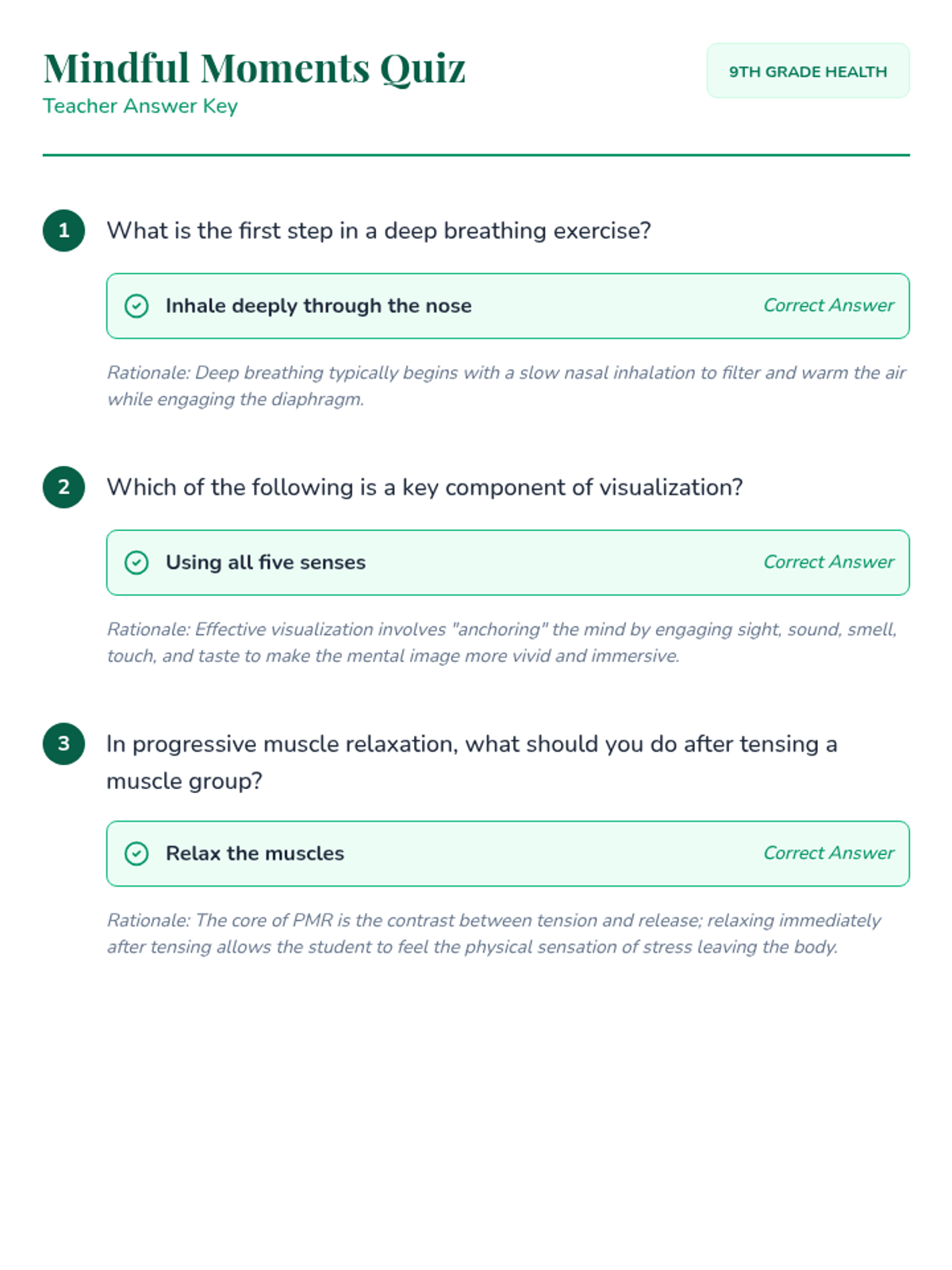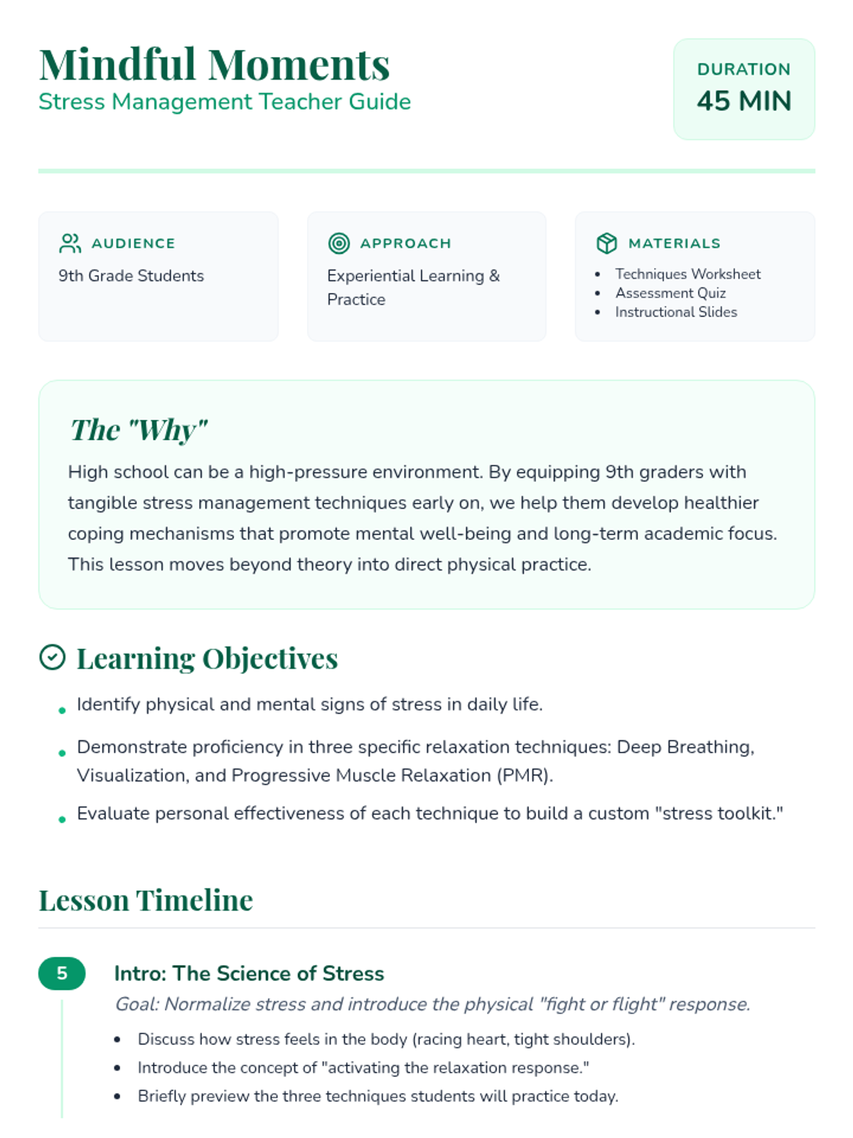 A comprehensive 45-minute lesson for 9th graders focused on practical stress management techniques including deep breathing, visualization, and progressive muscle relaxation. Students will learn the science of stress and practice immediate coping strategies.