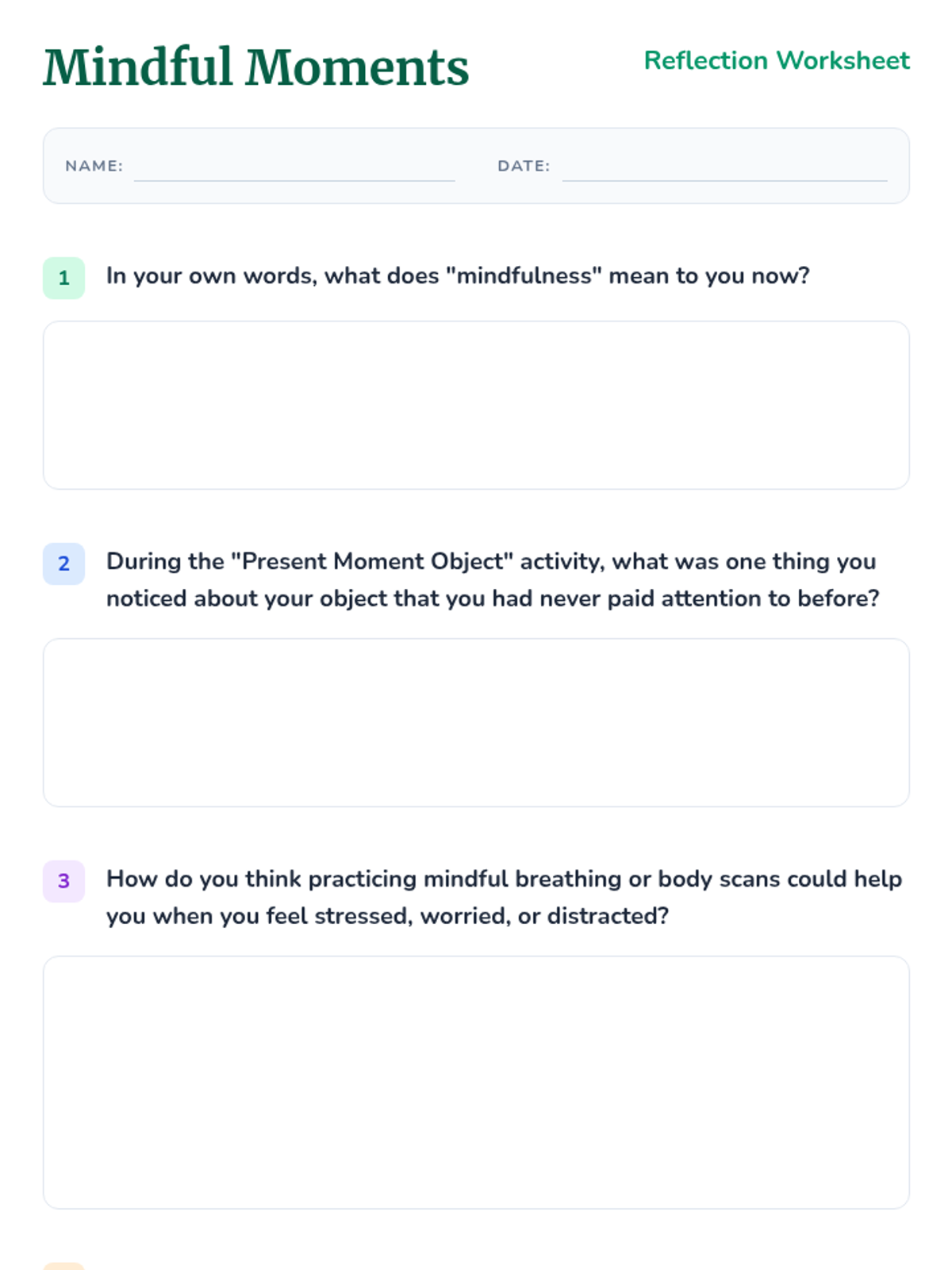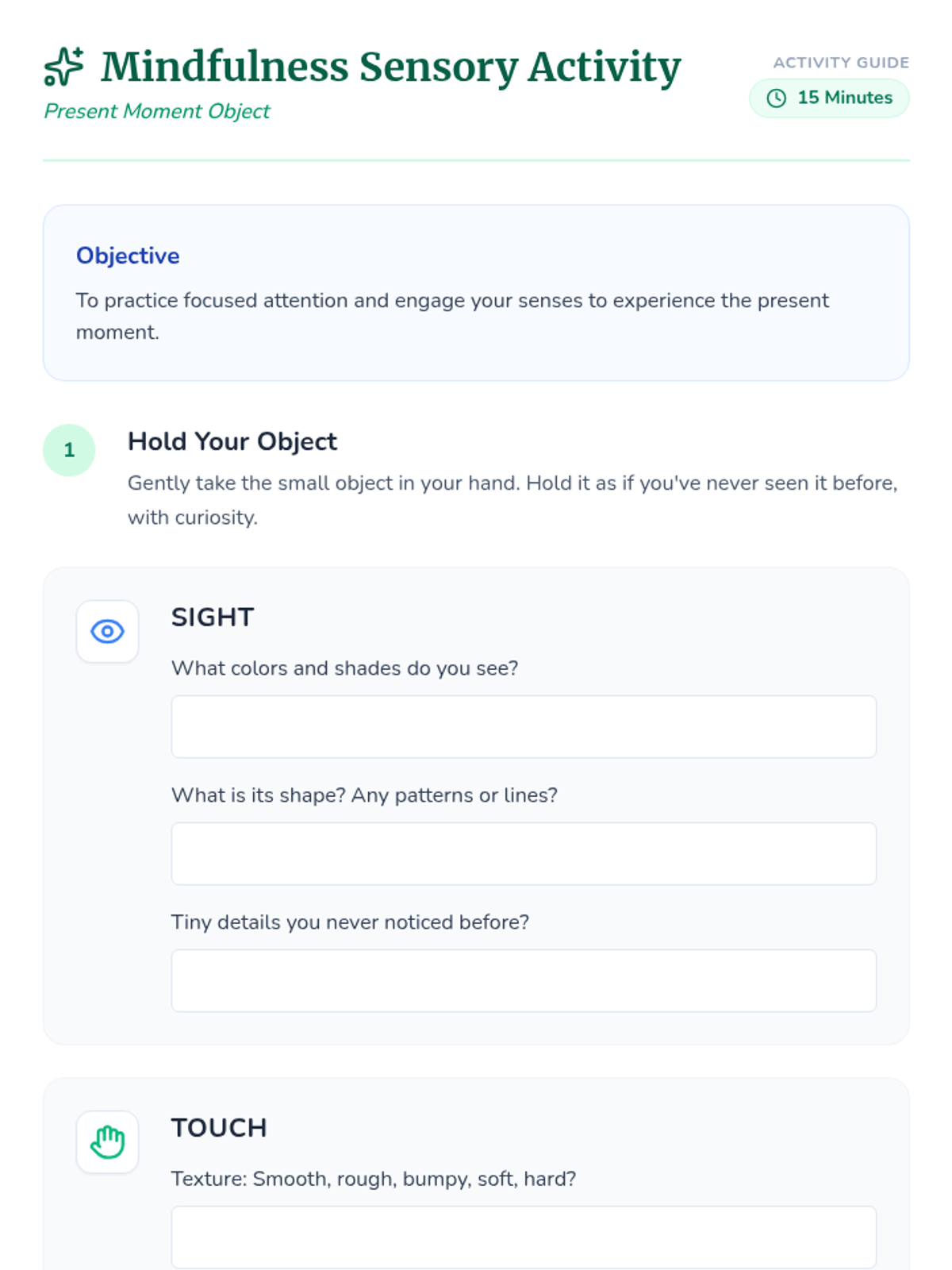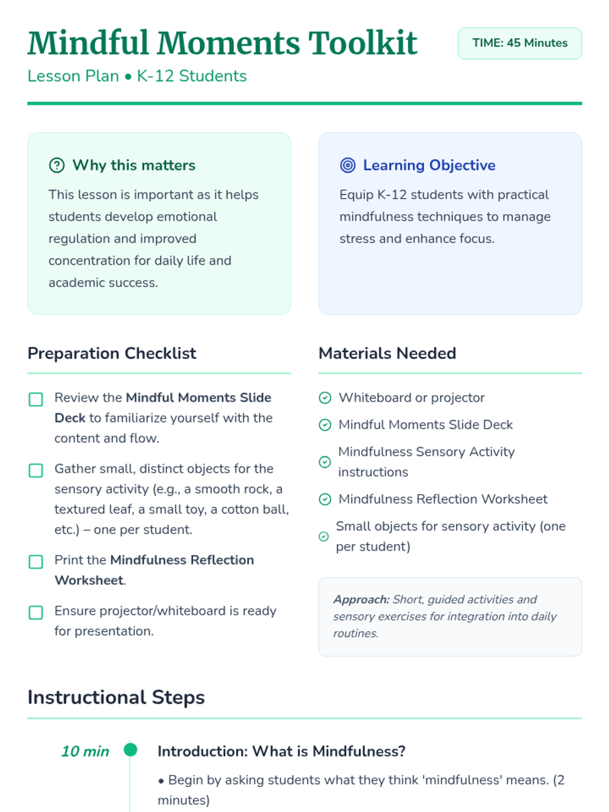 A 45-minute introductory lesson on mindfulness for K-12 students, featuring sensory activities, breathing exercises, and reflection tools to improve focus and emotional regulation.