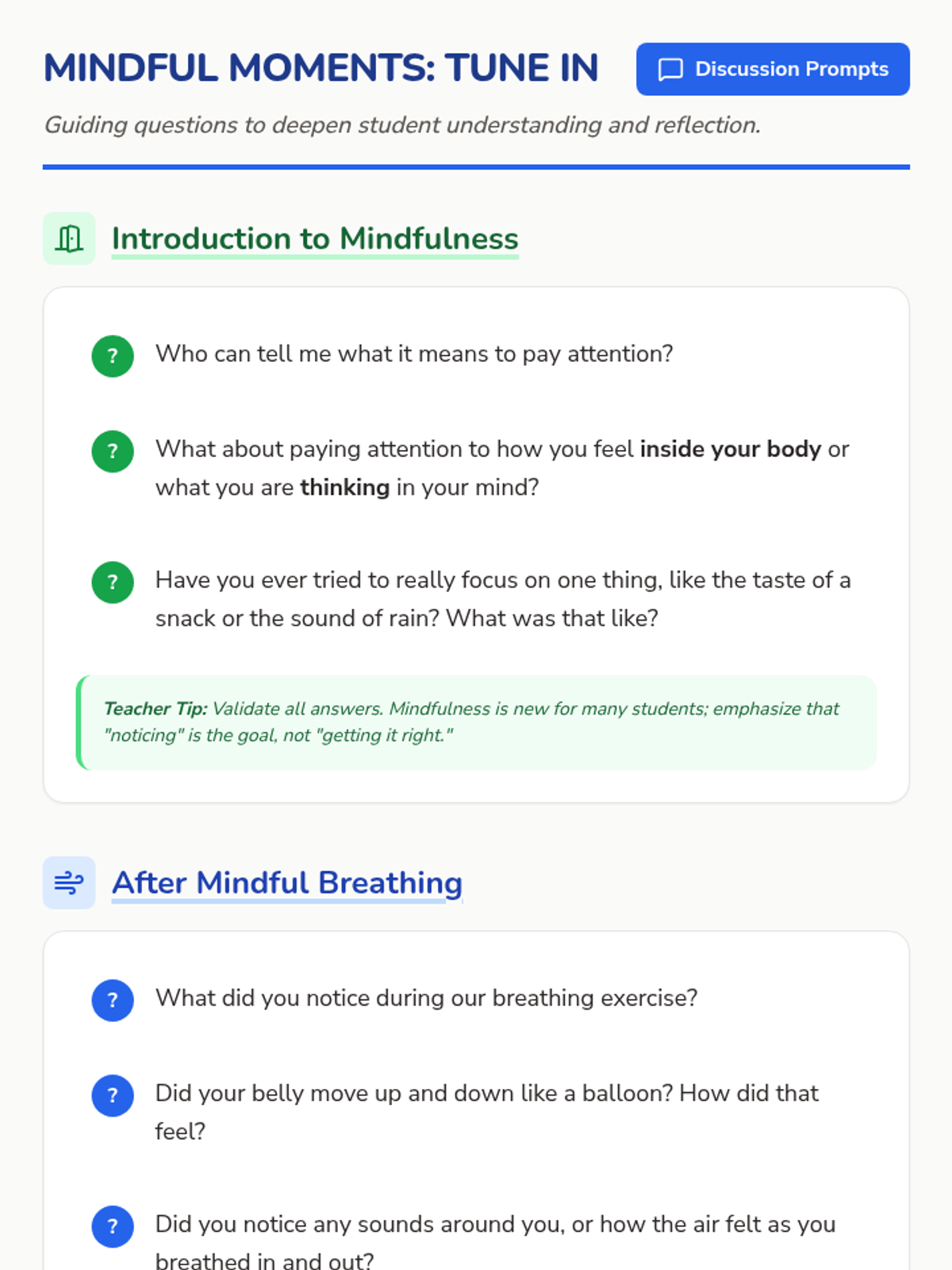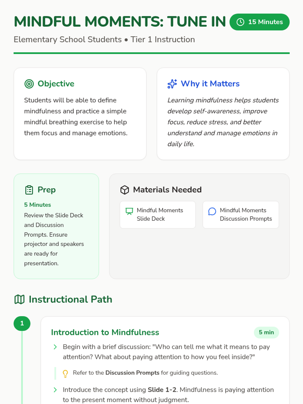 This 15-minute lesson introduces elementary school students to the concept of mindfulness and simple techniques to practice it. It helps students develop self-awareness and emotional regulation skills.