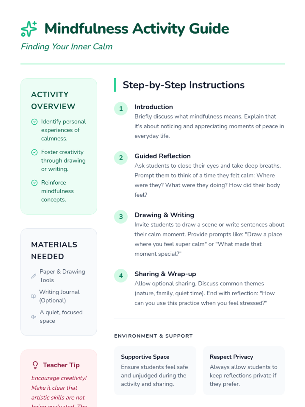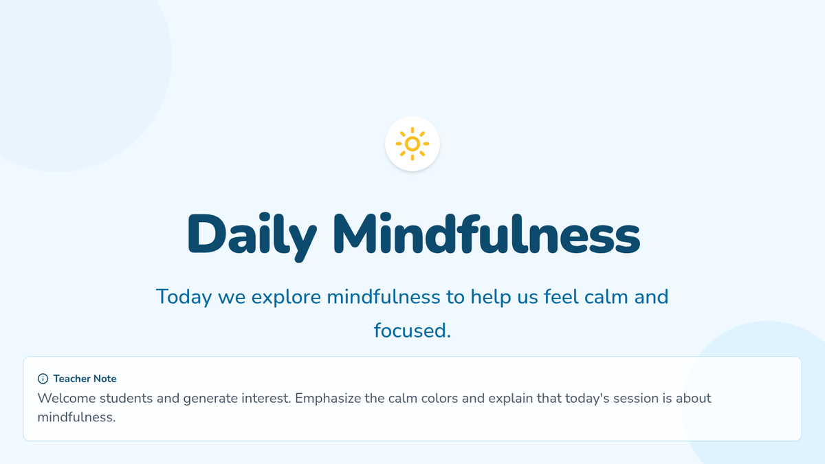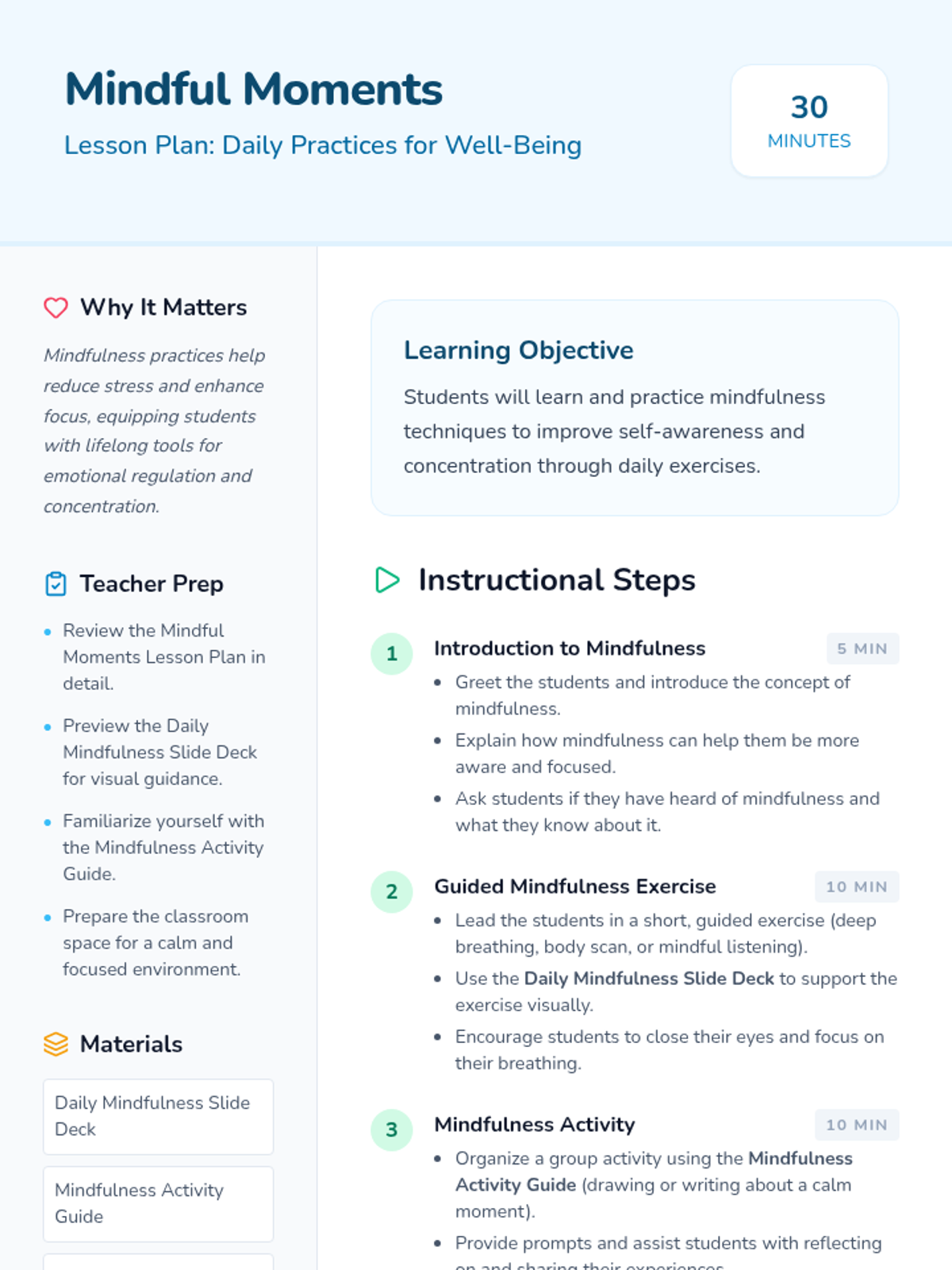 A foundational lesson introducing elementary students to mindfulness through deep breathing, guided reflection, and creative expression. Students learn to manage stress and improve focus with simple, daily practices.