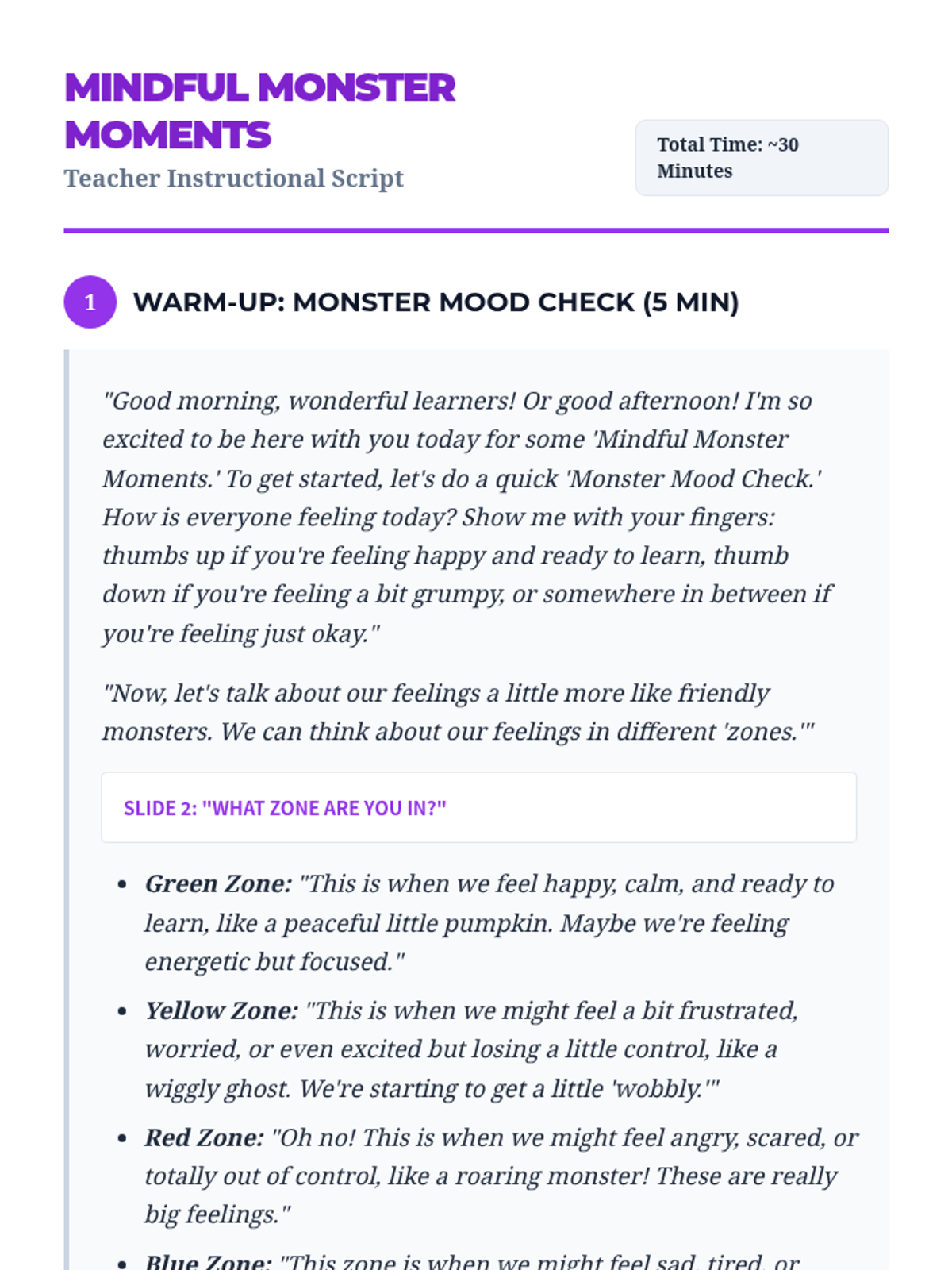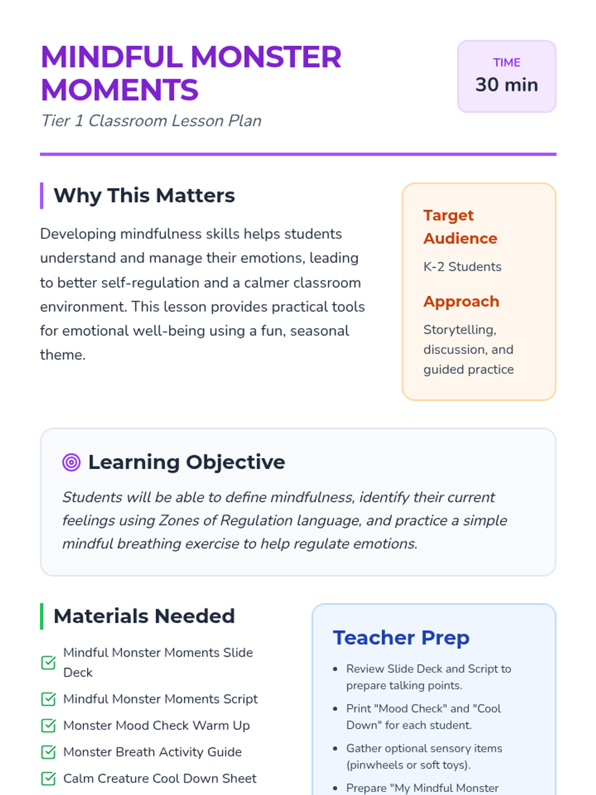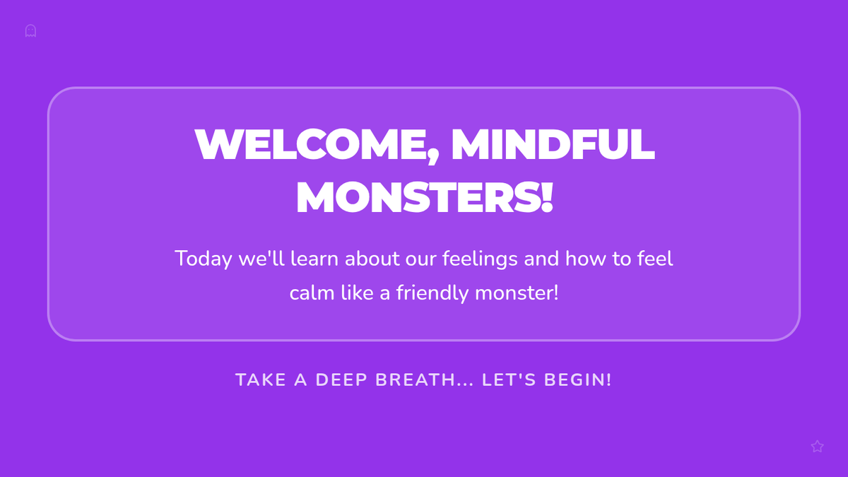 A Halloween-themed mindfulness lesson for K-2 students. Students learn about the Zones of Regulation and practice 'Monster Breaths' to manage their emotions and find their 'Green Zone.'