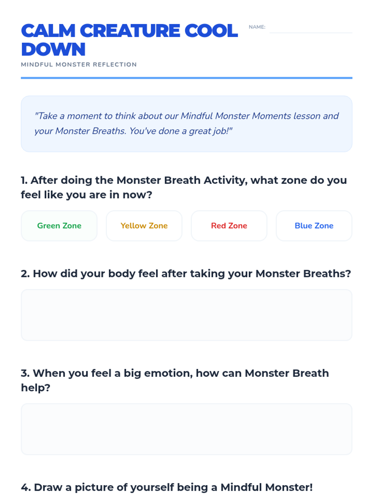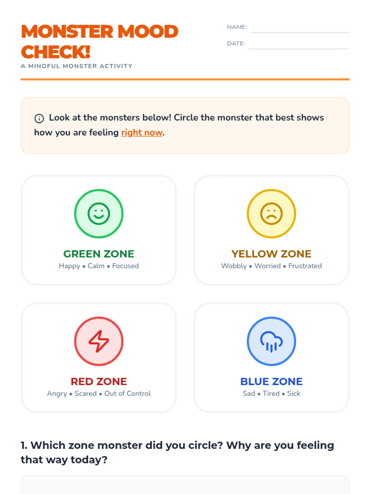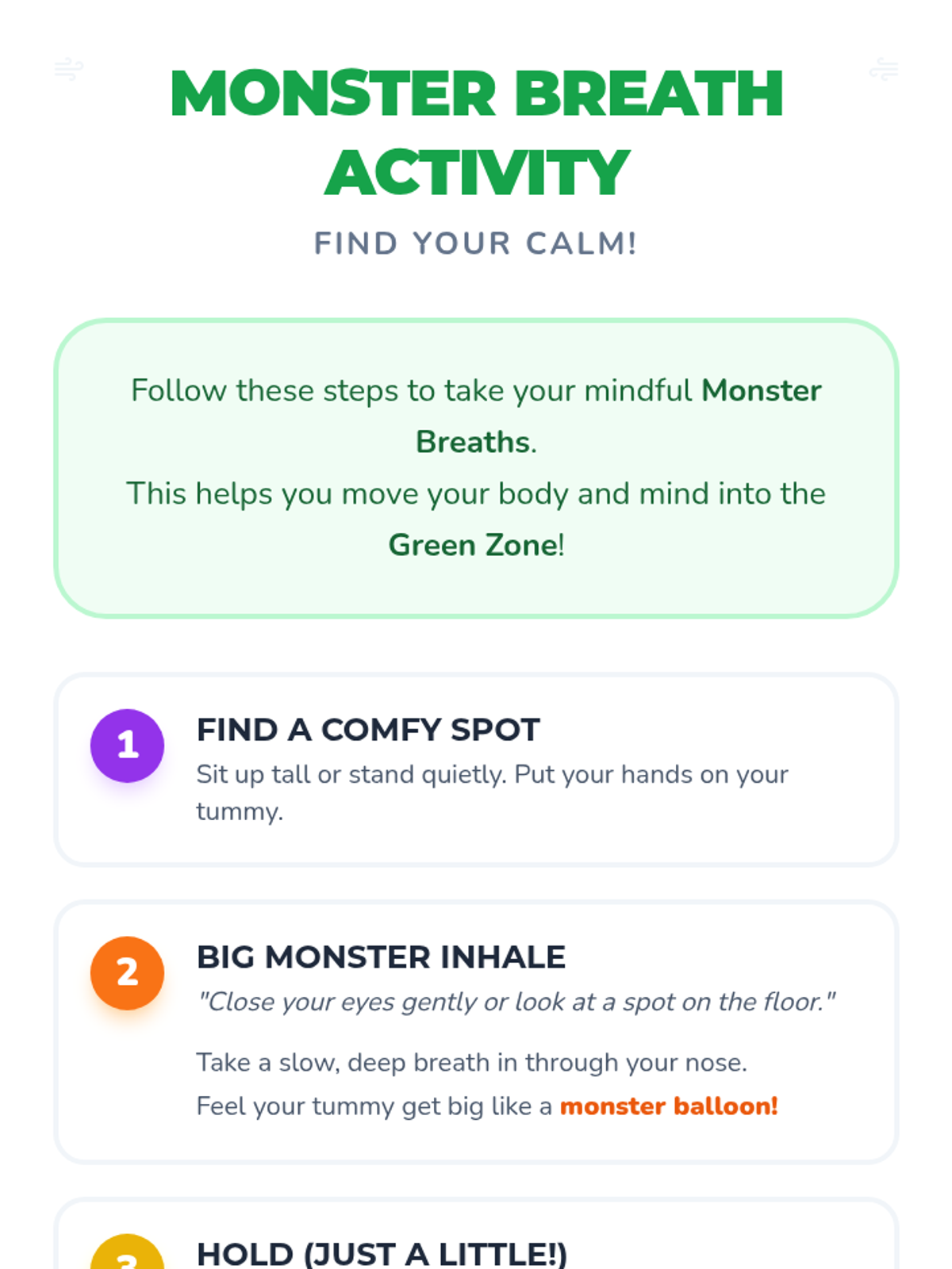A Halloween-themed mindfulness lesson for K-2 students. Students learn about the Zones of Regulation and practice 'Monster Breaths' to manage their emotions and find their 'Green Zone.'