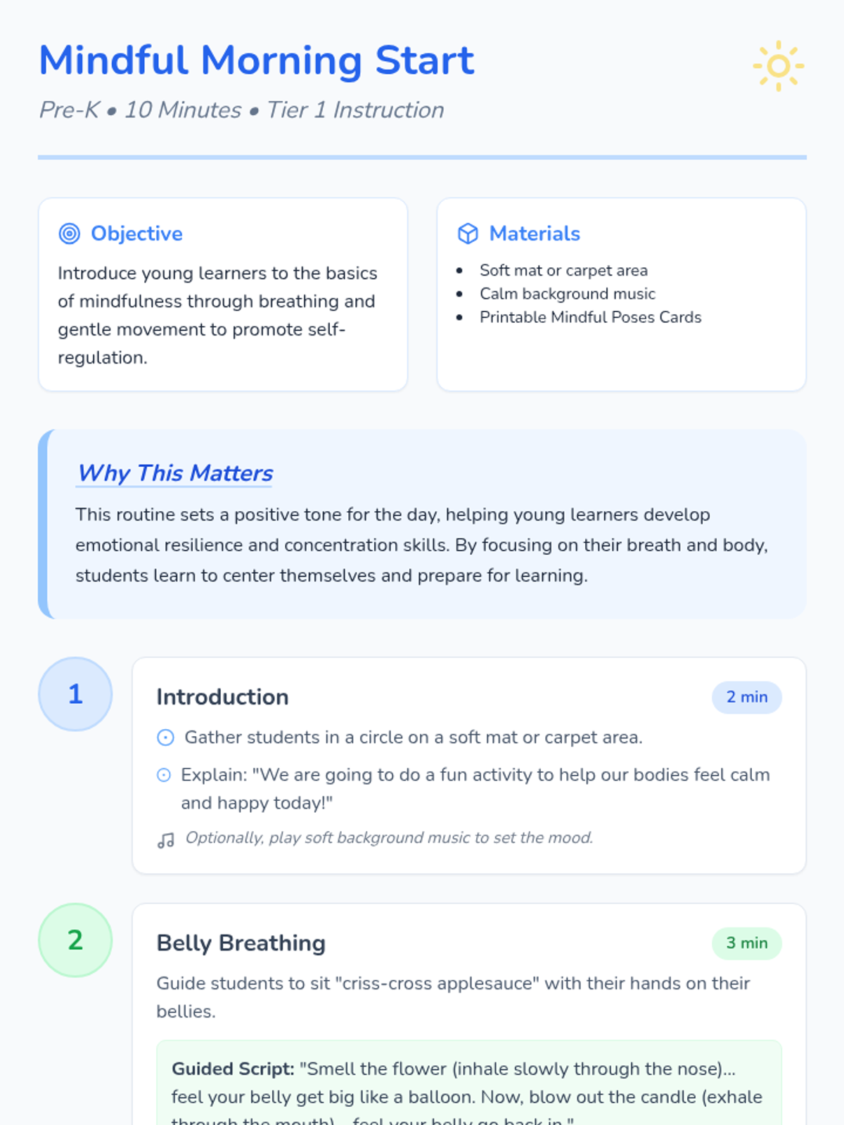 A gentle introduction to mindfulness for Pre-K students, featuring deep breathing and simple stretches to start the day with focus and calm.