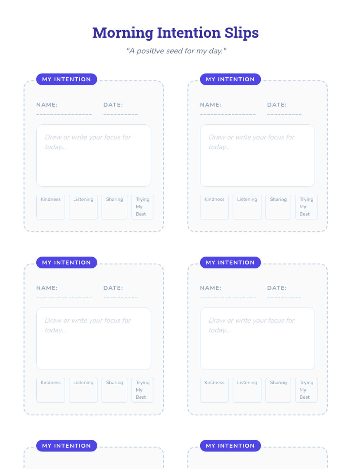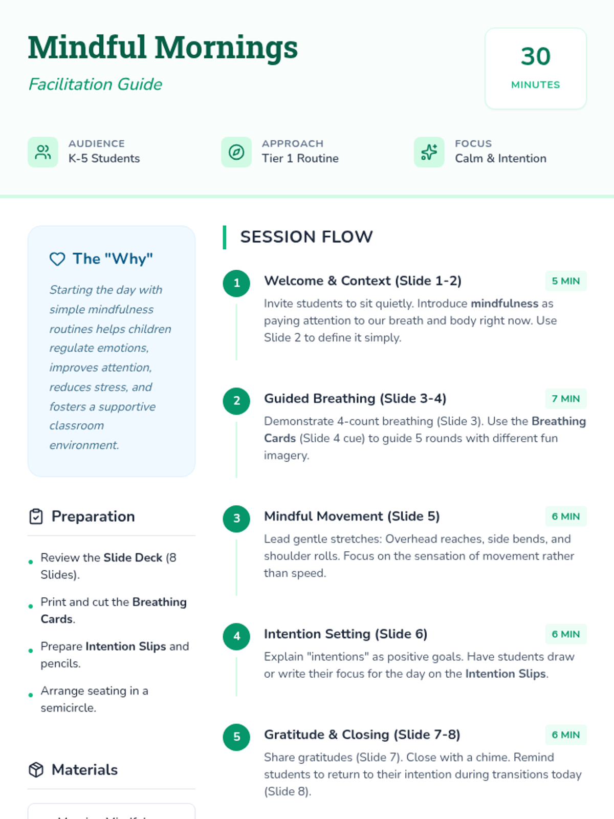 A 30-minute mindfulness lesson for K-5 students focused on morning routines, deep breathing, gentle movement, and intention-setting to start the day with focus and positivity.