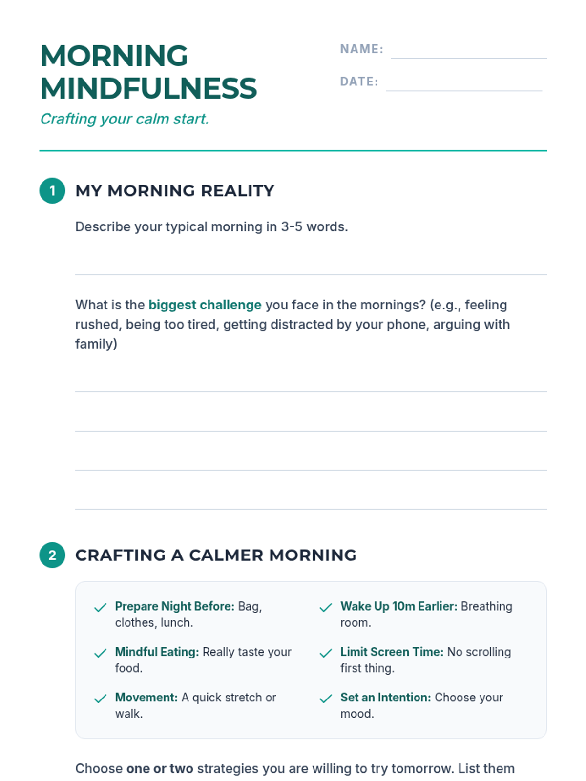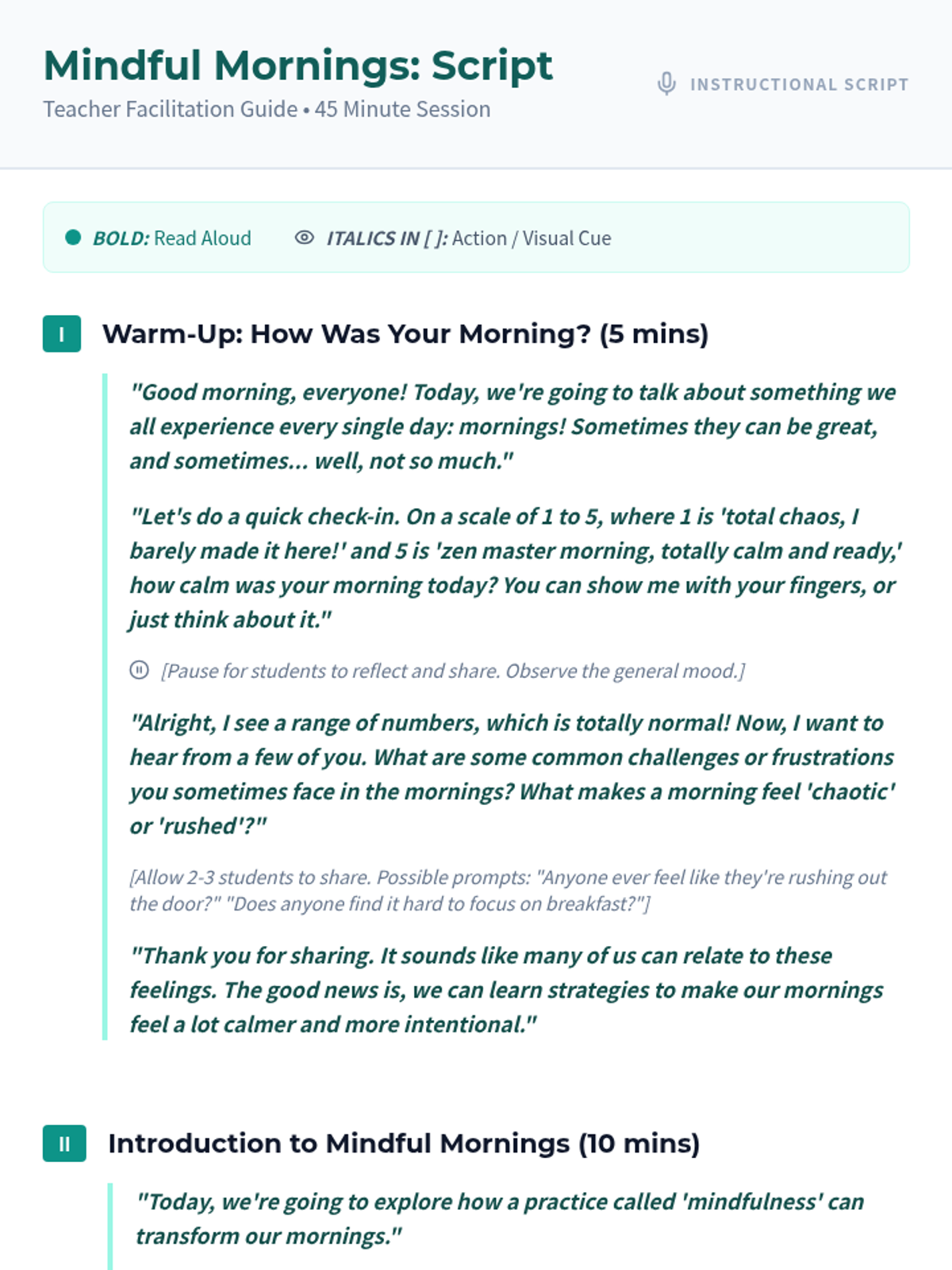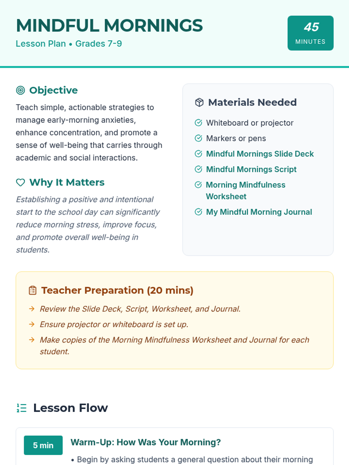 This lesson for 7th-9th graders helps students establish a positive and intentional start to their school days, reducing morning stress and improving focus through guided mindfulness and practical routine-building.