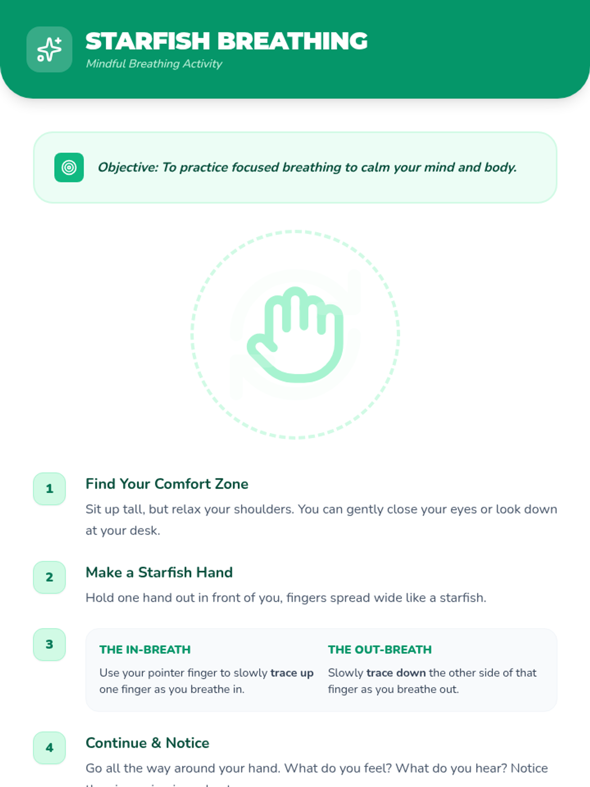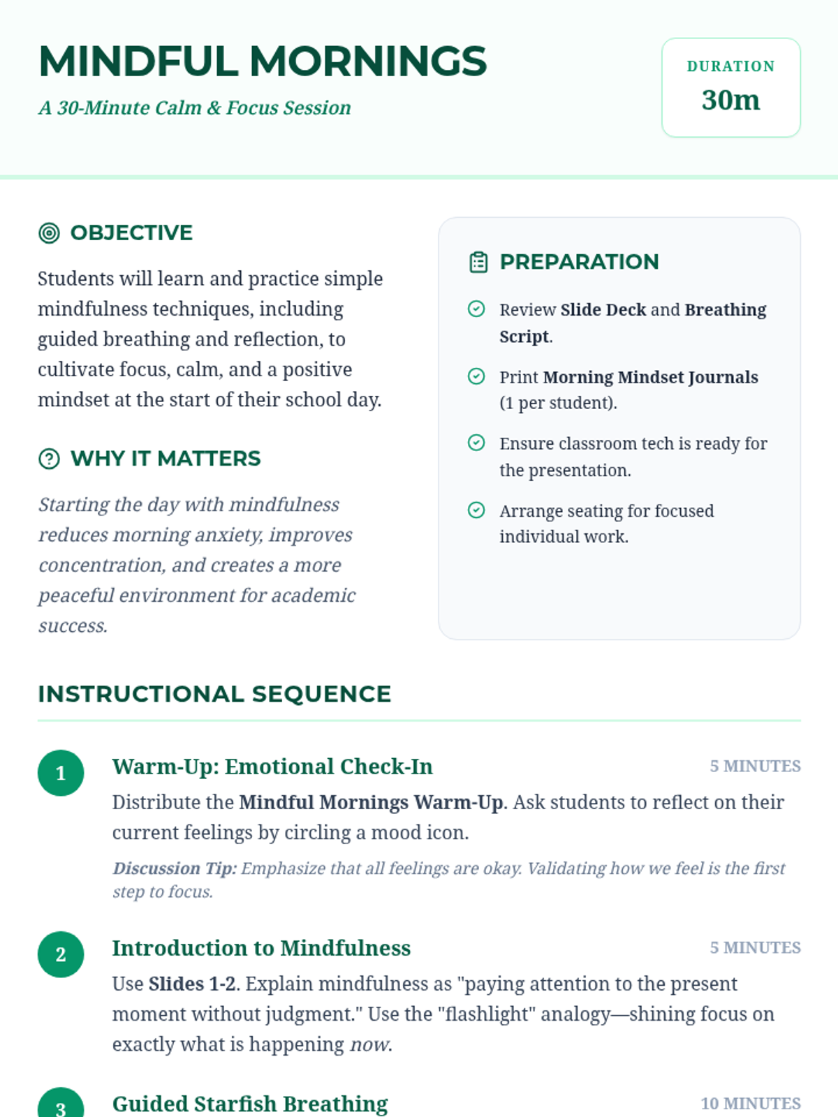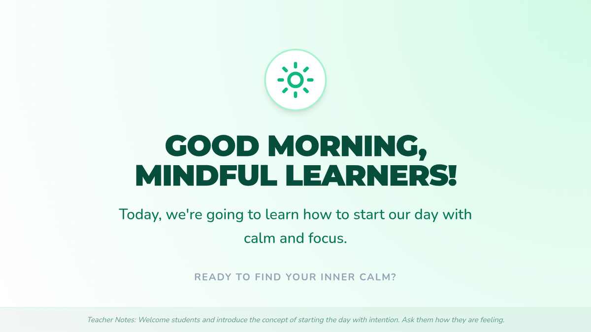 A 30-minute mindfulness session for 4th graders to start their day with focus and calm through breathing exercises and reflection.