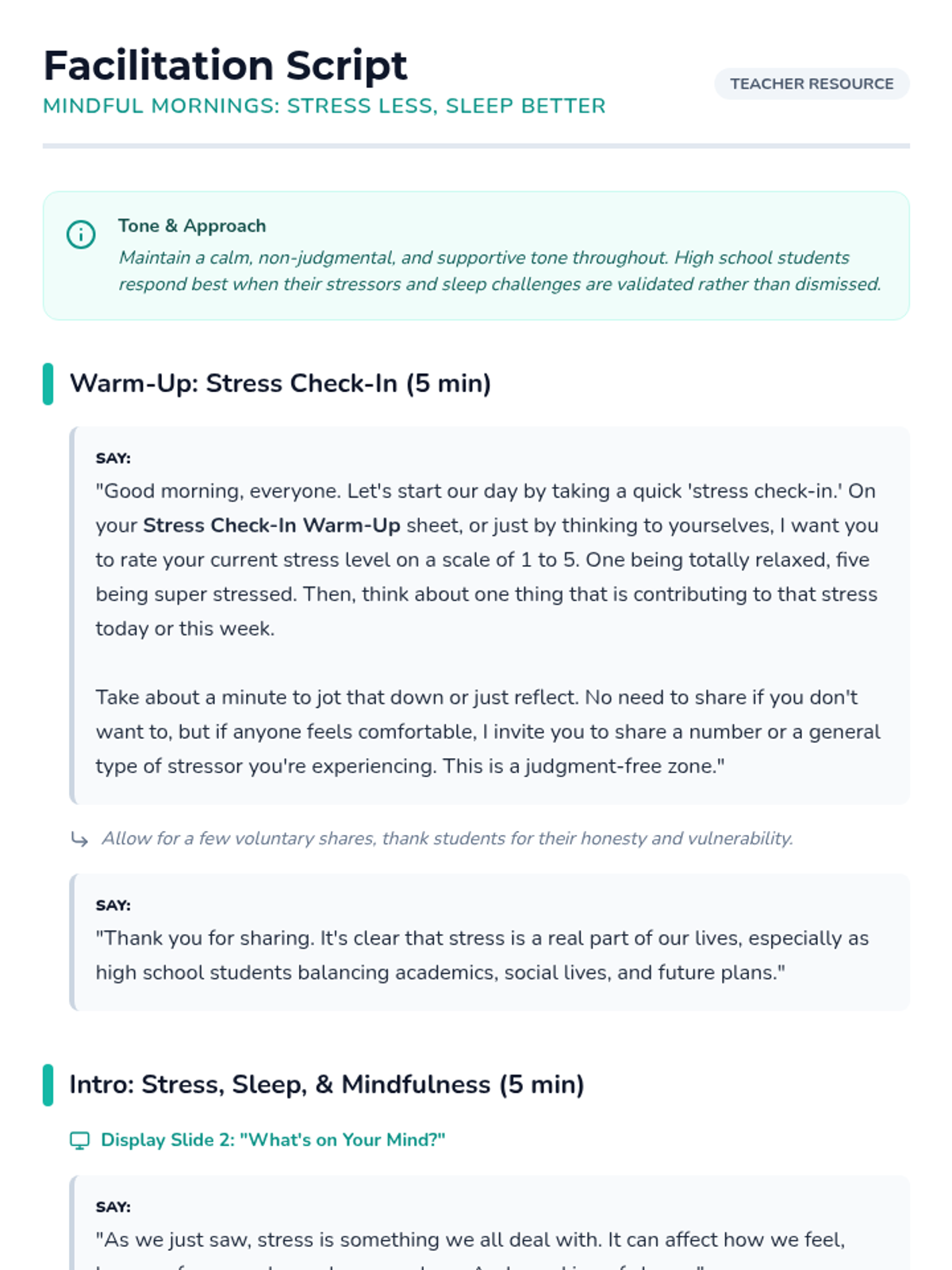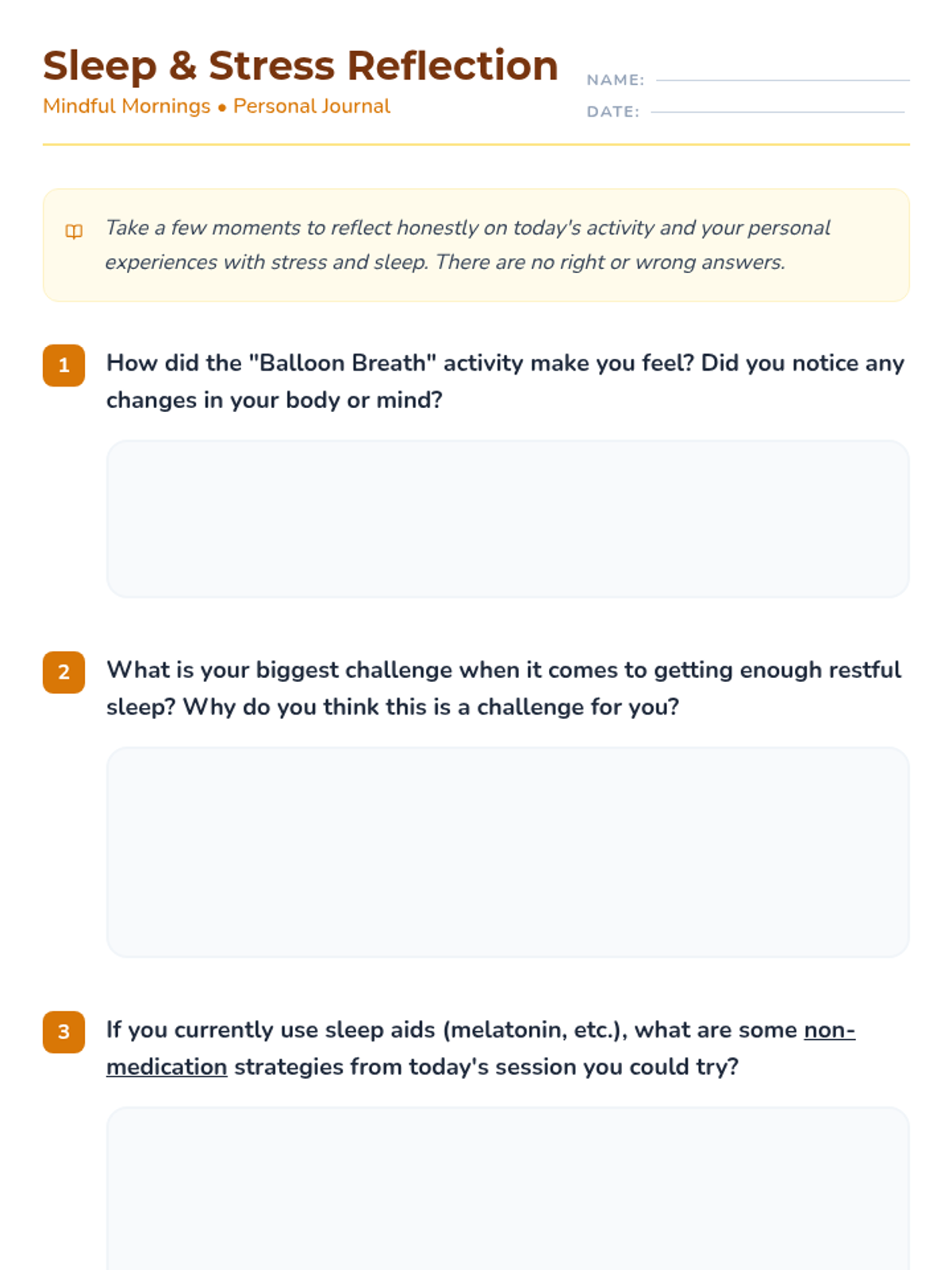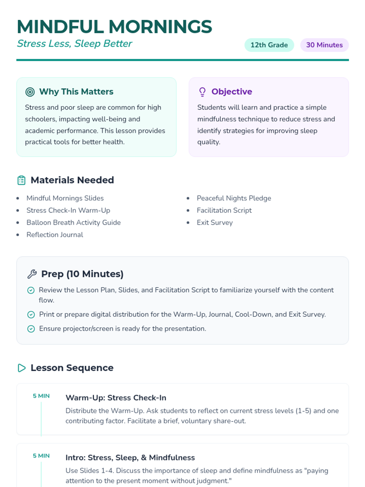 This lesson introduces 12th-grade students to mindfulness techniques for stress management and practical strategies for improving sleep quality. It includes guided breathing exercises, reflective journaling, and actionable sleep hygiene tips.