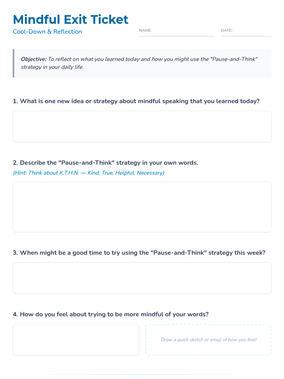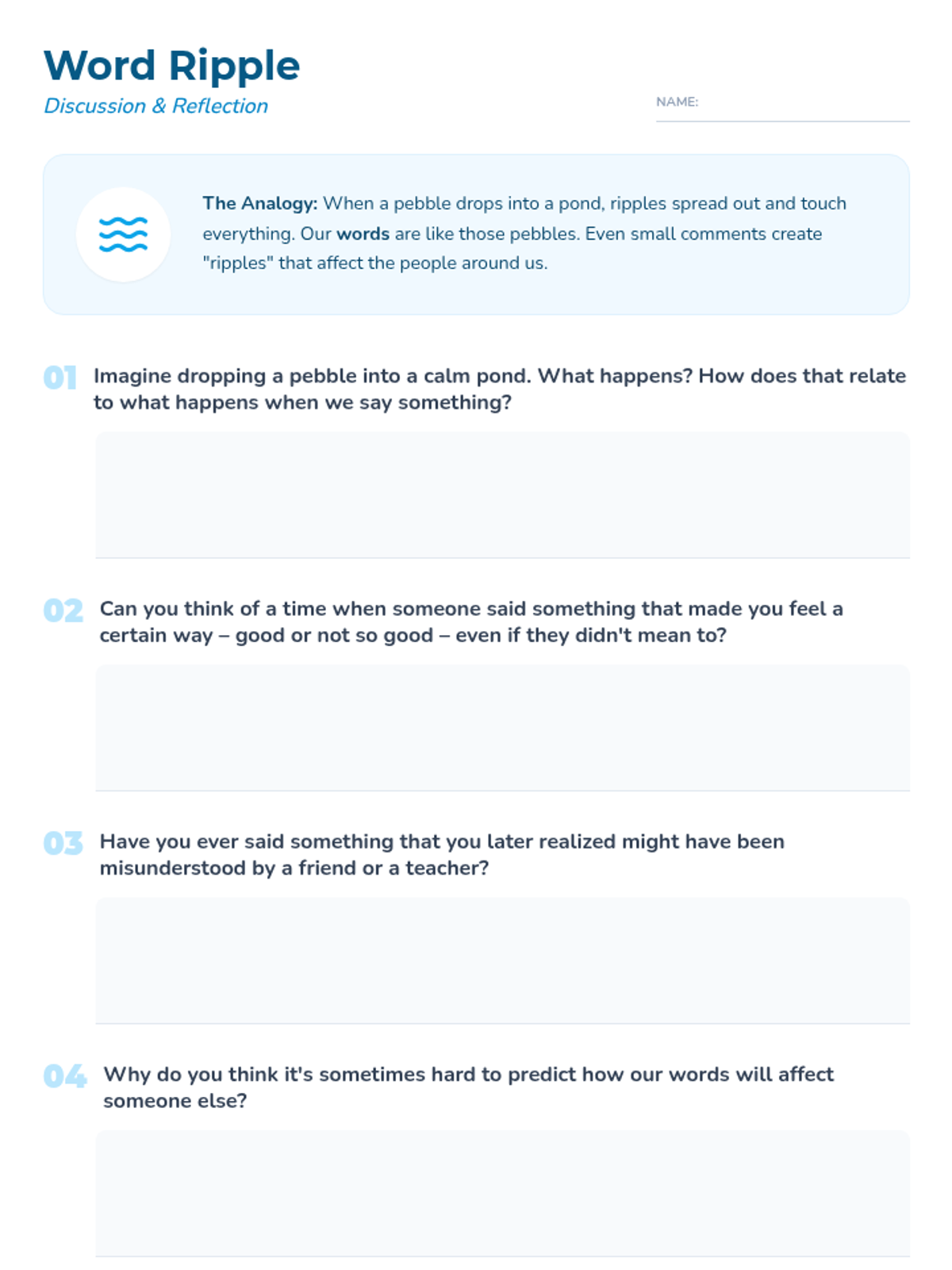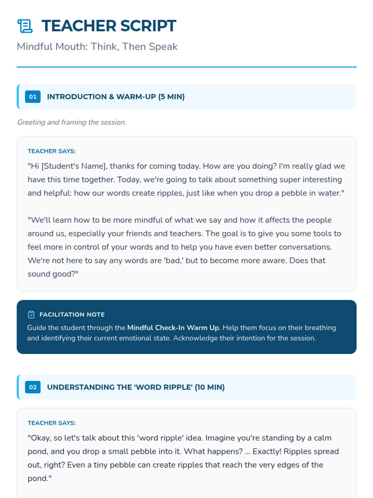 A 30-minute individual Tier 3 lesson for 8th-grade students focusing on verbal self-awareness and the 'Pause-and-Think' strategy. This lesson uses the 'Word Ripple' analogy to explore the impact of communication and provides practical tools for mindful speaking.