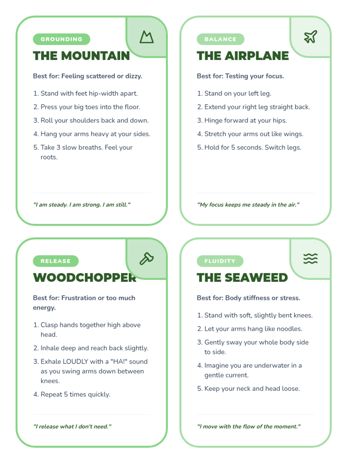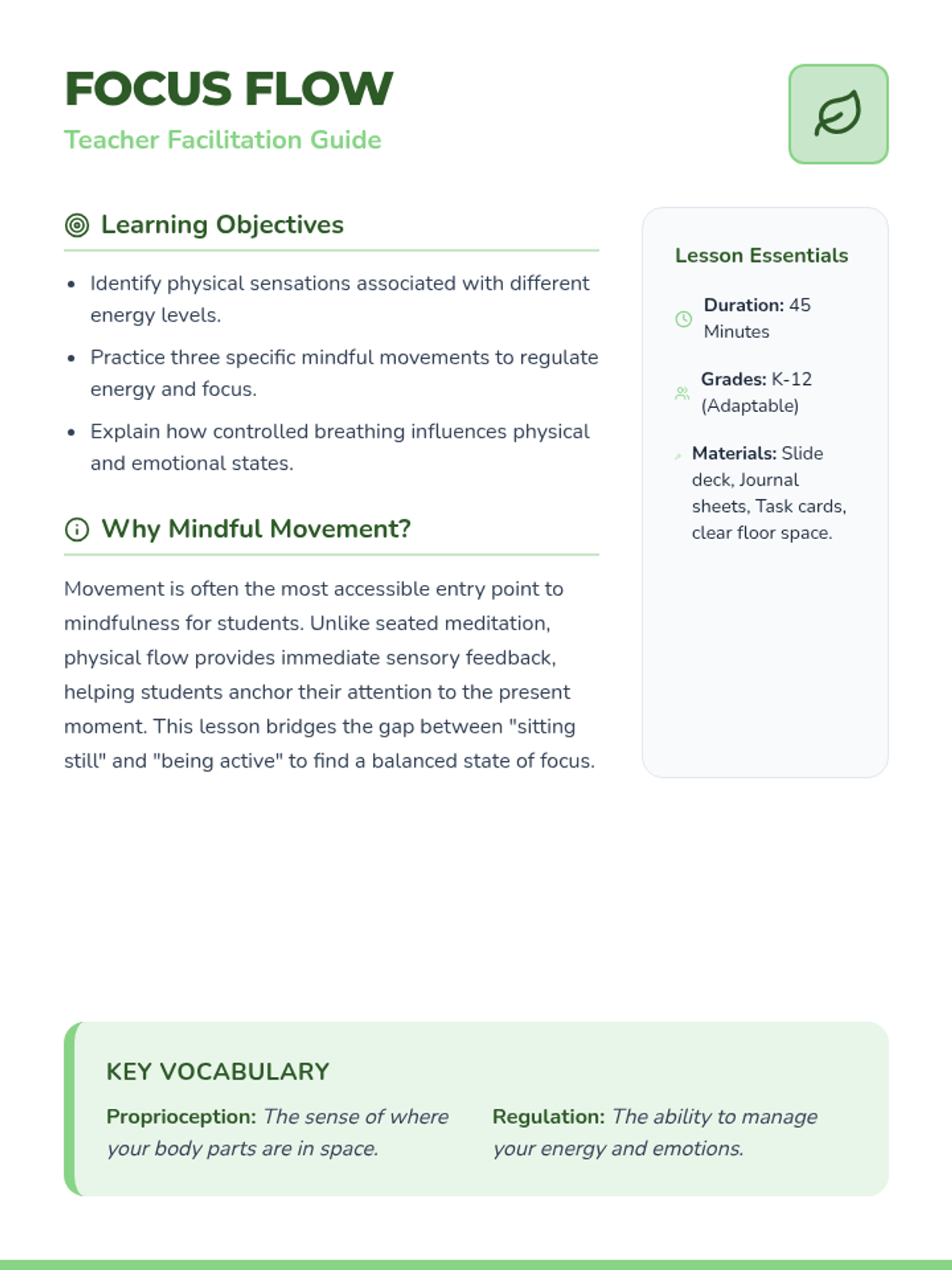 A lesson introducing students to accessible mindful movement exercises to improve focus, reduce stress, and re-energize. Students explore the connection between breath and physical sensation to build self-regulation skills.