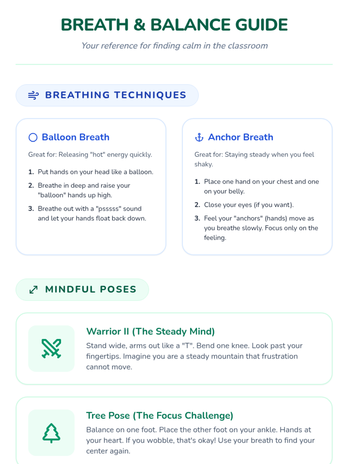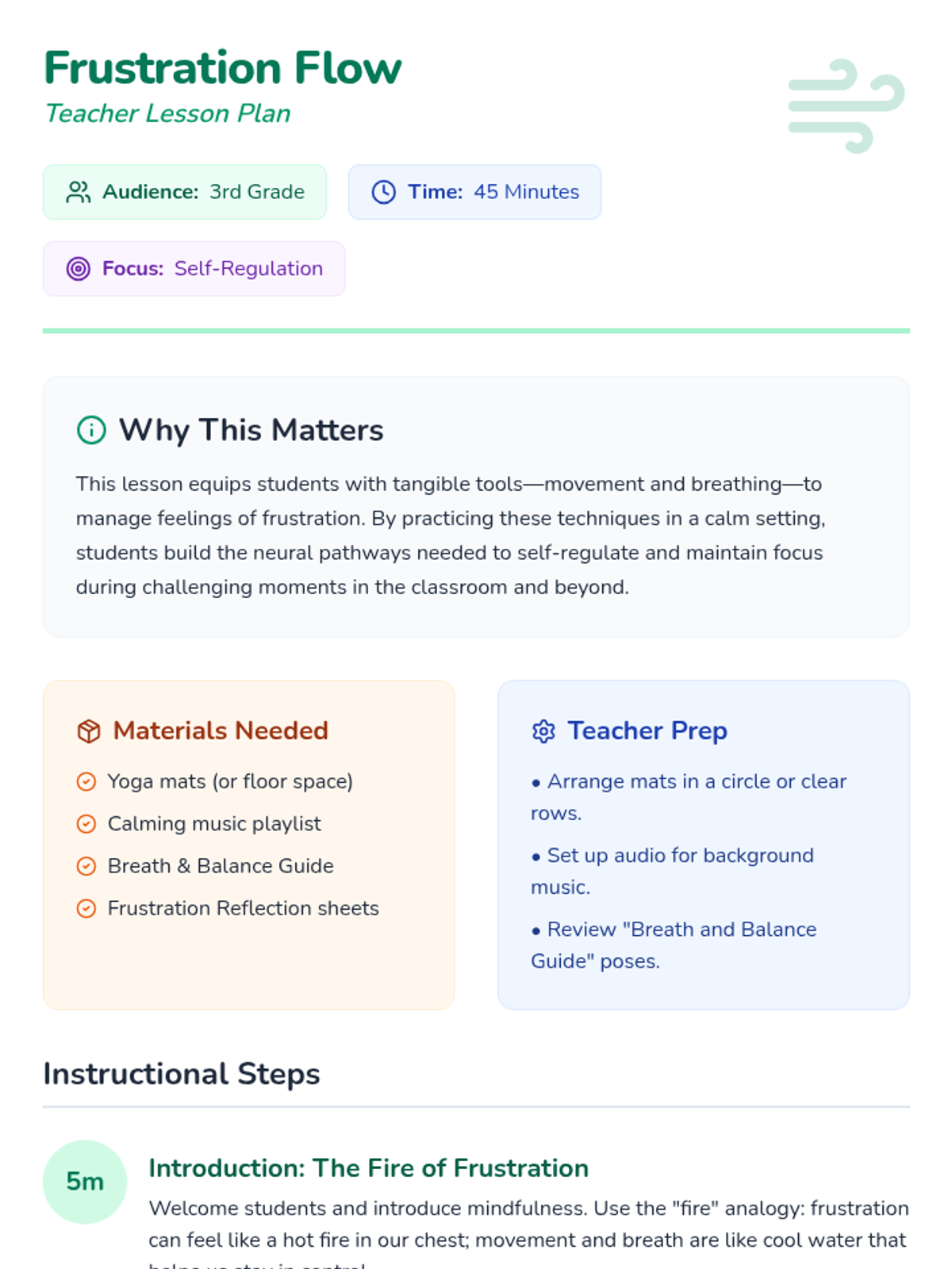 A lesson for 3rd-grade students focused on using yoga and mindful breathing to recognize and manage frustration, promoting emotional self-regulation and focus.