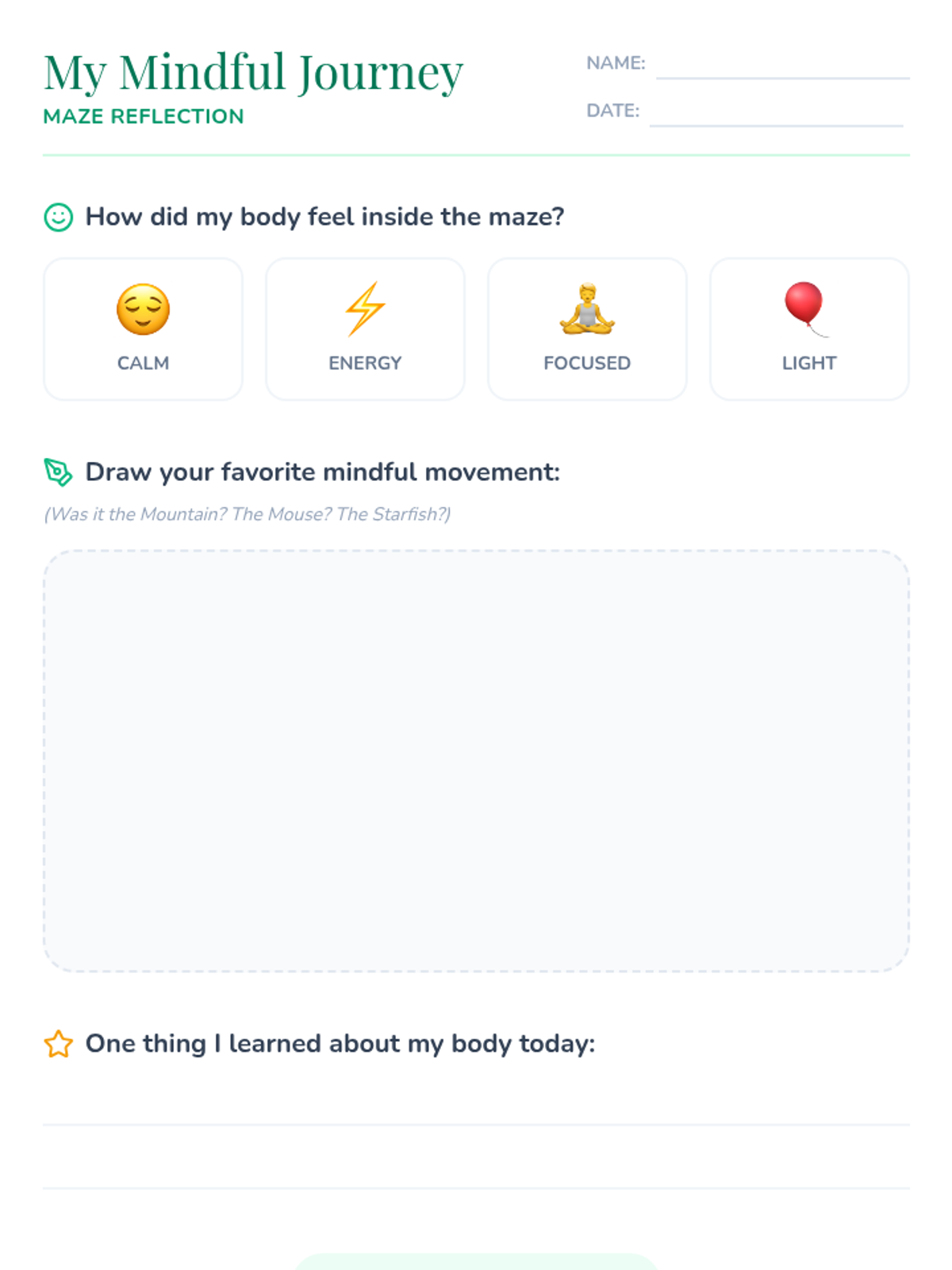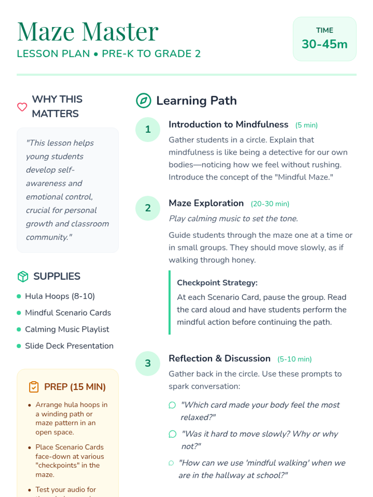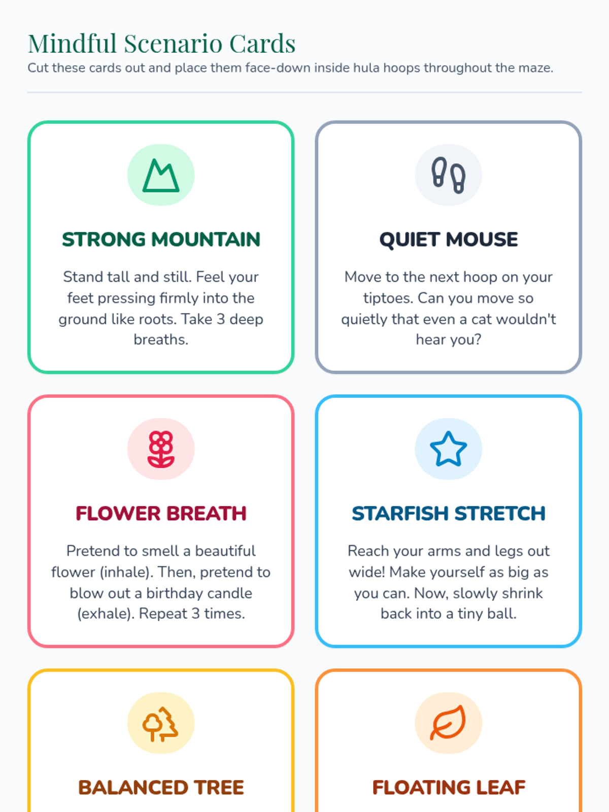 A playful lesson for Pre-K to Grade 2 students that combines physical activity with mindfulness. Students navigate a hula hoop maze while practicing body awareness and emotional regulation through specific movement scenarios.