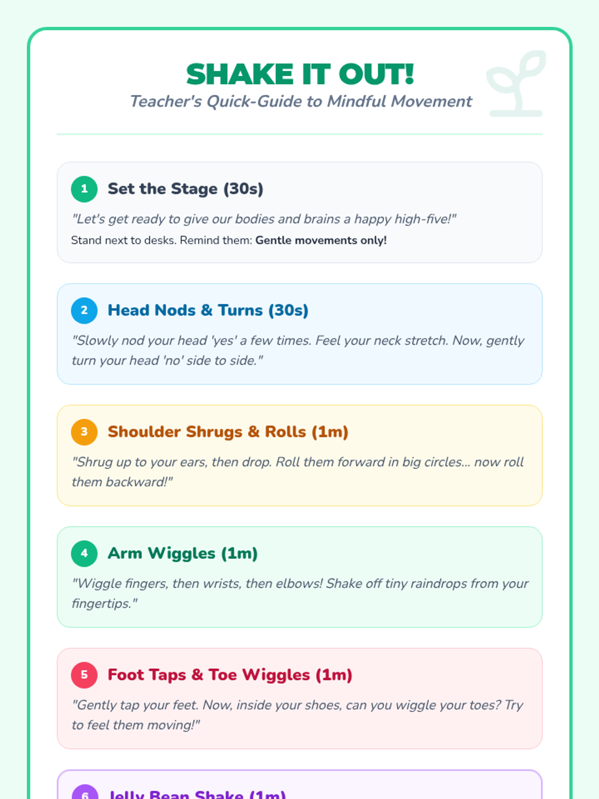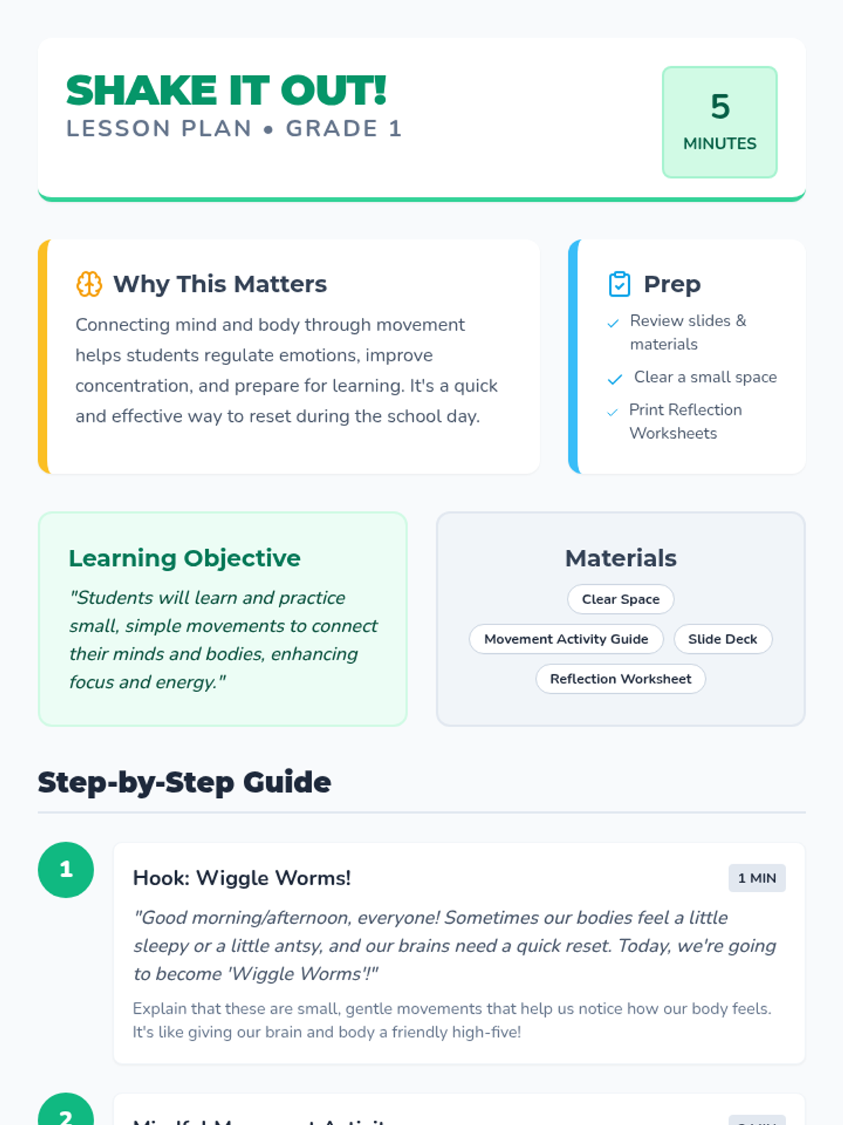 A quick 5-minute movement break for first graders to connect mind and body through gentle wiggle exercises. Students practice focus and self-regulation while becoming 'Wiggle Worms'.