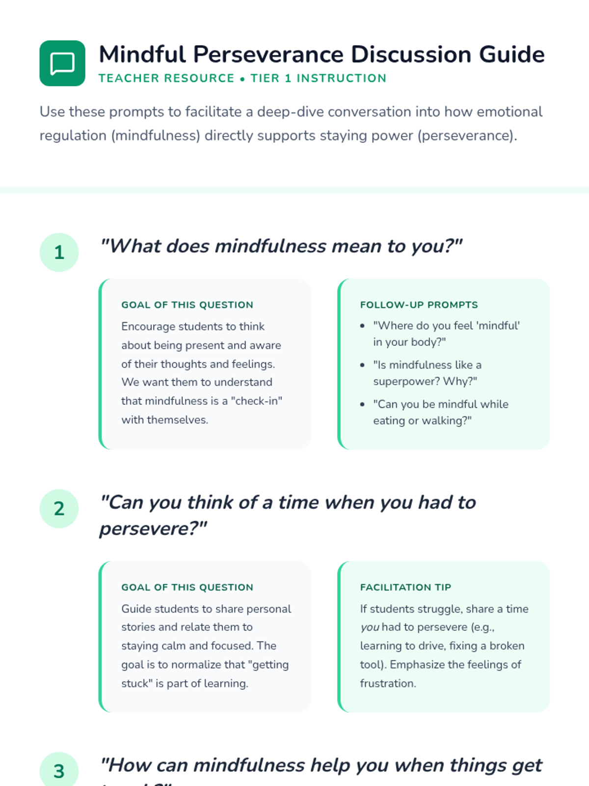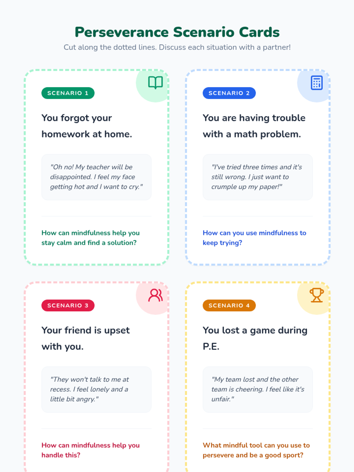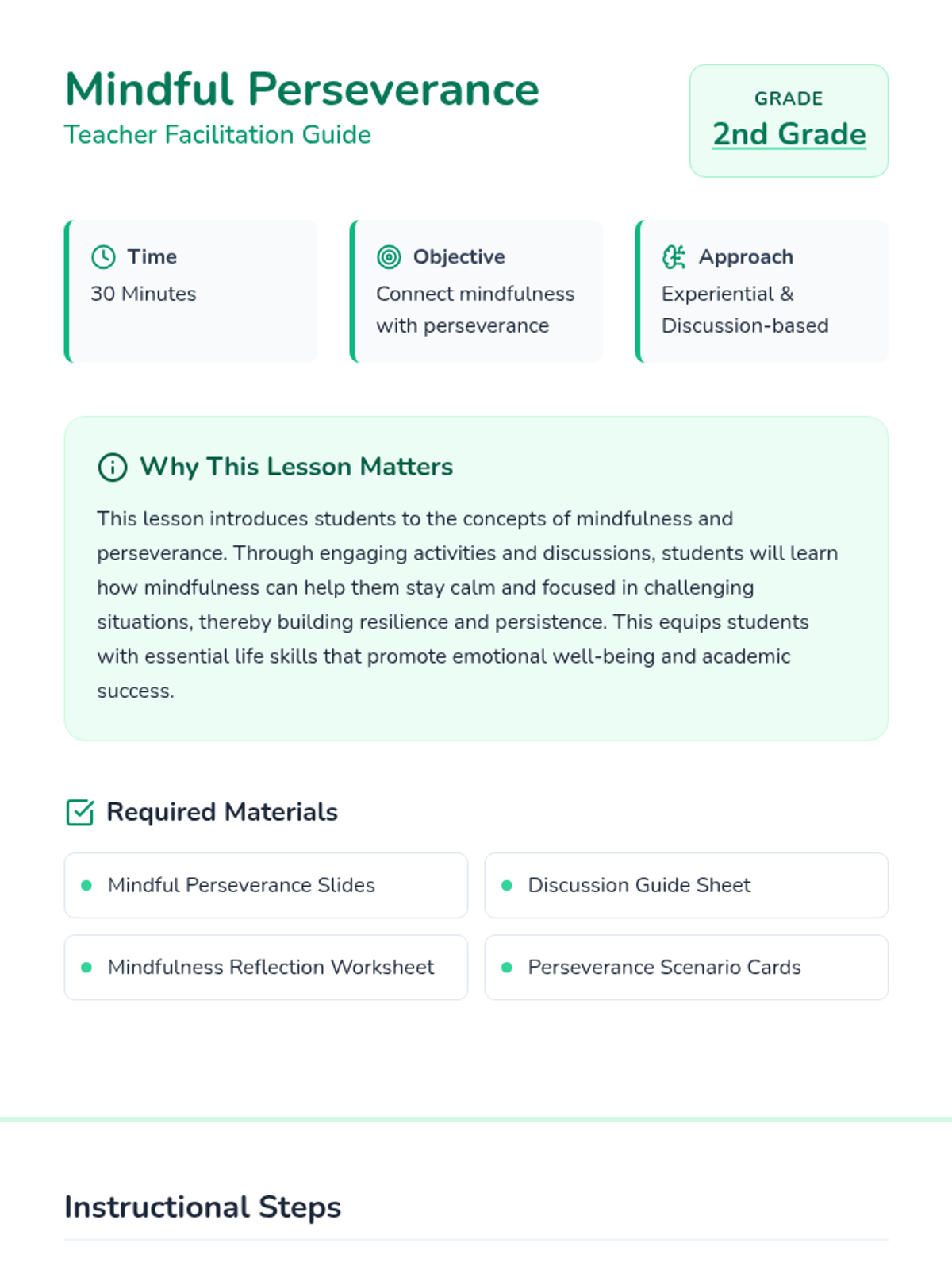 A 2nd-grade lesson connecting mindfulness with perseverance, helping students build resilience through breathing exercises and scenario-based discussions.