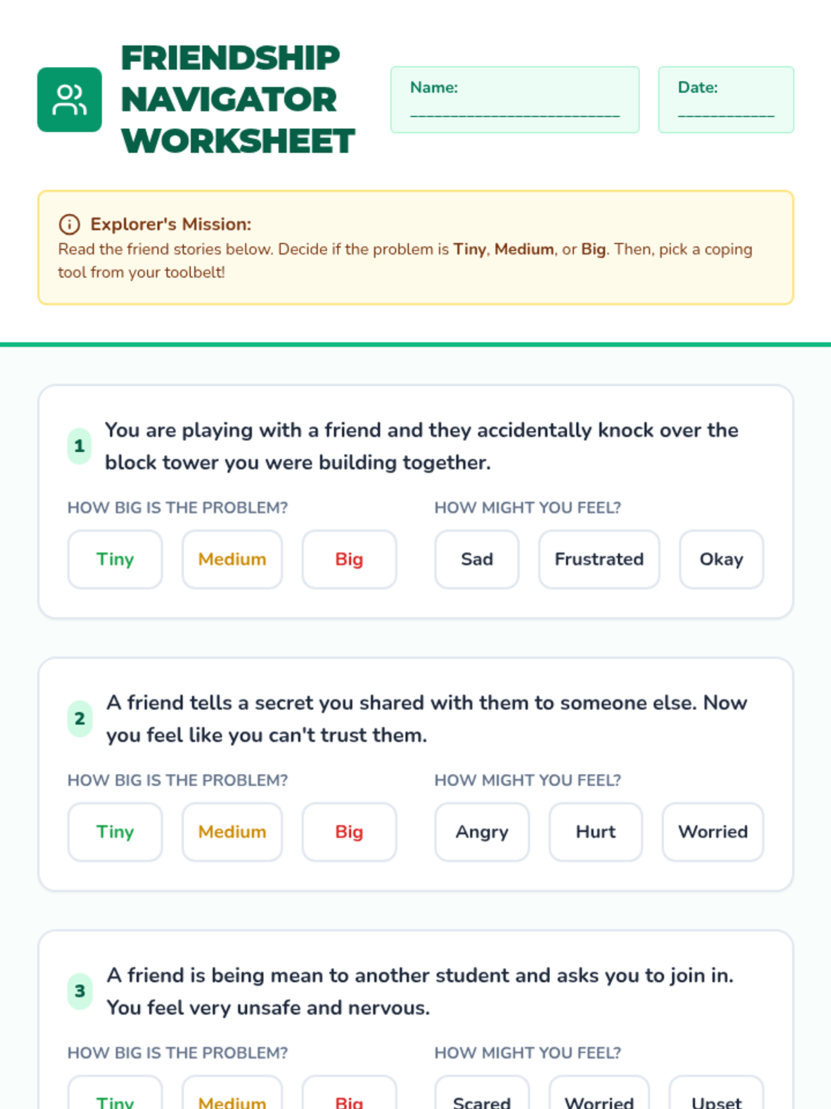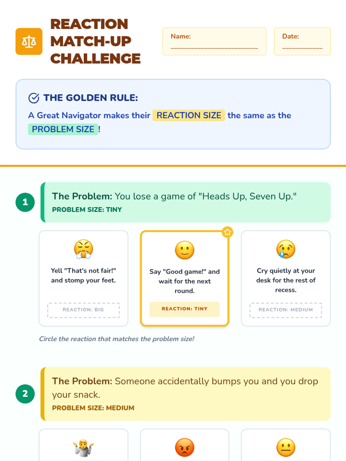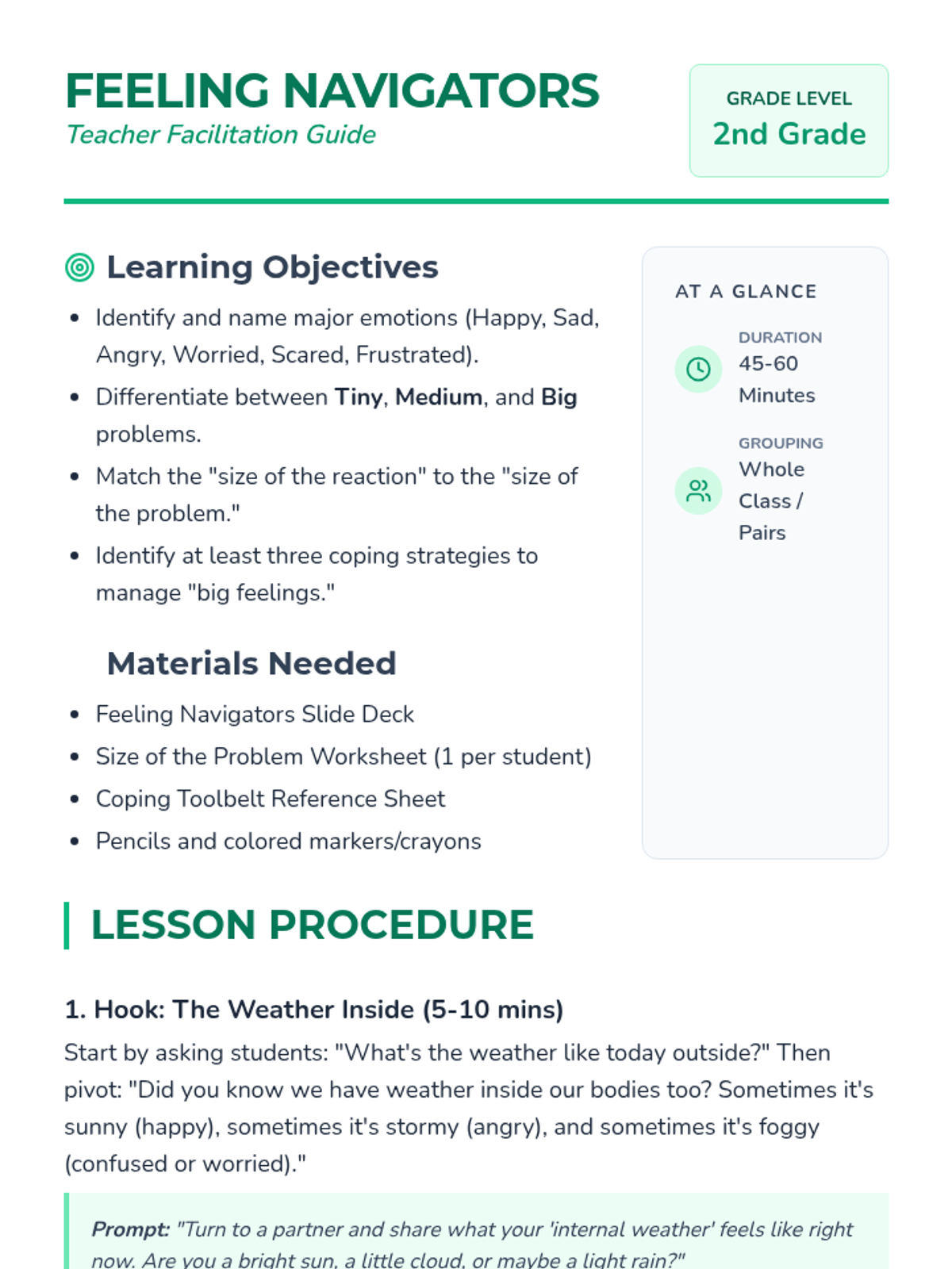 A comprehensive lesson for 2nd graders to identify 'big feelings,' categorize the size of problems from tiny glitches to big emergencies, and select appropriate coping skills. Students will learn to match their emotional reaction to the size of the problem using a navigator-themed approach.