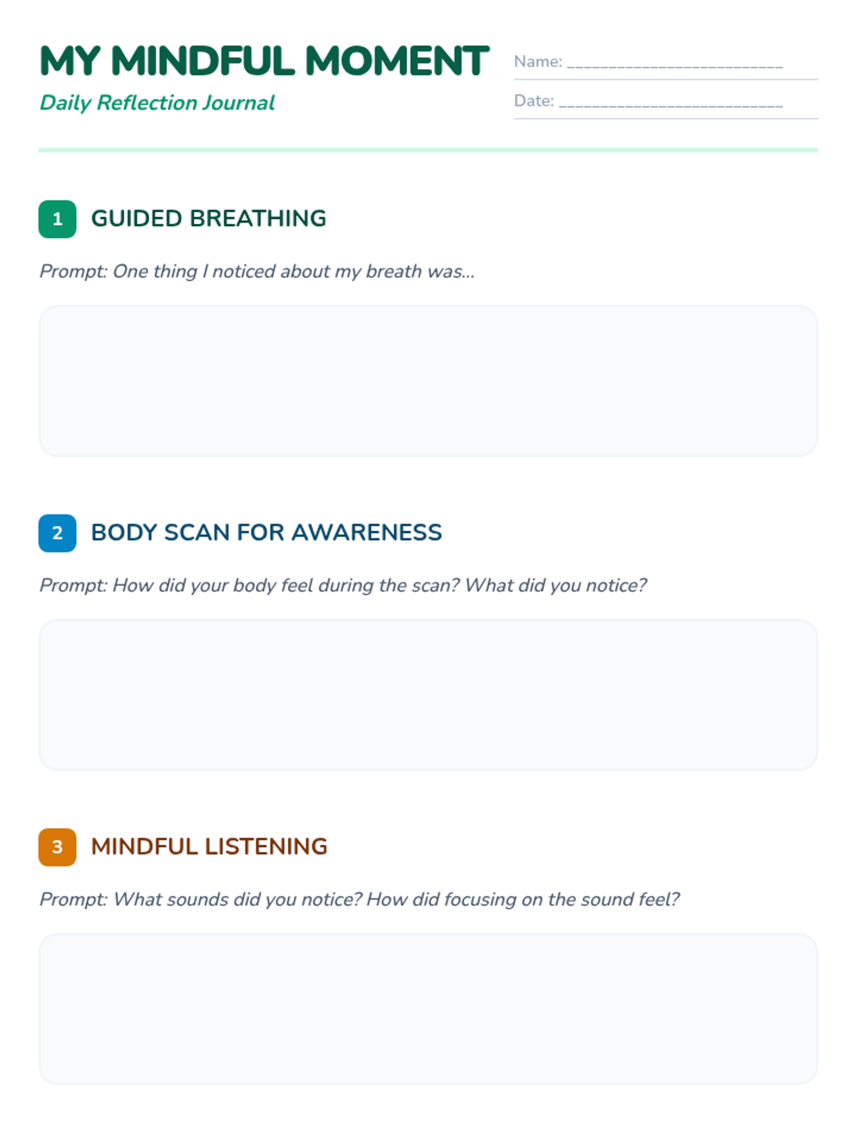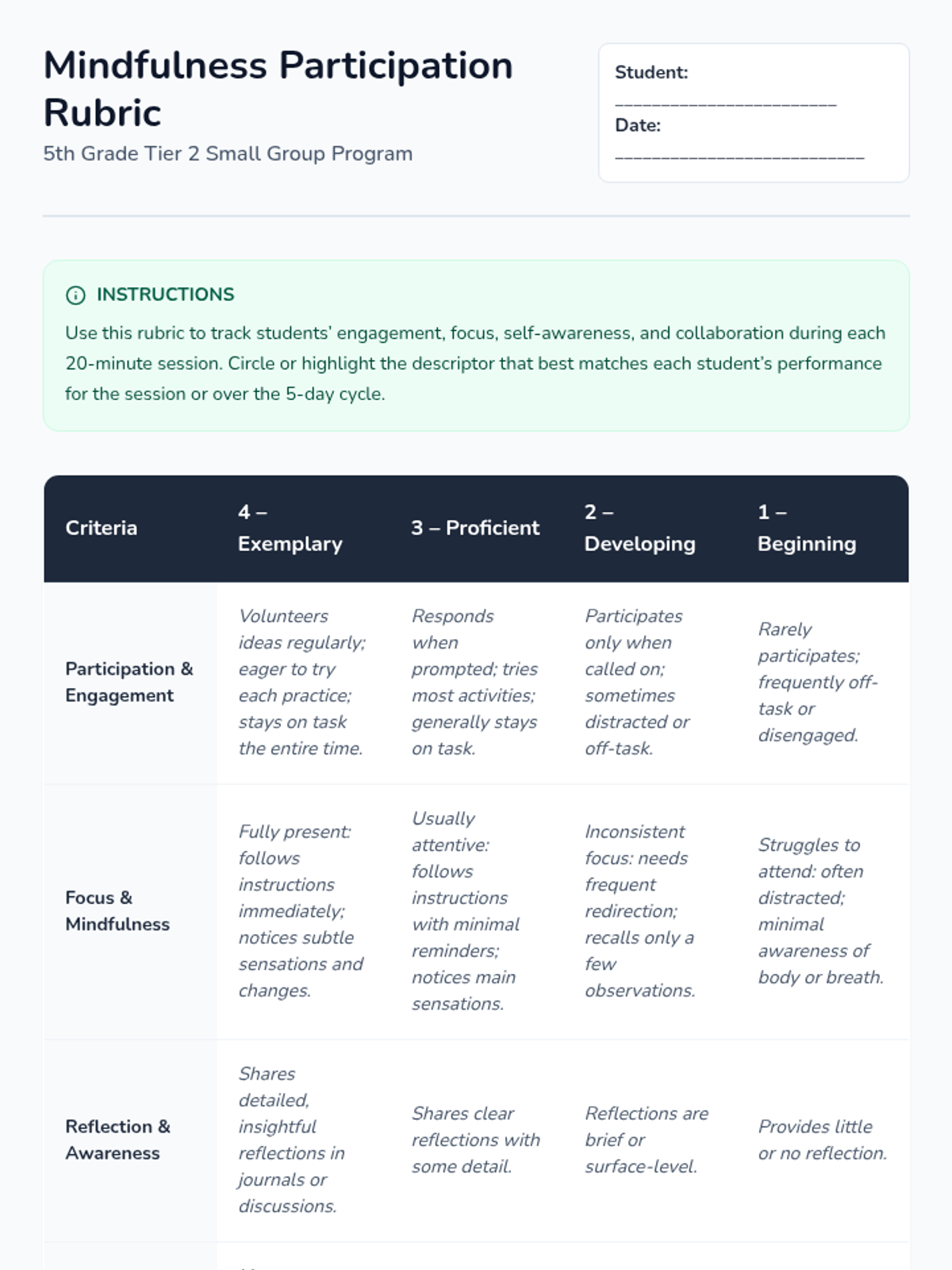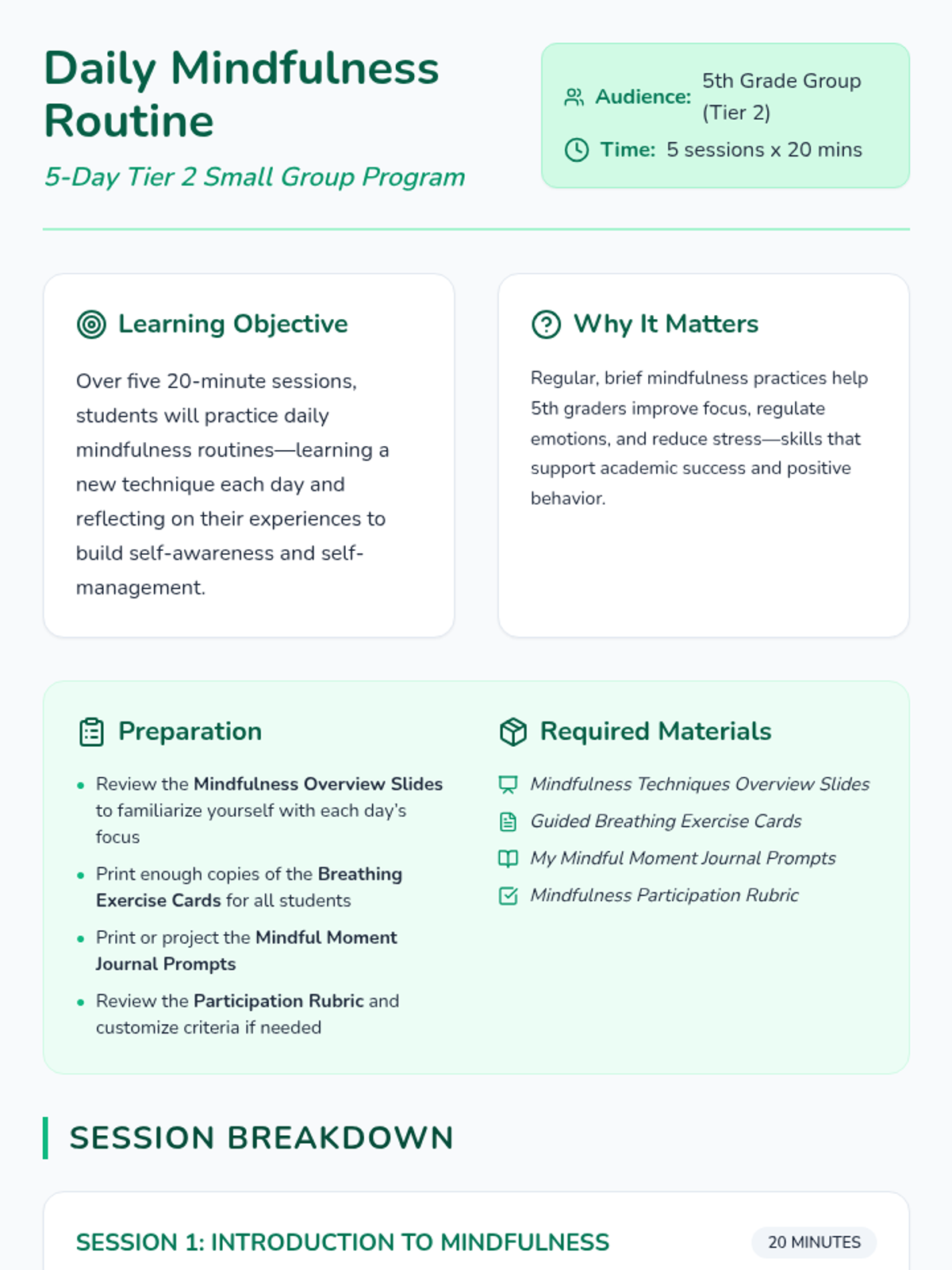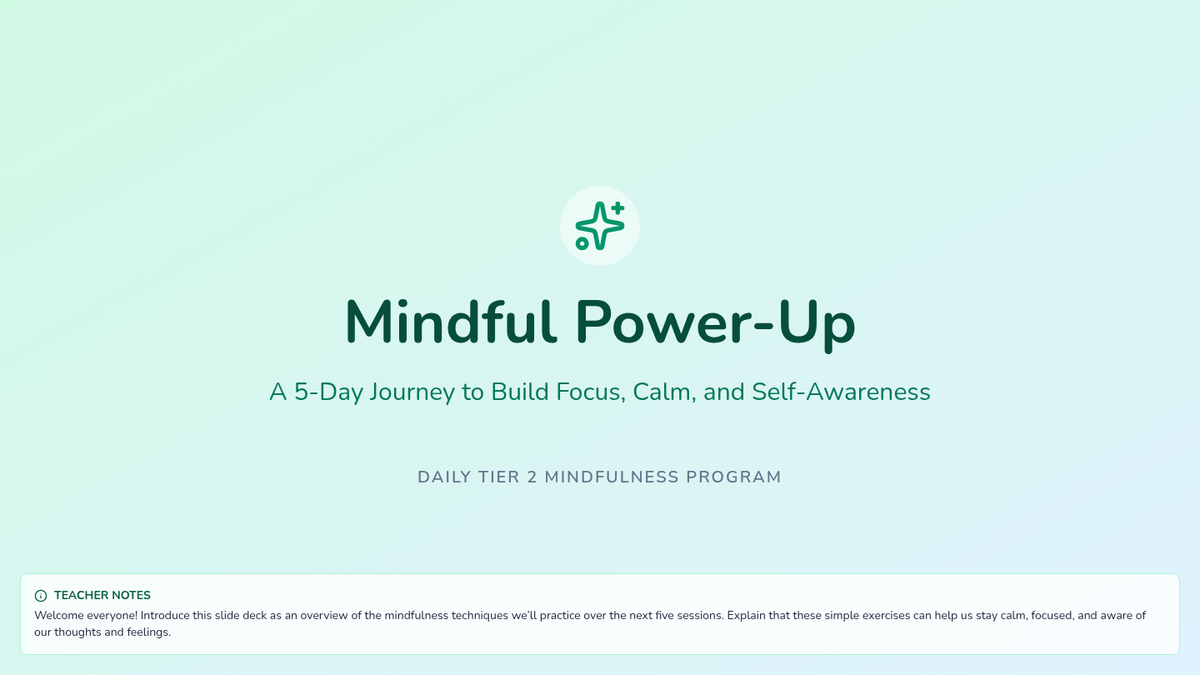 A 5-day series of 20-minute mindfulness practices designed to build self-awareness and emotional regulation in 5th grade students.