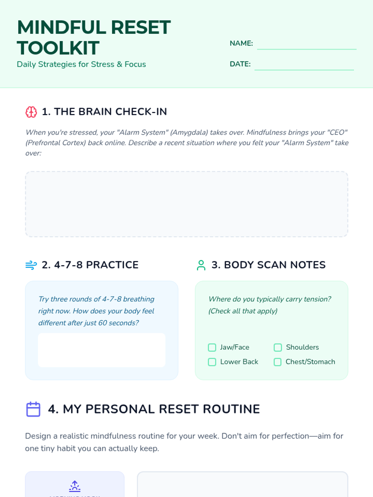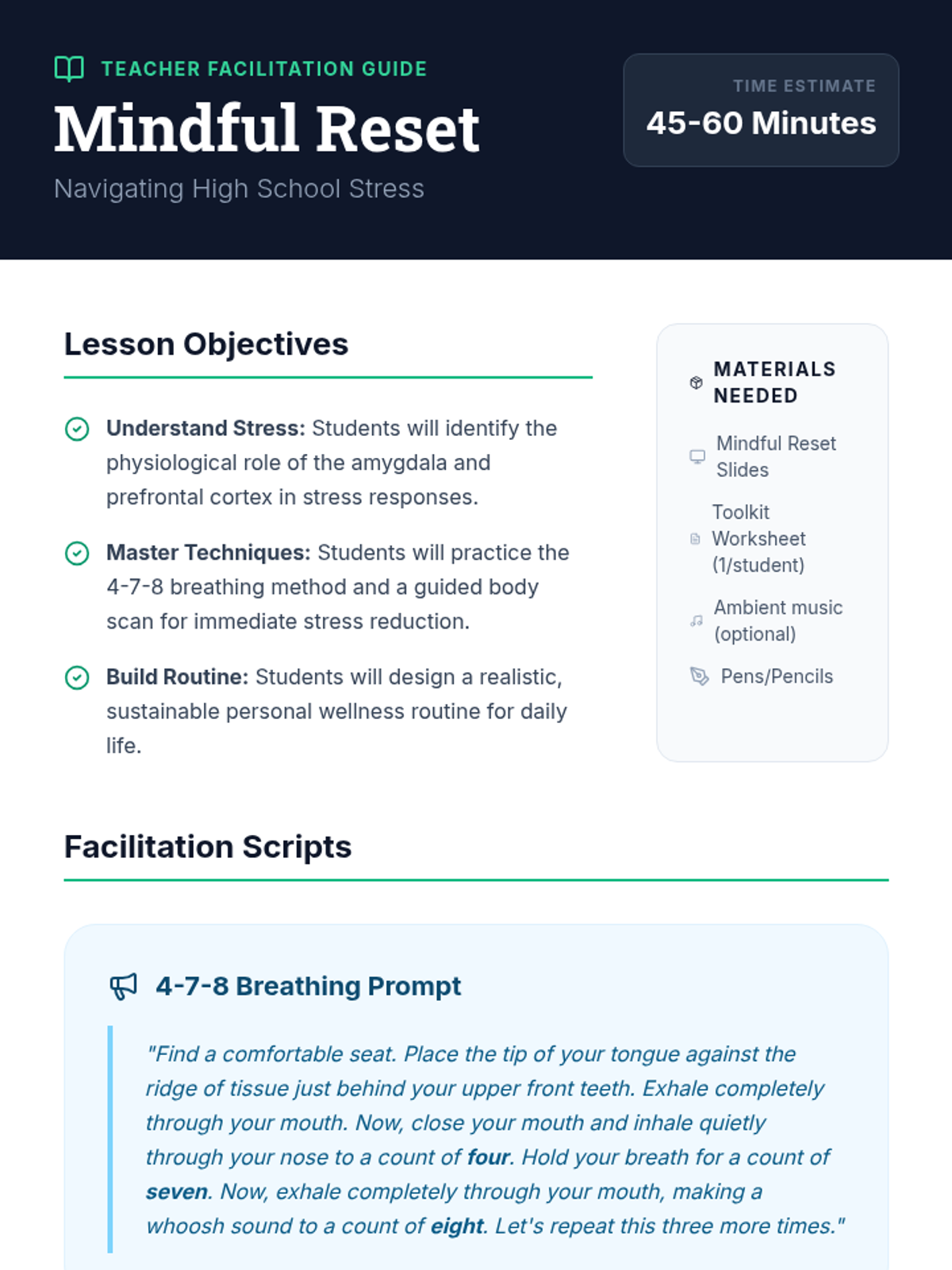 A practical introduction to mindfulness and stress management for high schoolers, focusing on immediate techniques like body scans and building long-term wellness habits.