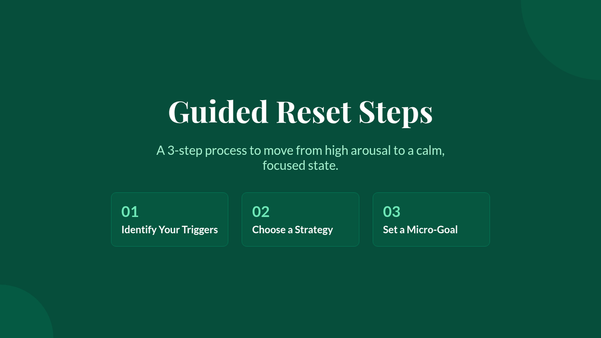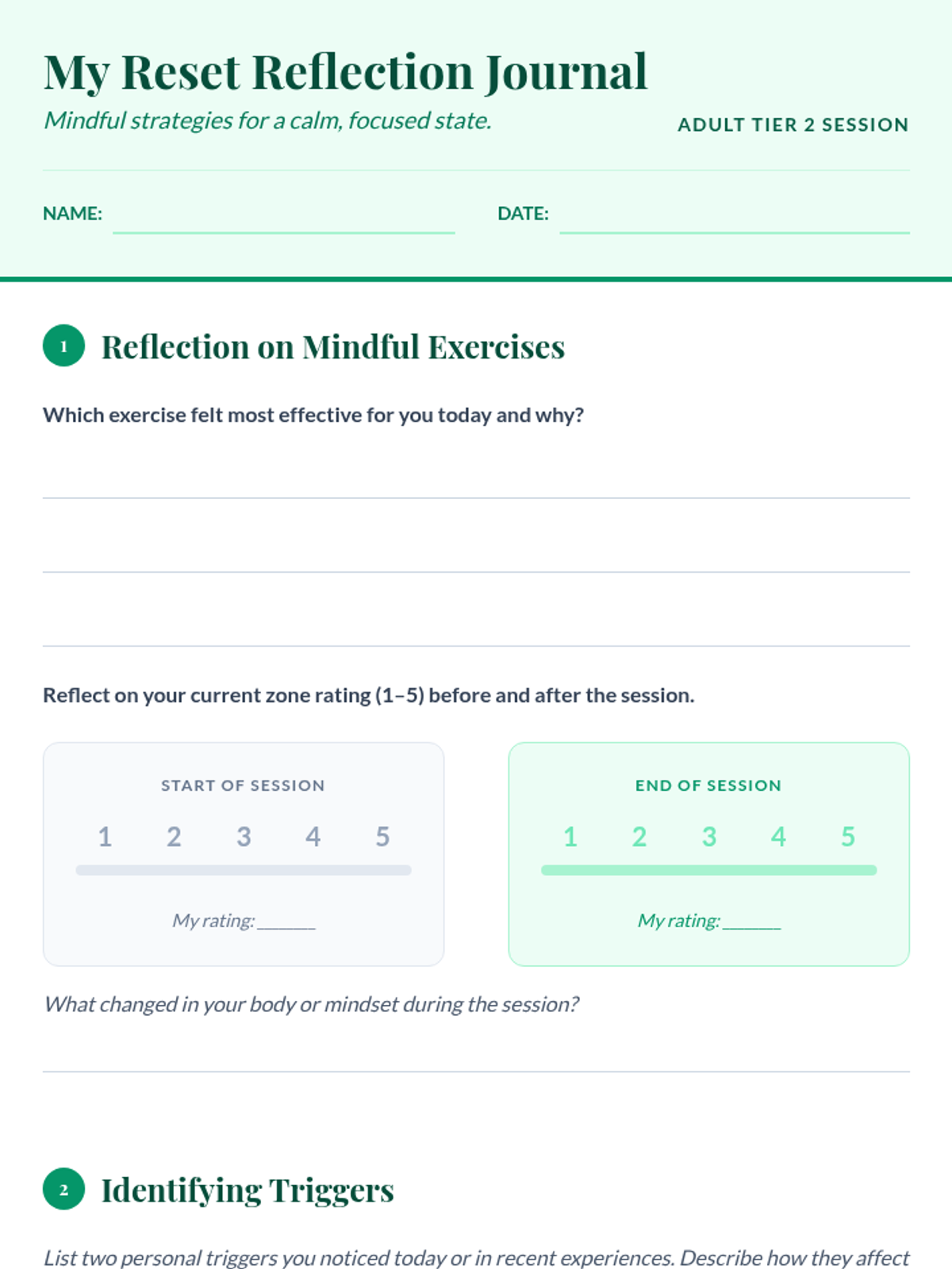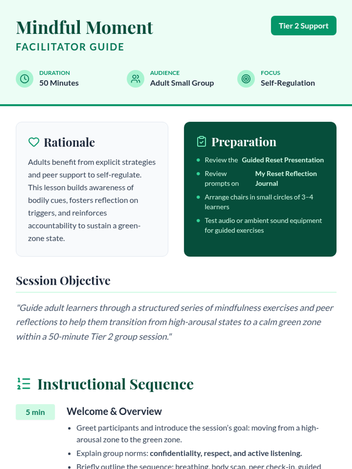 A 50-minute Tier 2 small-group session for adult learners designed to build self-regulation skills. Participants practice mindfulness techniques, identify personal triggers, and develop actionable reset plans to transition into a calm green zone.