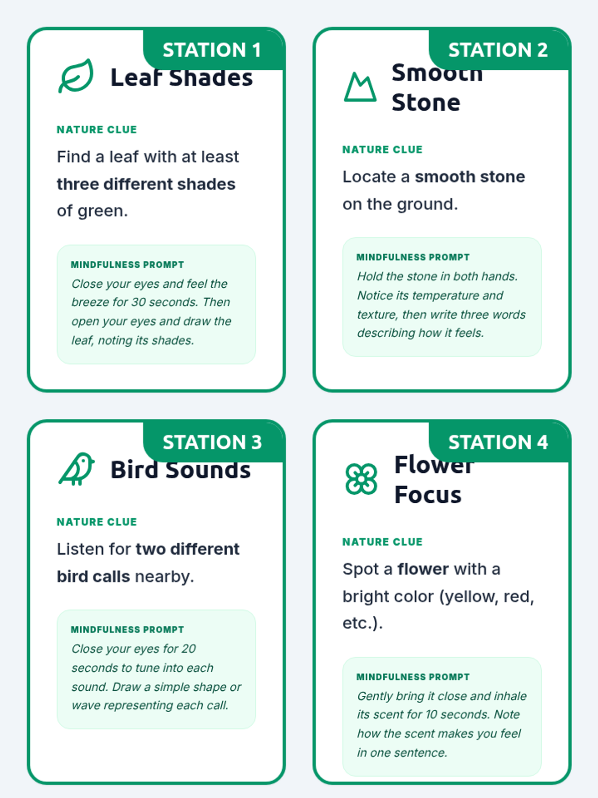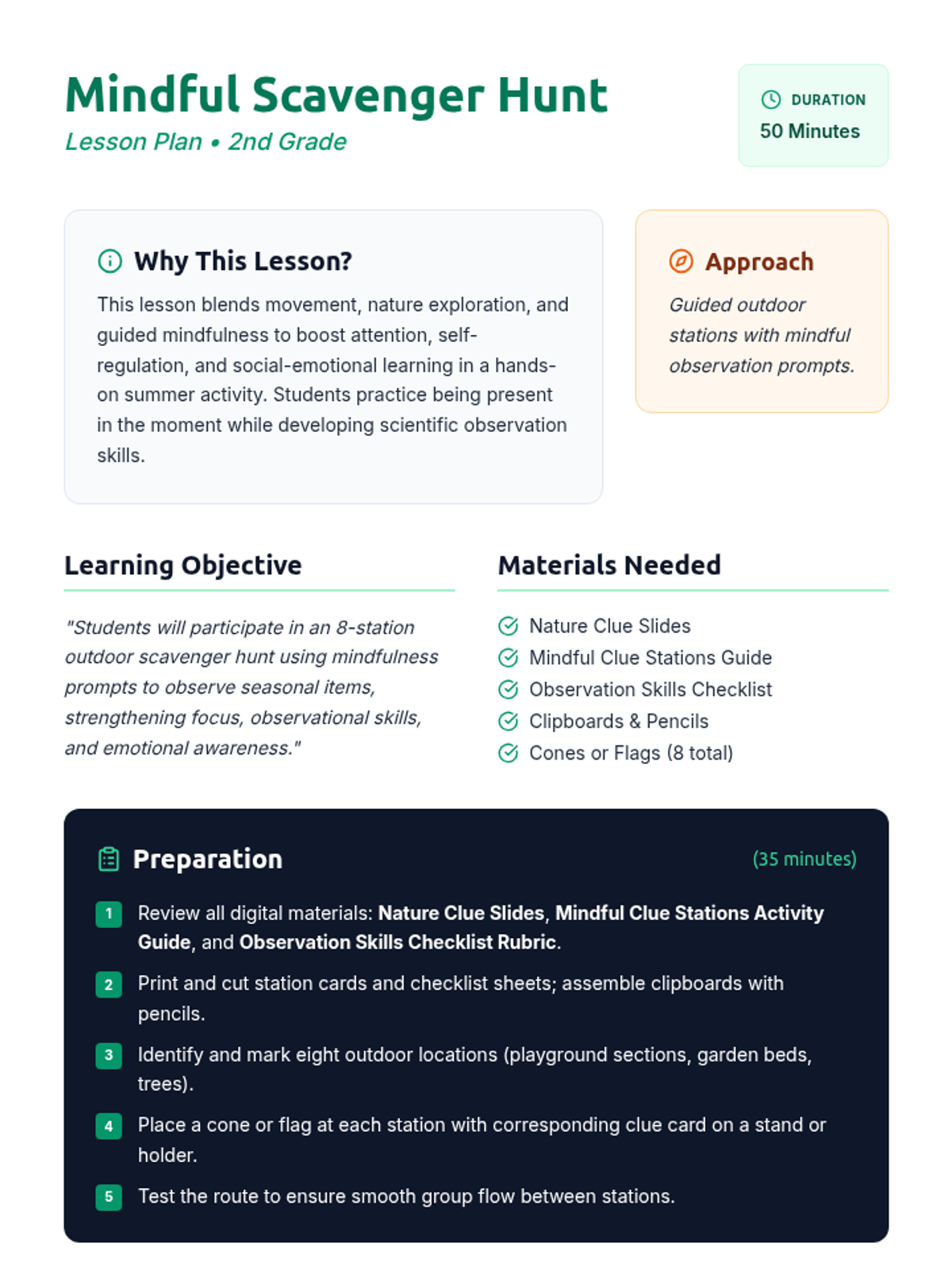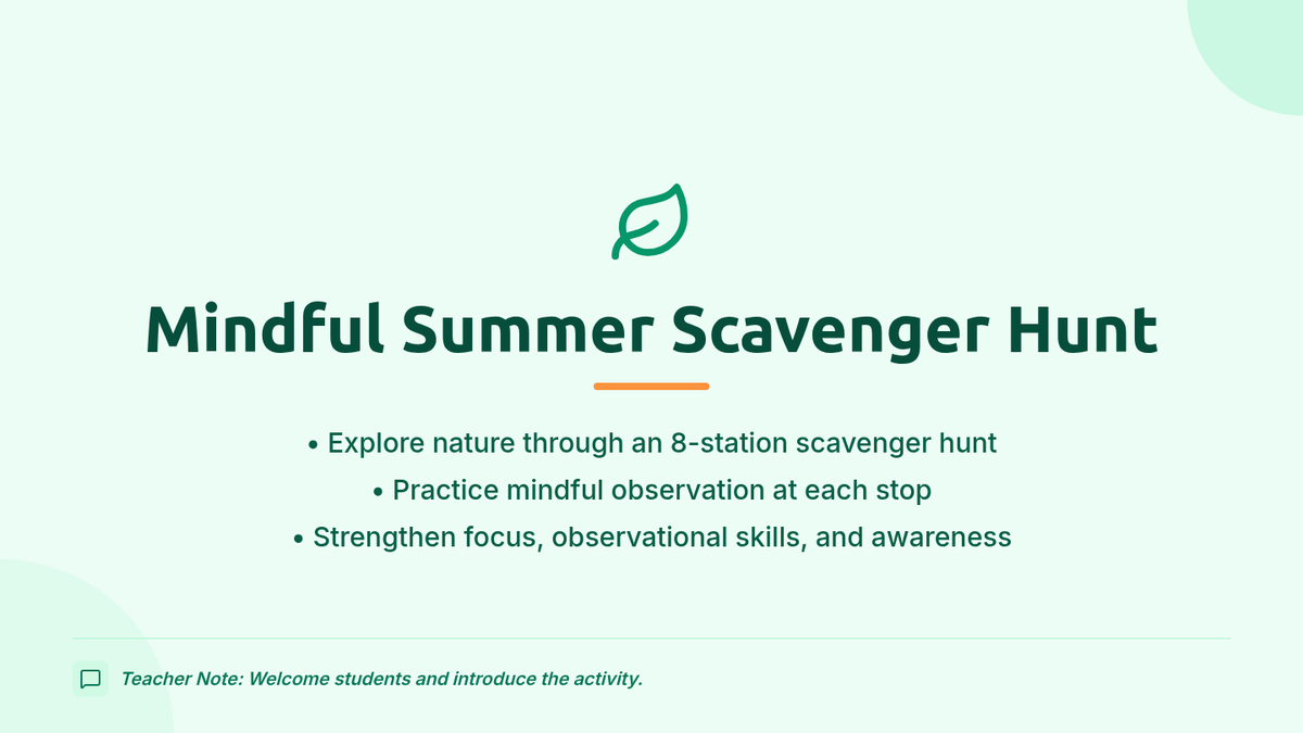 A 50-minute outdoor lesson where 2nd graders use mindfulness prompts to explore nature through an 8-station scavenger hunt, building focus and emotional awareness.