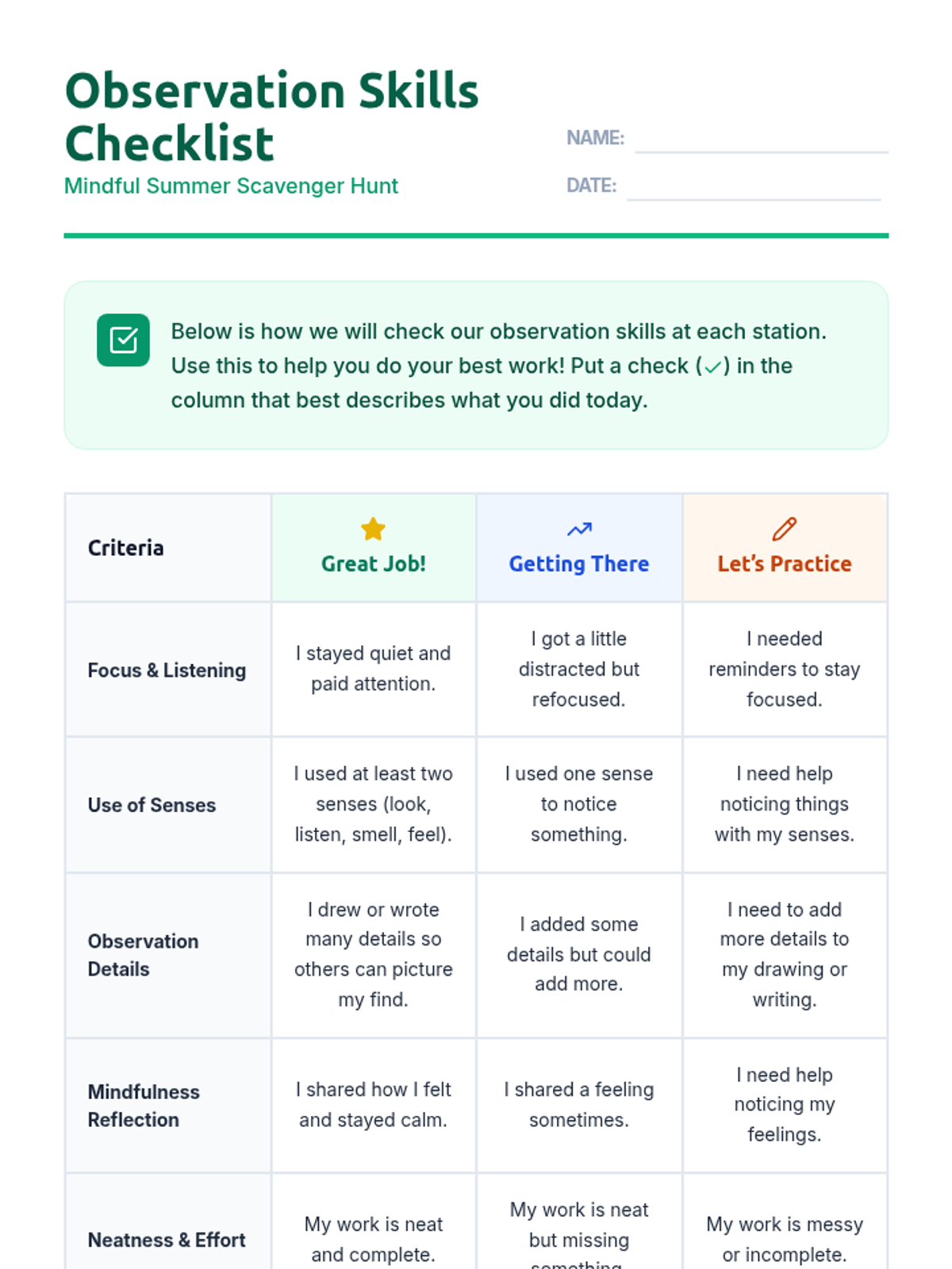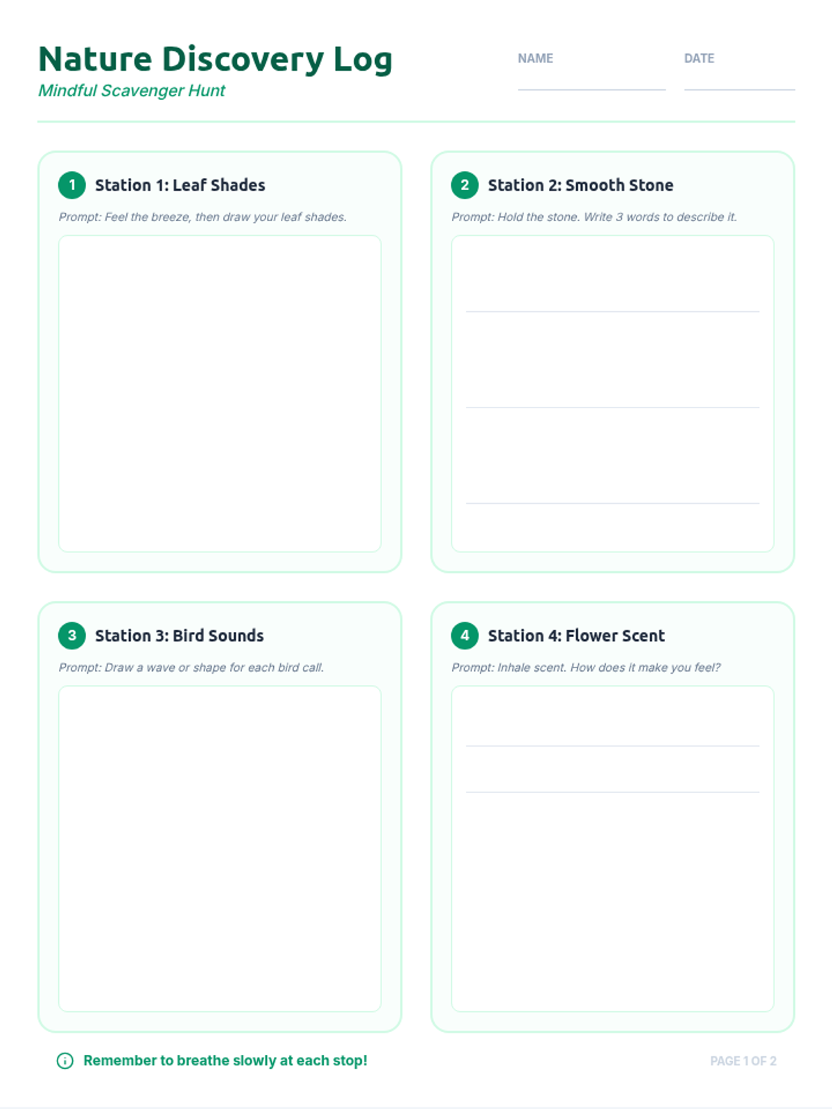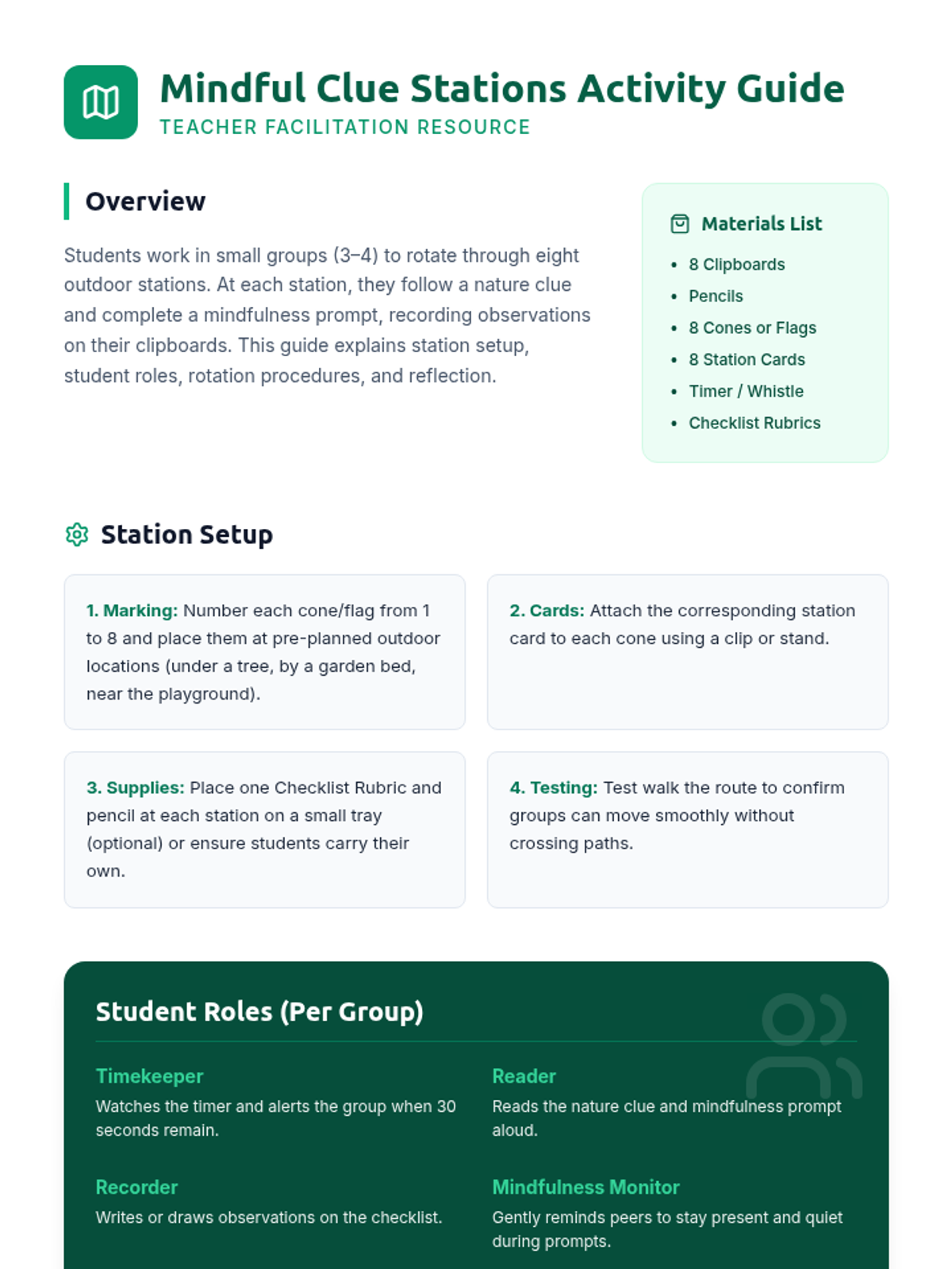 A 50-minute outdoor lesson where 2nd graders use mindfulness prompts to explore nature through an 8-station scavenger hunt, building focus and emotional awareness.