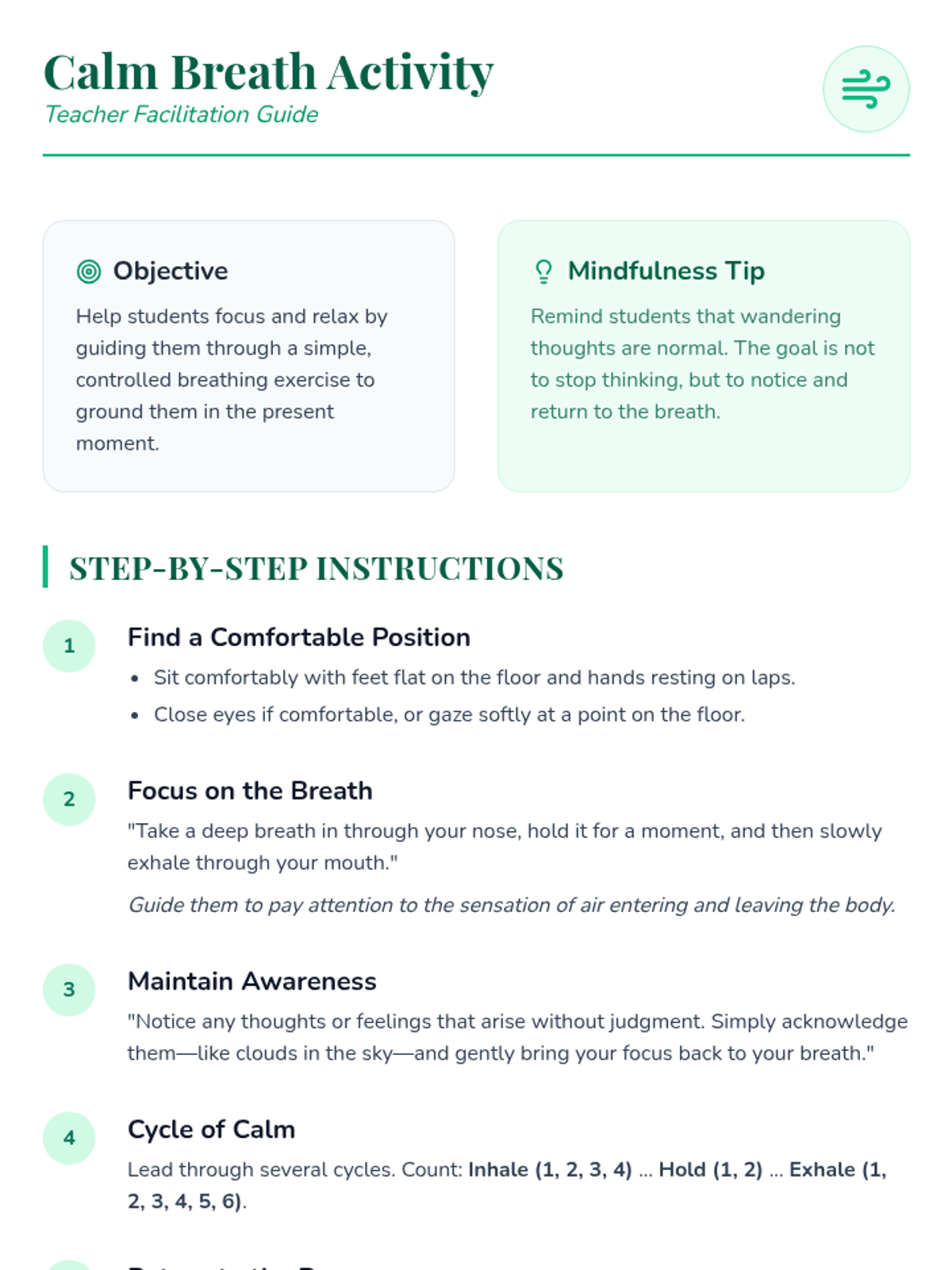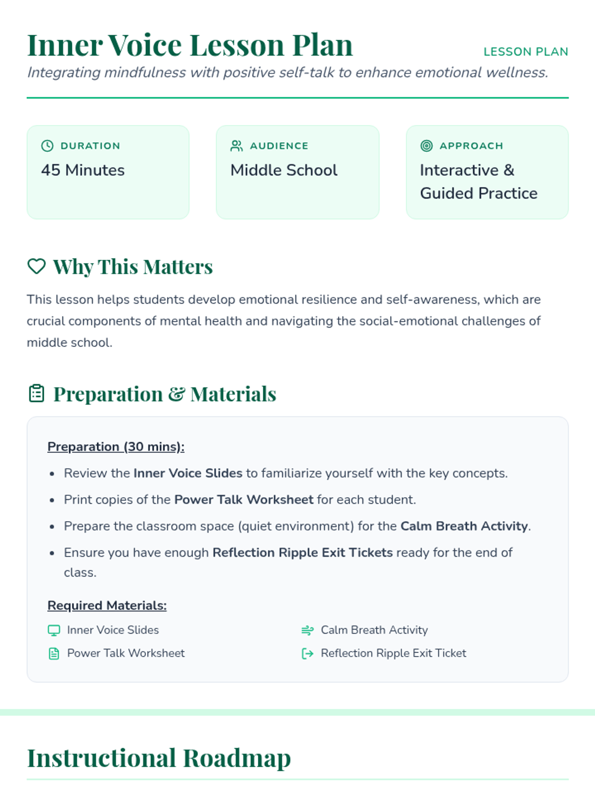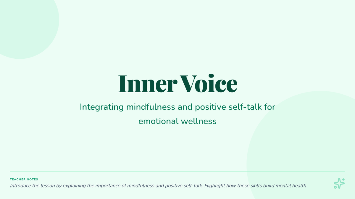 A lesson focused on middle school students learning to integrate mindfulness practices with positive self-talk strategies to improve emotional resilience and self-awareness.