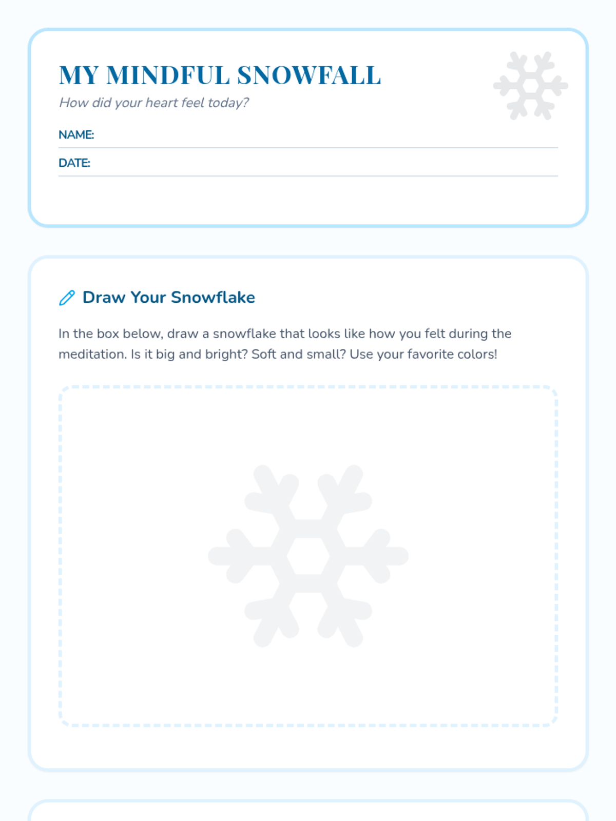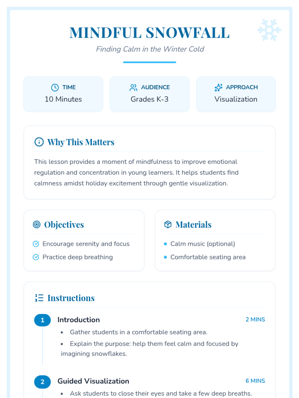 A 10-minute mindfulness lesson for Grades K-3 where students use snowflake visualization to find calm and focus during the holiday season.
