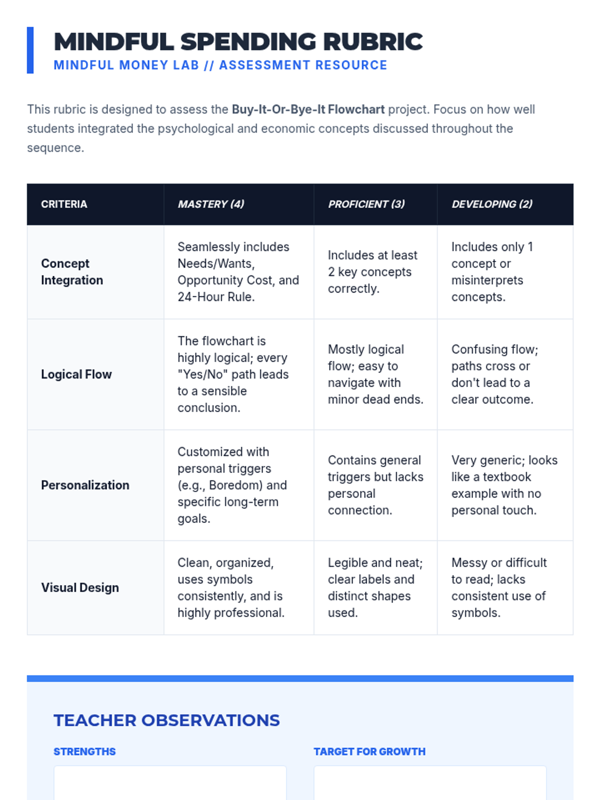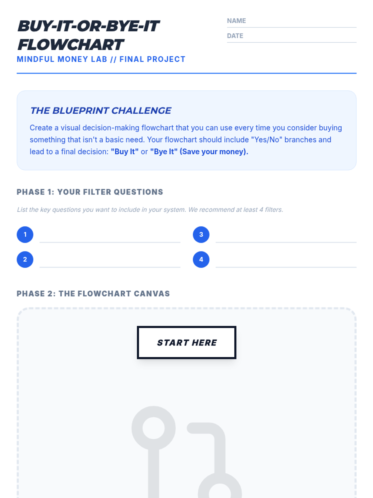 Students create a personal guide for future spending decisions, synthesizing their knowledge into a flowchart for making purchase decisions.