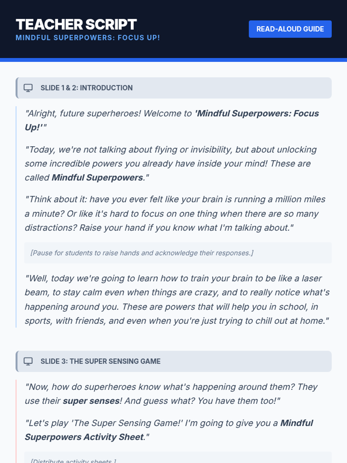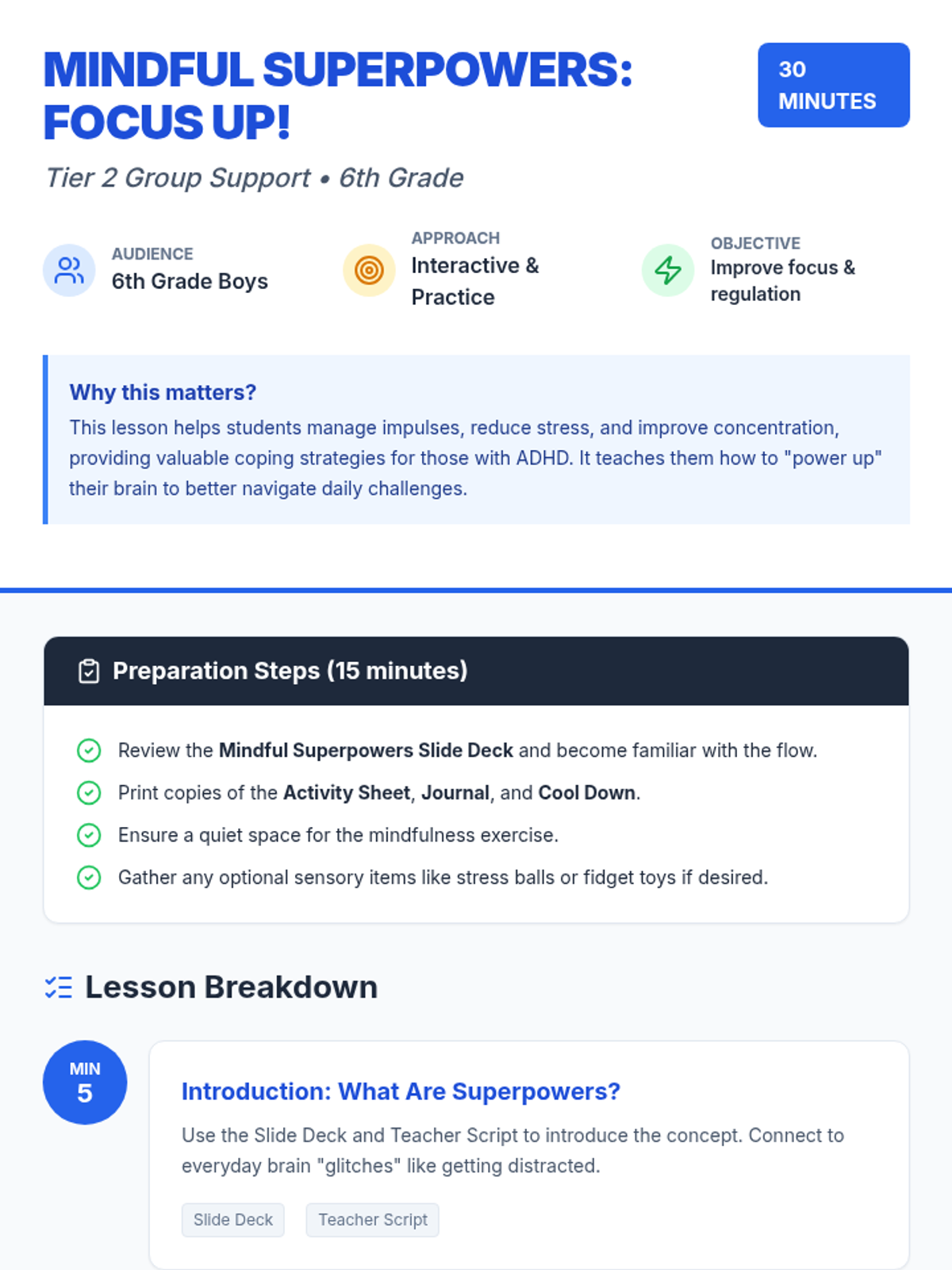 A 30-minute Tier 2 group lesson for 6th-grade boys with ADHD, focusing on mindfulness techniques like sensory awareness and controlled breathing to improve focus and emotional regulation.
