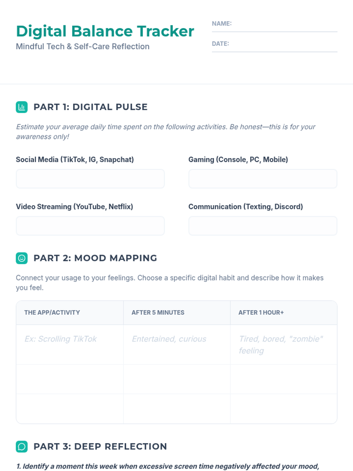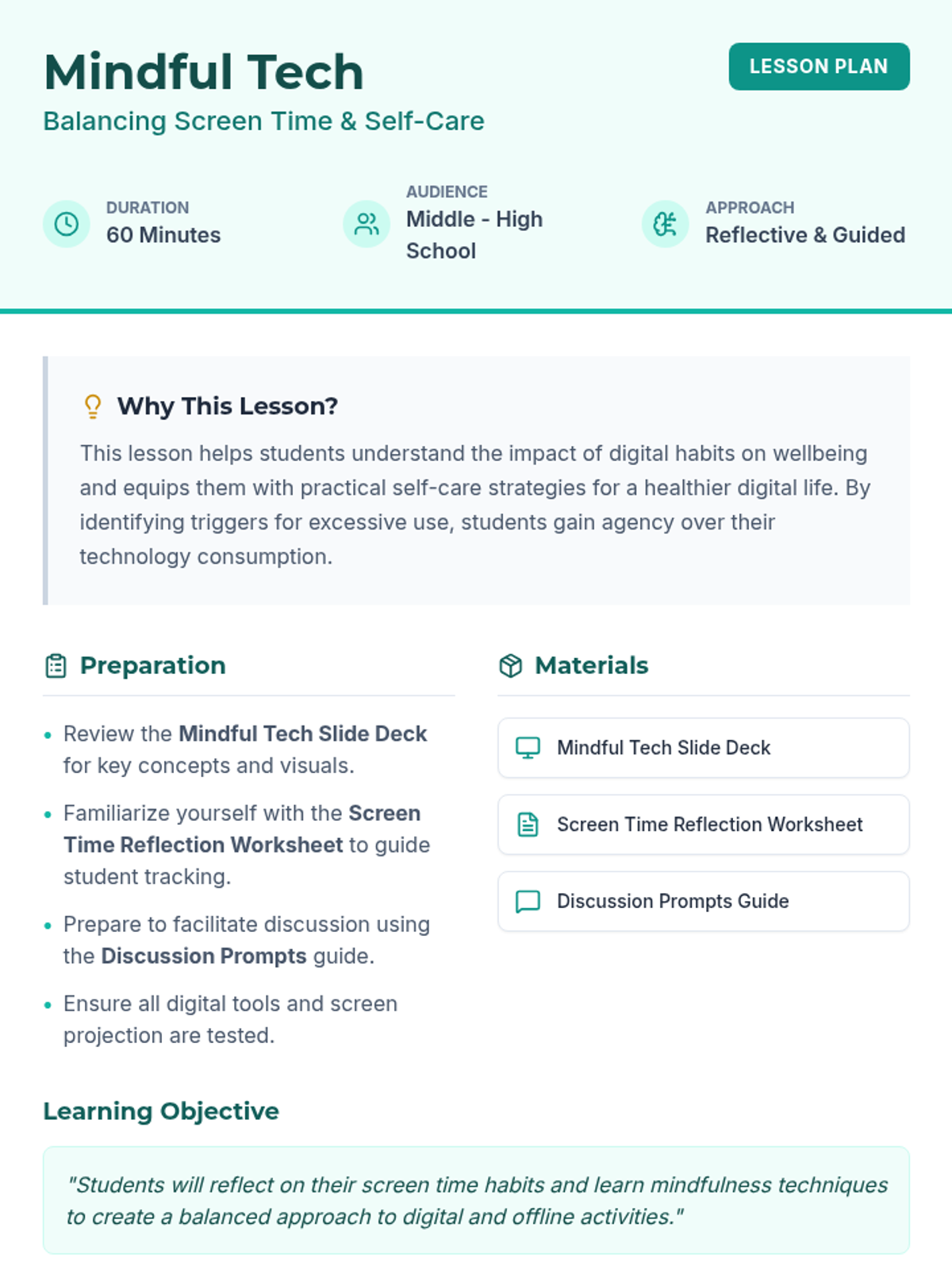 A lesson that helps students analyze their digital habits and learn mindfulness strategies to maintain a healthy balance between screen time and self-care.