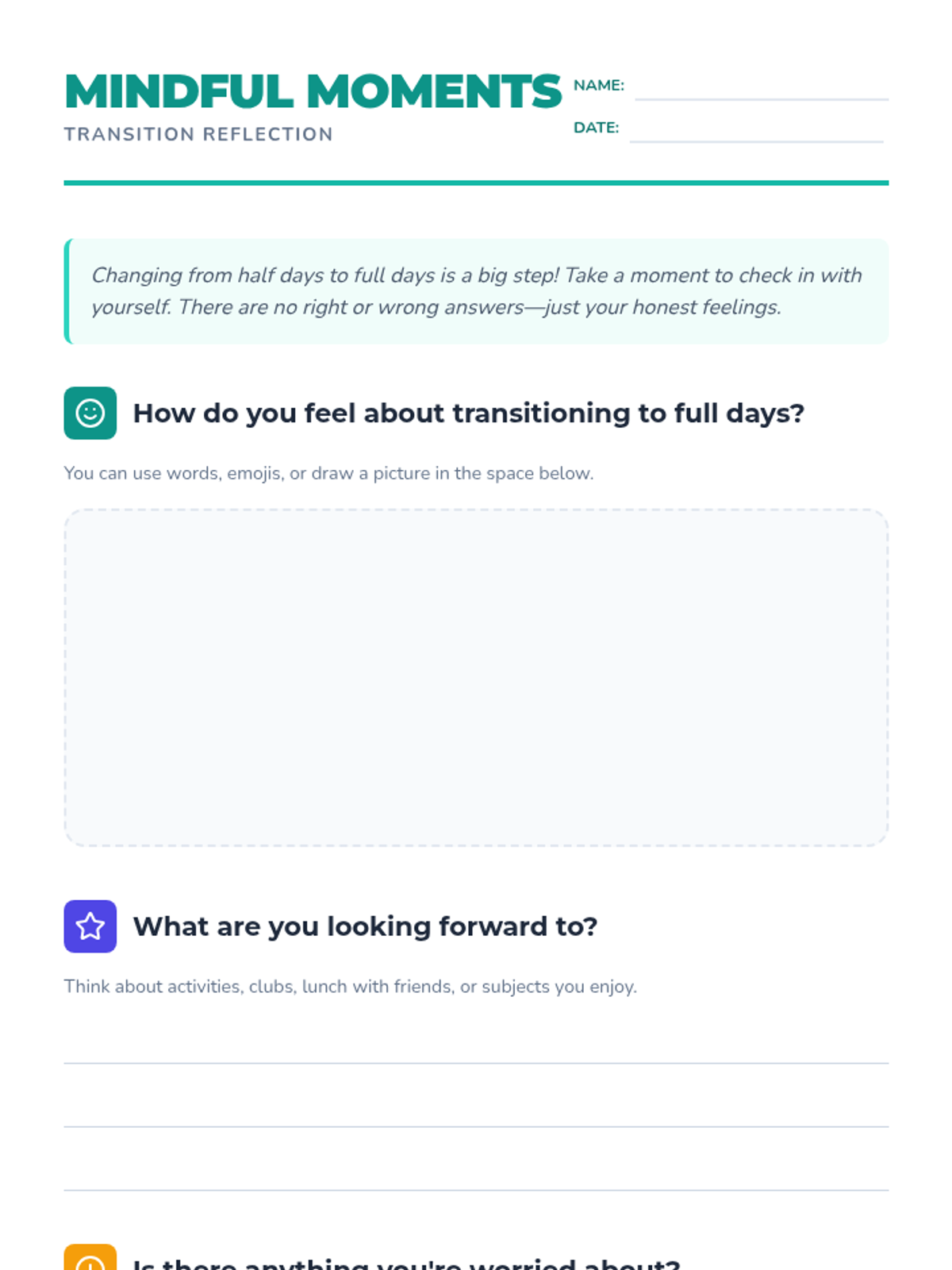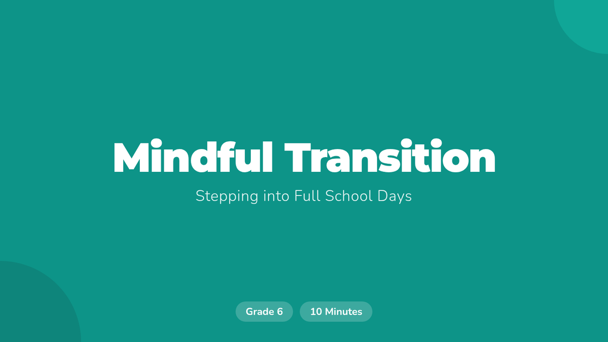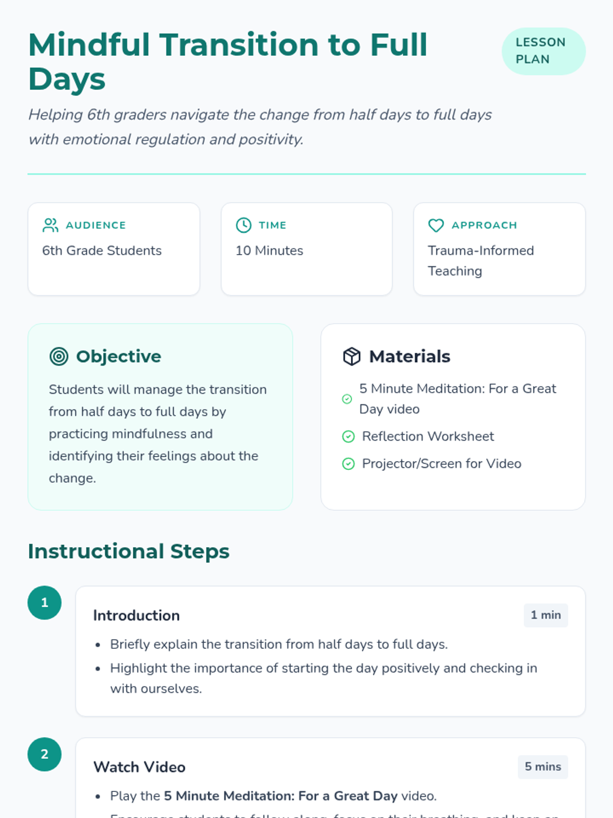 This lesson helps 6th graders transition from half days to full days by incorporating mindfulness and emotional regulation. It includes a 5-minute meditation video and a reflective activity to support students' emotional well-being during the change.