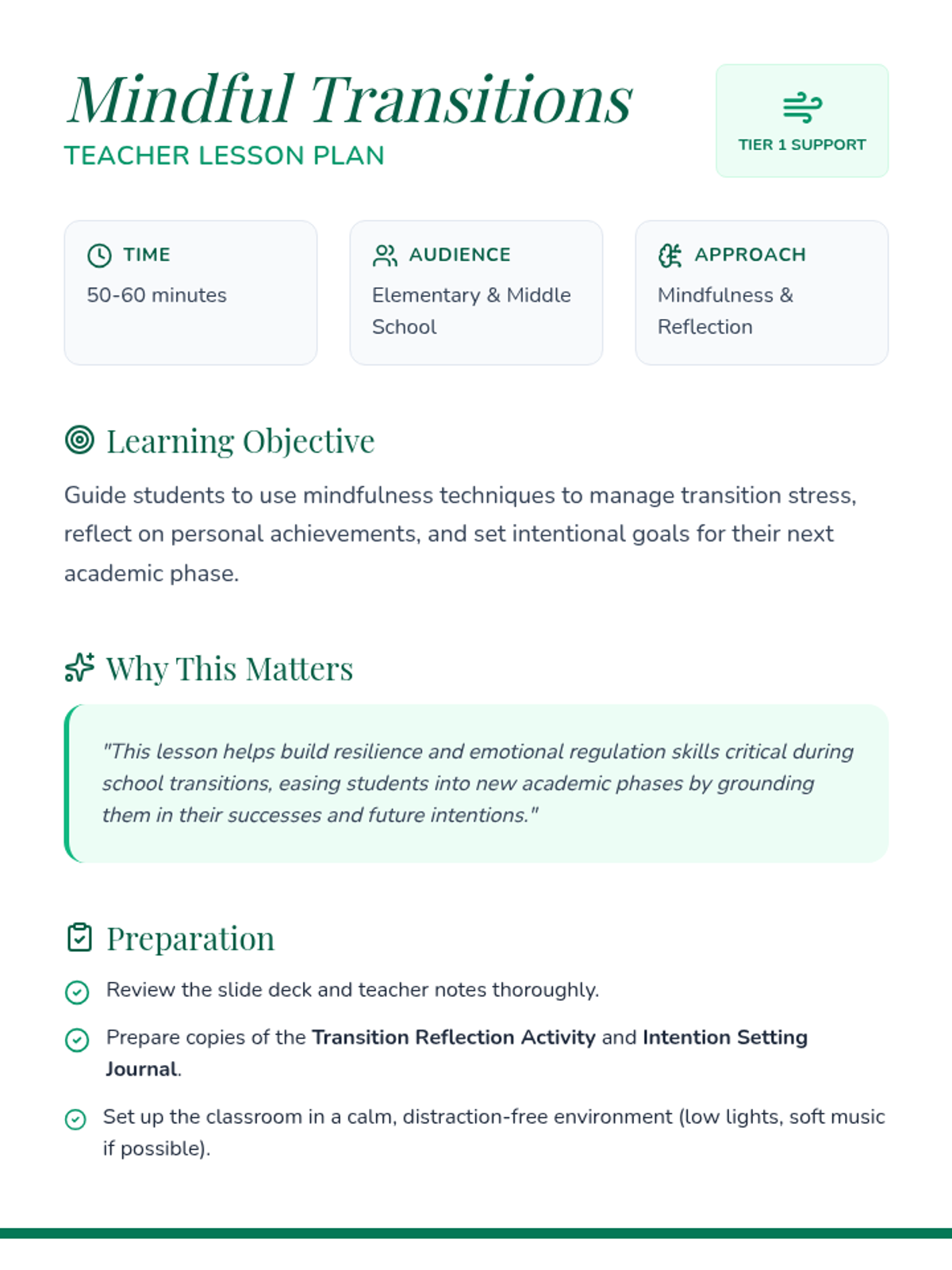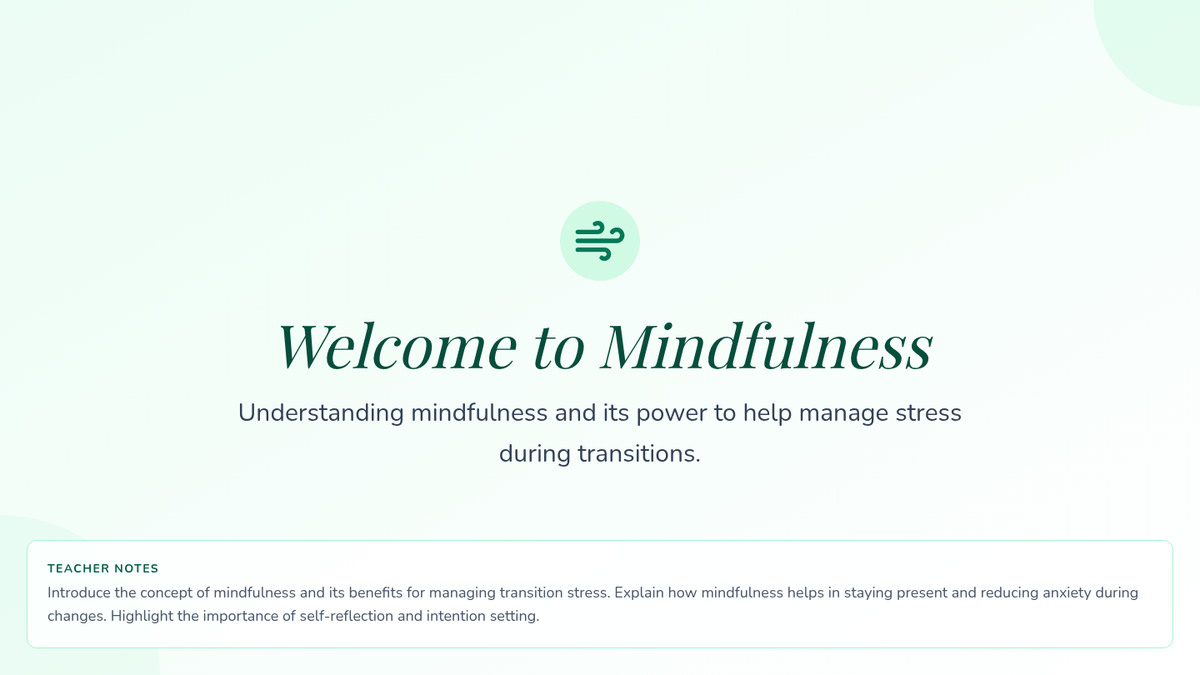 This lesson helps students navigate school transitions by using mindfulness exercises to manage stress and build resilience. It encourages them to reflect on their achievements and set intentions for the coming year. Perfect for students finishing elementary and middle school.