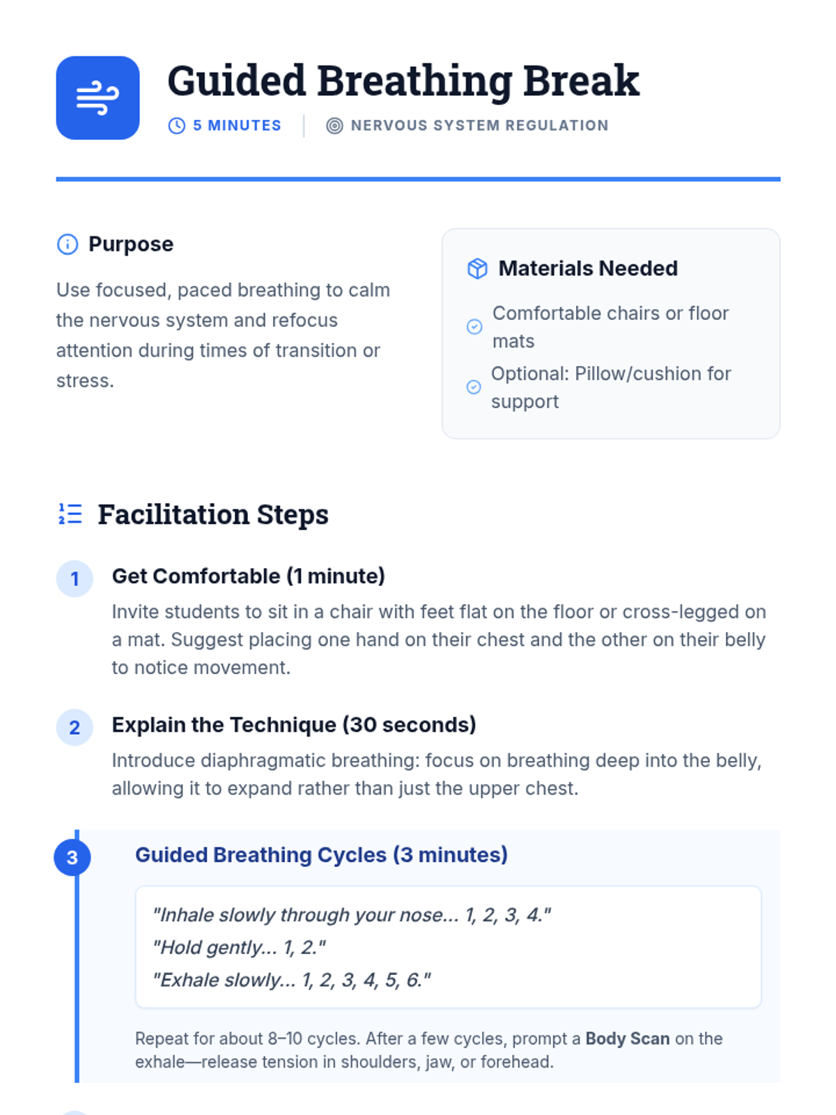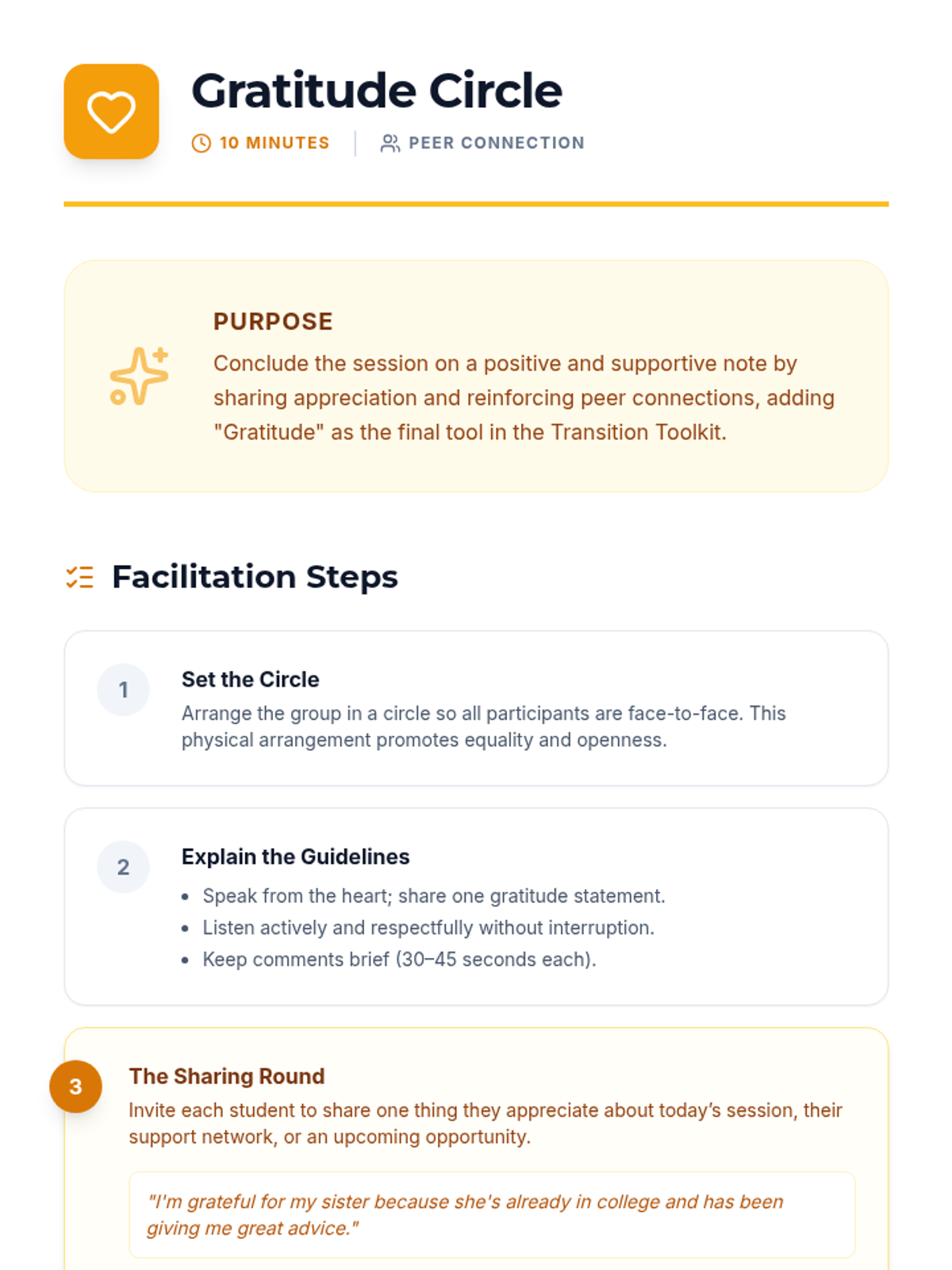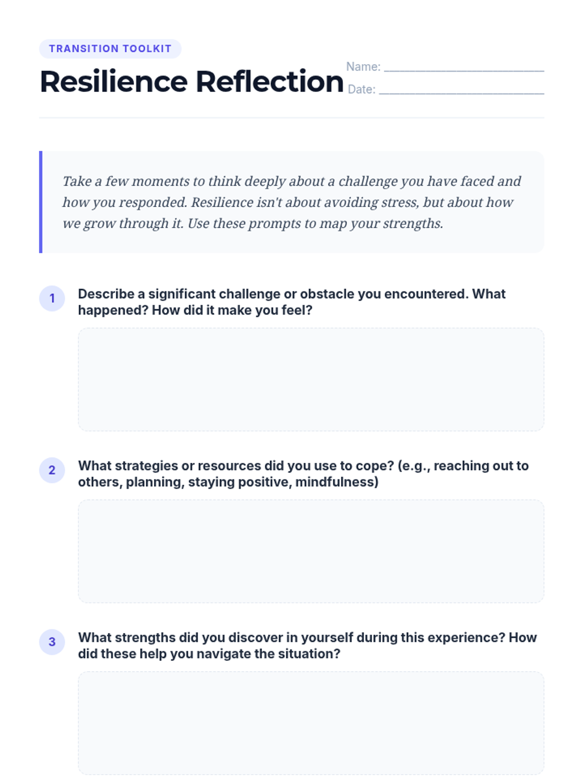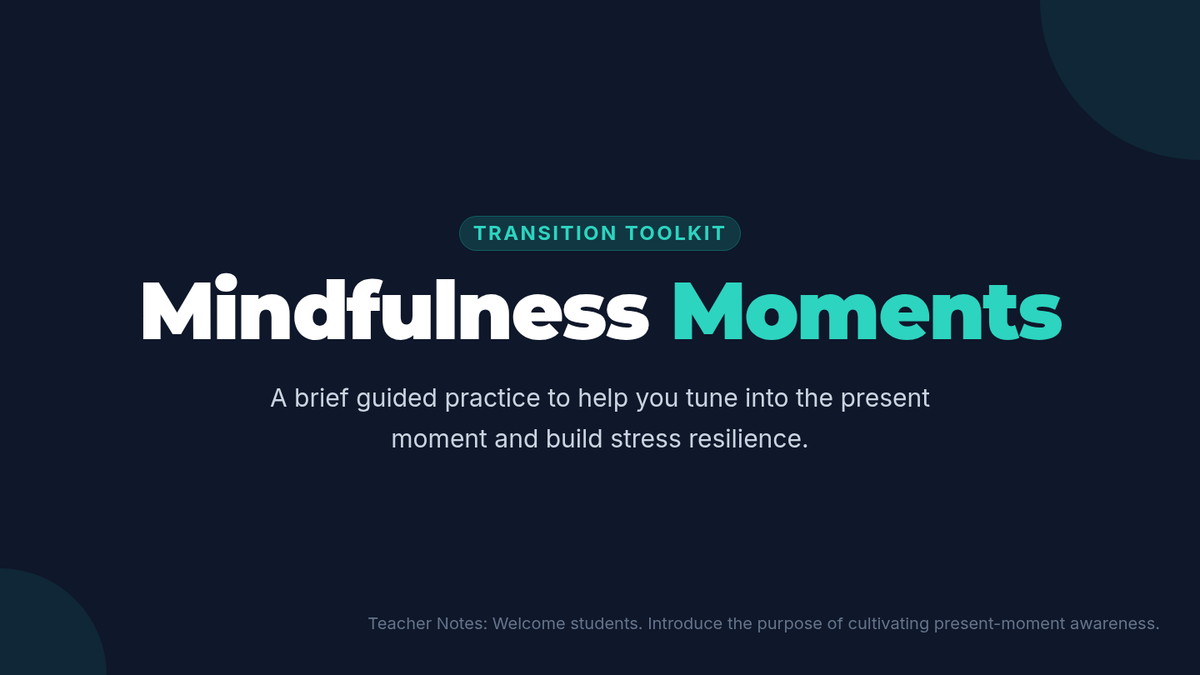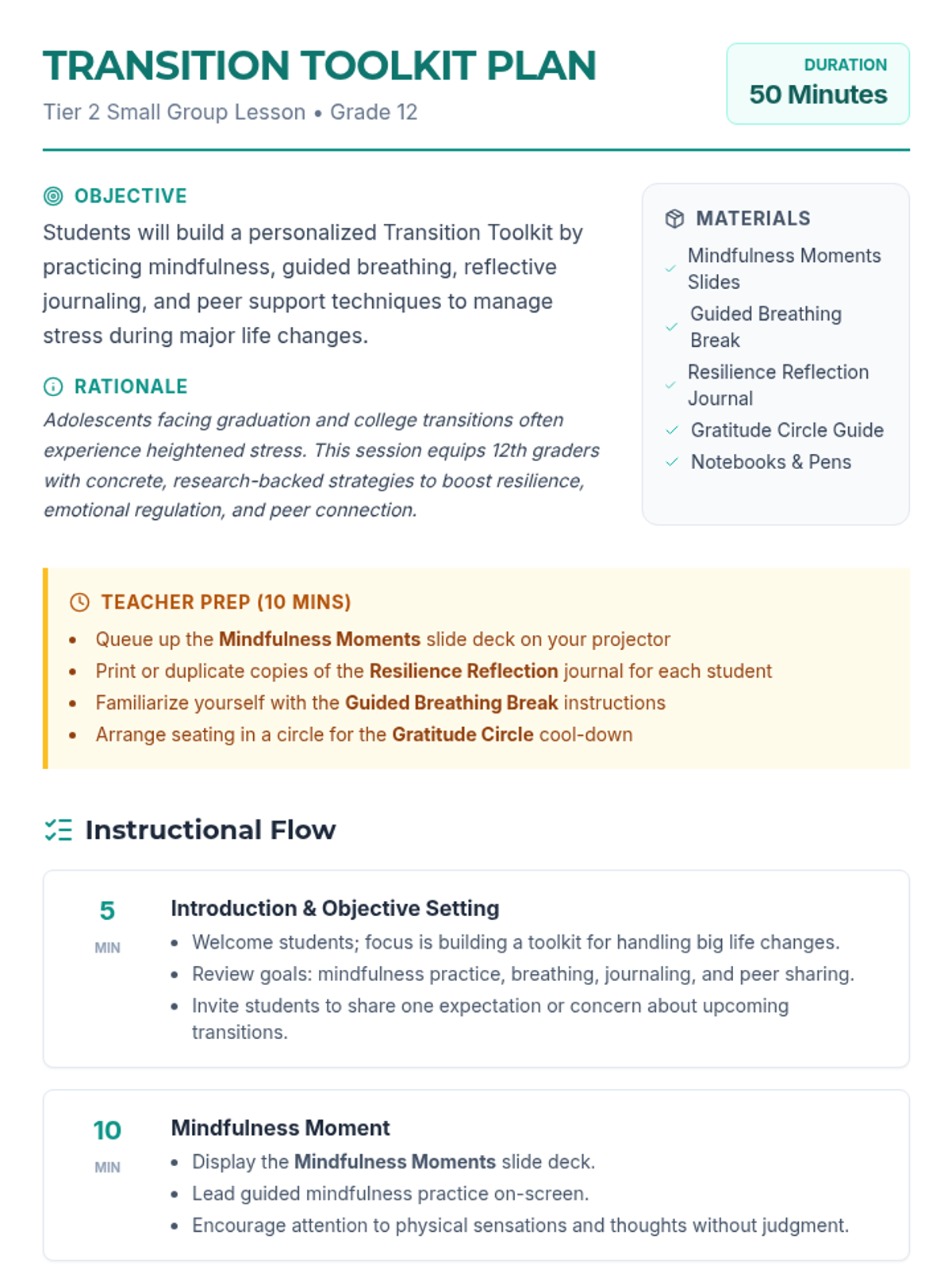 A 50-minute small-group session for 12th graders to explore stress-management and resilience techniques. Students build a personalized Transition Toolkit through mindfulness, breathing, journaling, and peer support to navigate major life changes.