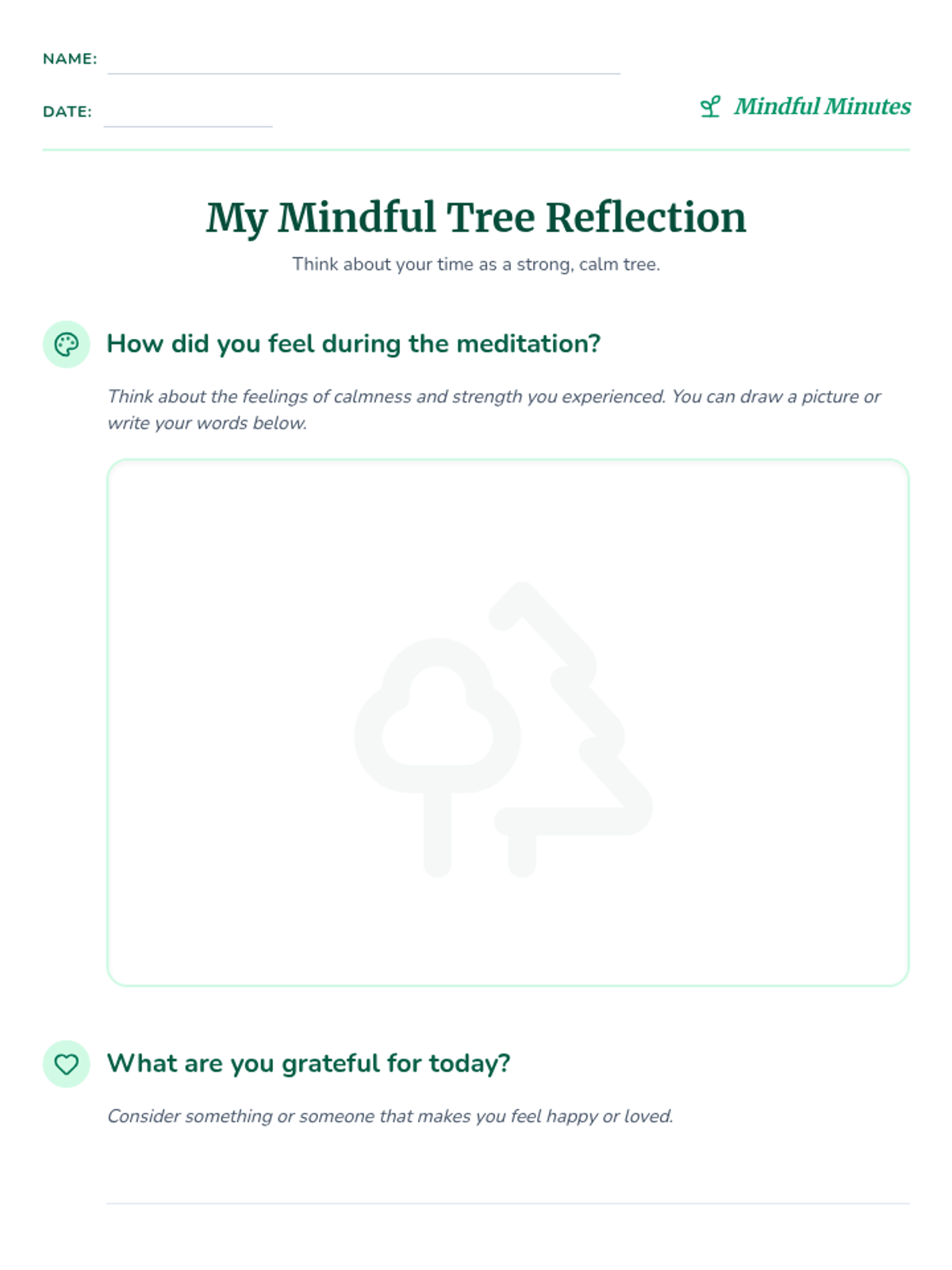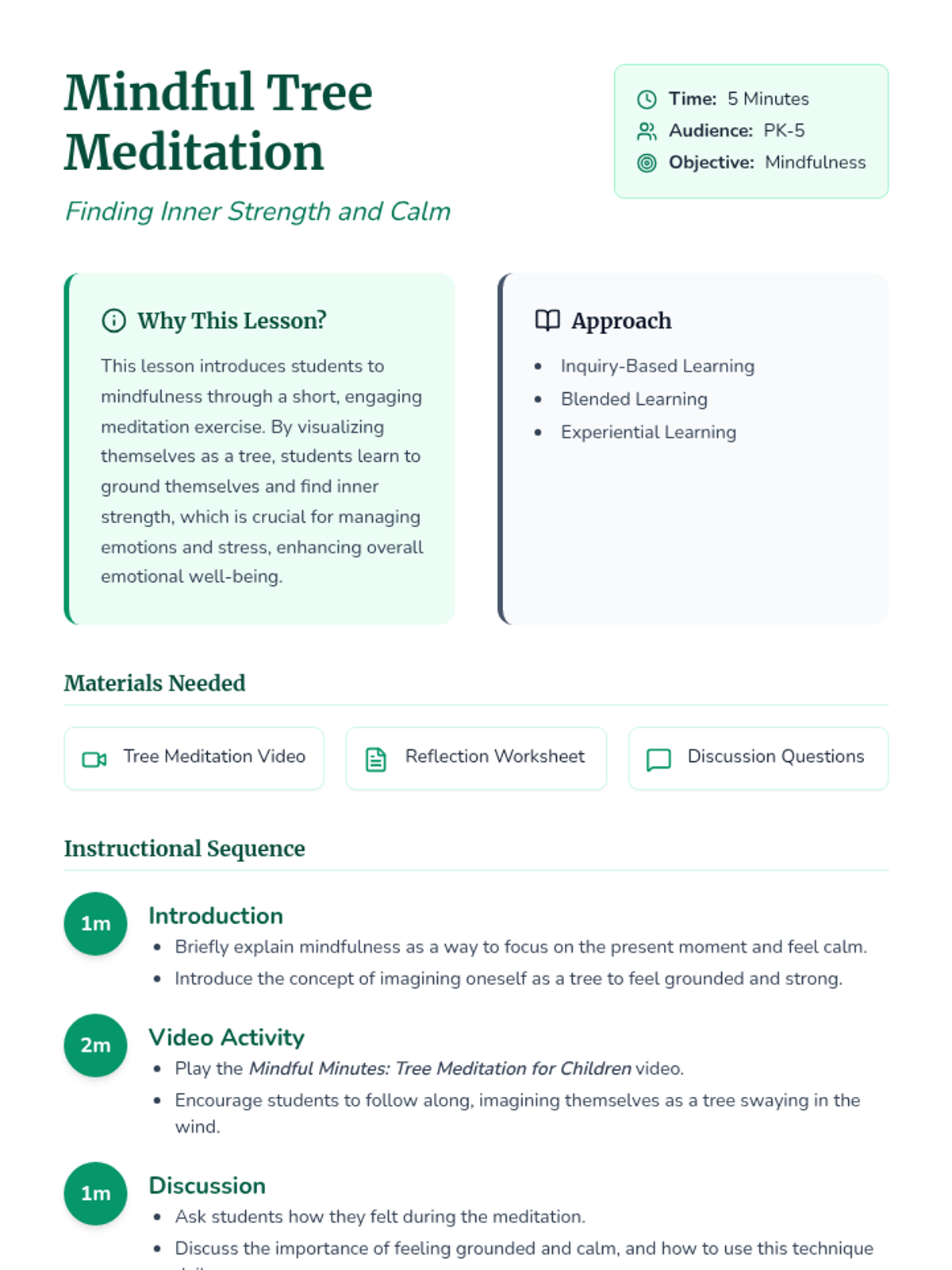 A short, 5-minute mindfulness lesson for PK-5 students focusing on grounding and gratitude through a tree meditation exercise. Students visualize themselves as strong, grounded trees to develop emotional regulation and inner calm.
