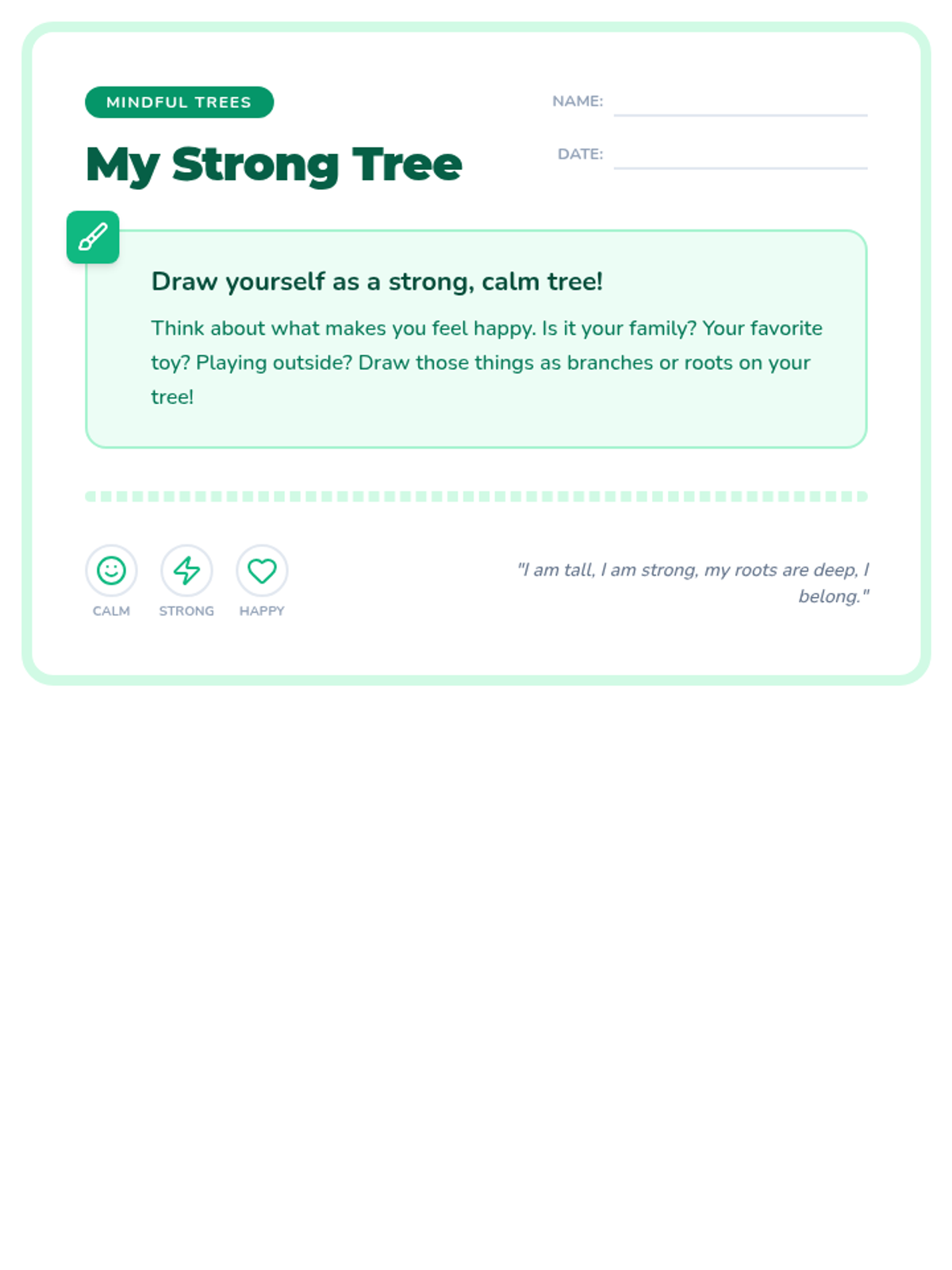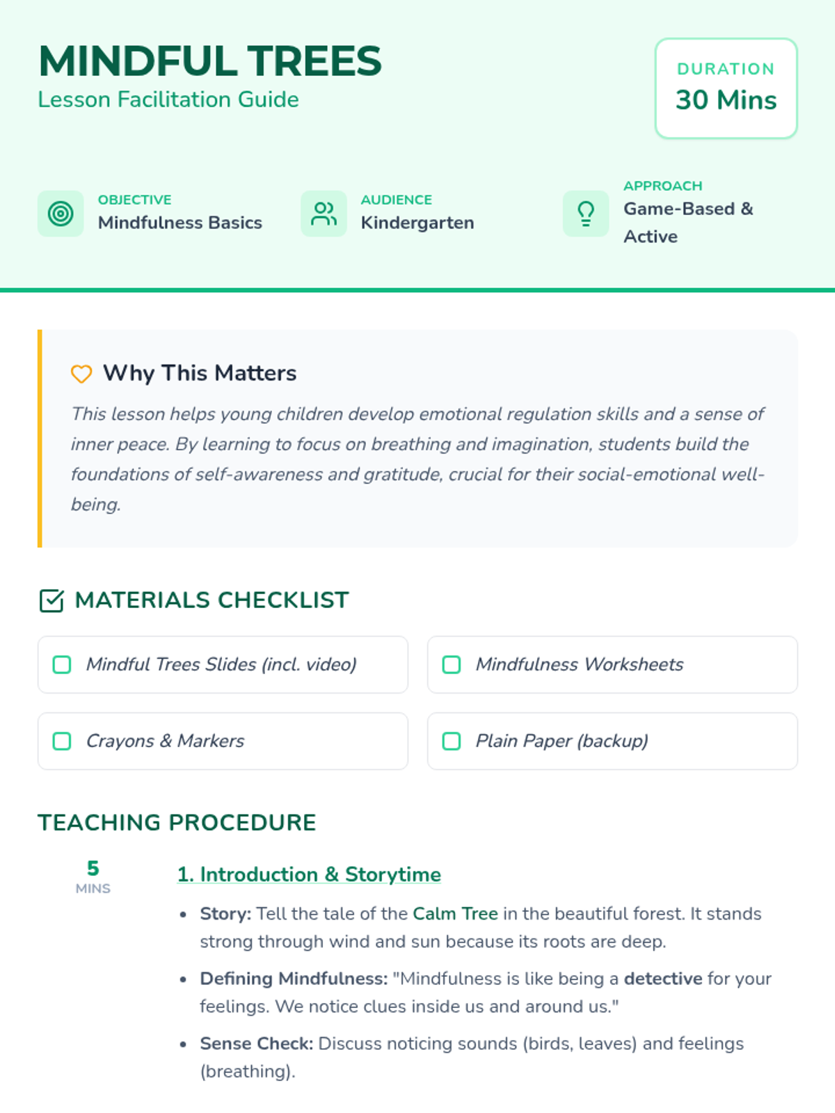 A 30-minute mindfulness lesson for kindergarteners that uses a 'tree' metaphor to teach emotional regulation, breathing techniques, and gratitude through a video, activity, and creative drawing.