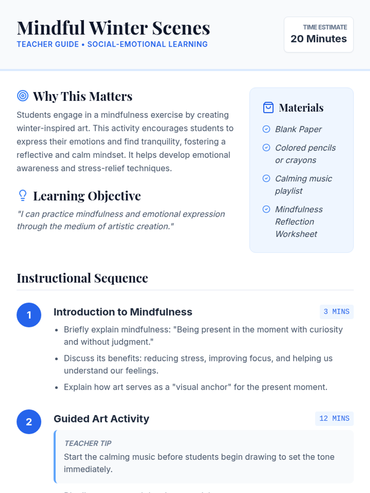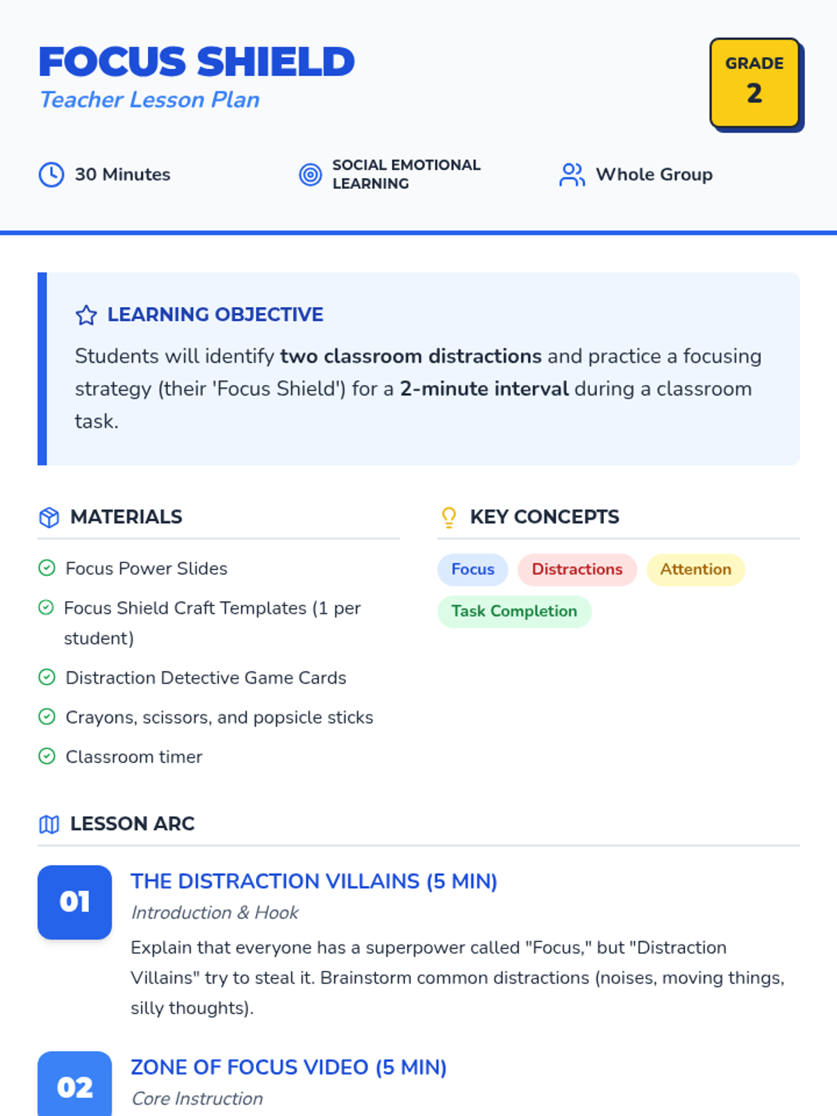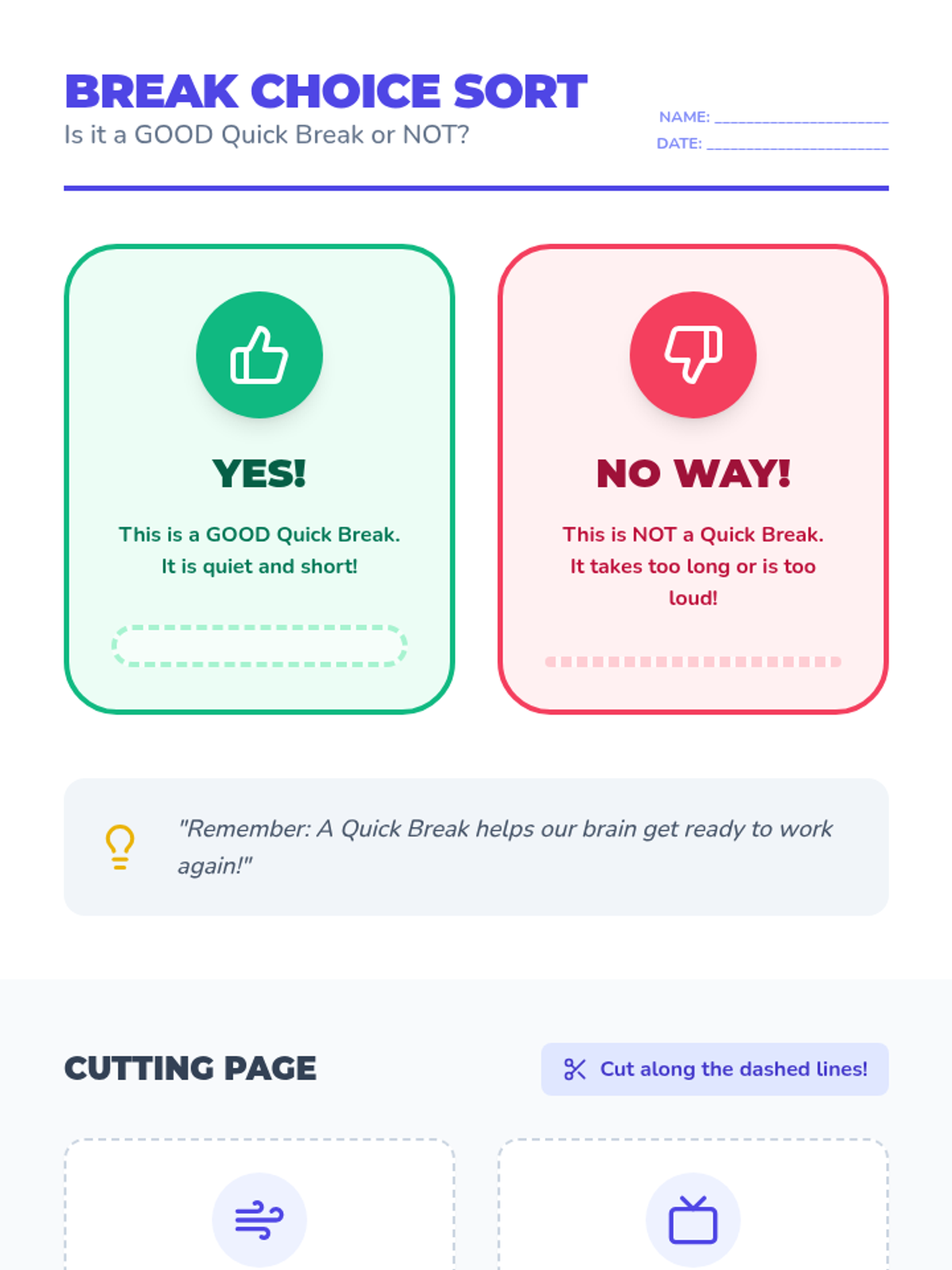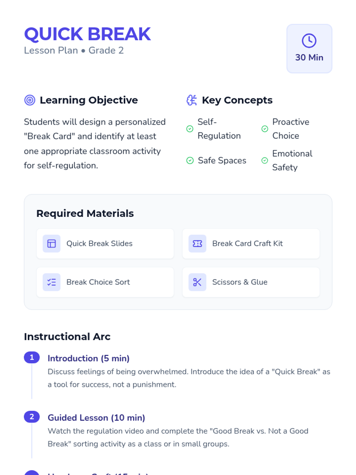 In this lesson, 2nd-grade students learn the importance of self-regulation by designing their own 'Break Cards' and identifying classroom-appropriate 'Good Break' activities. Through a combination of visual instruction, sorting activities, and a hands-on craft, students develop proactive strategies for managing their emotions.