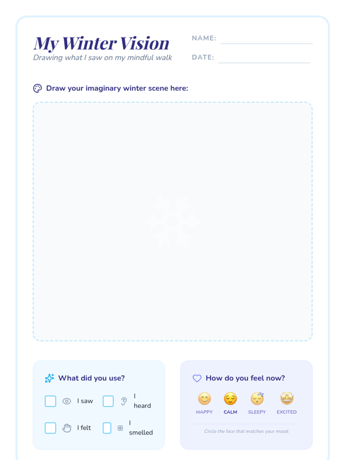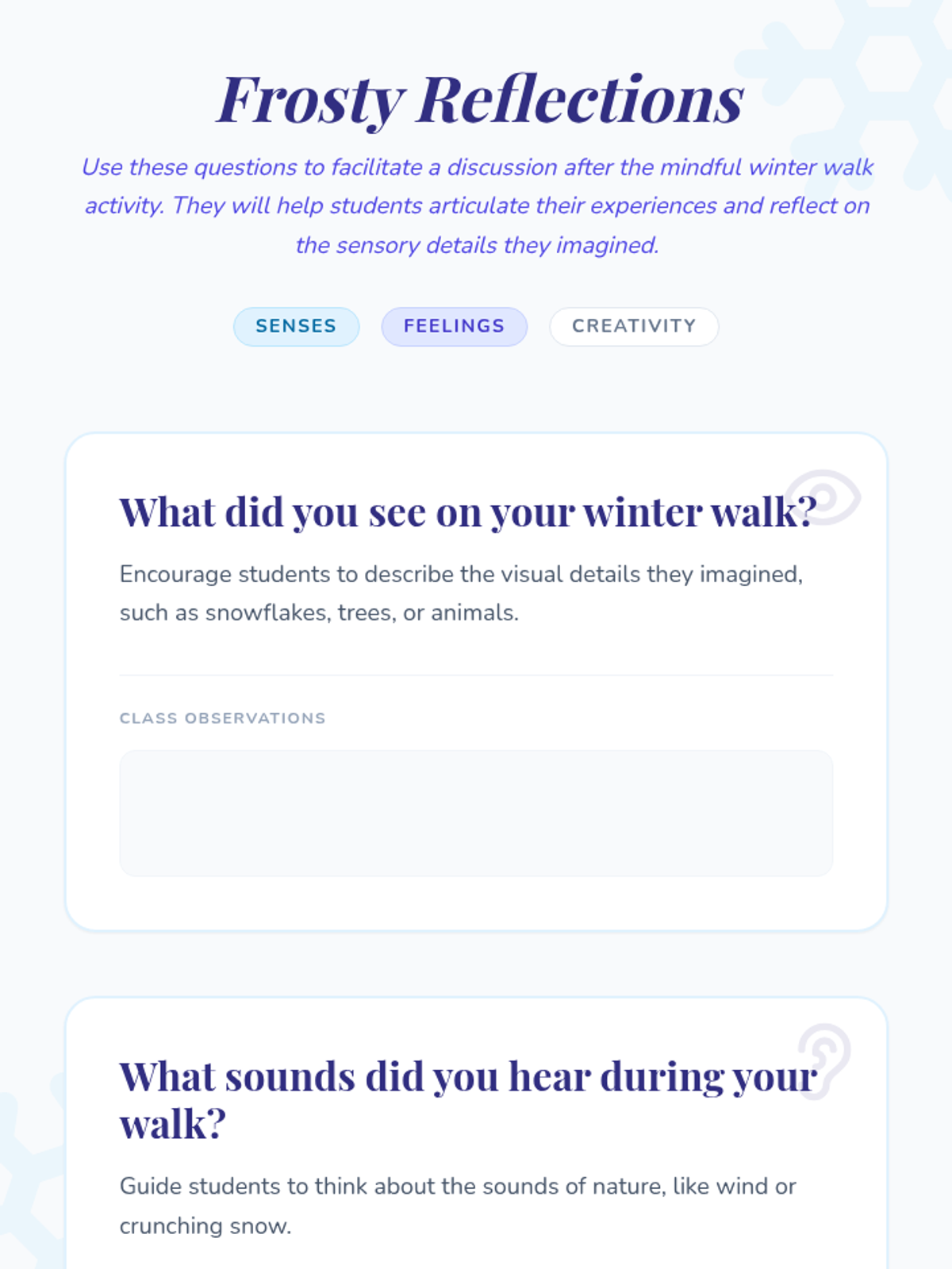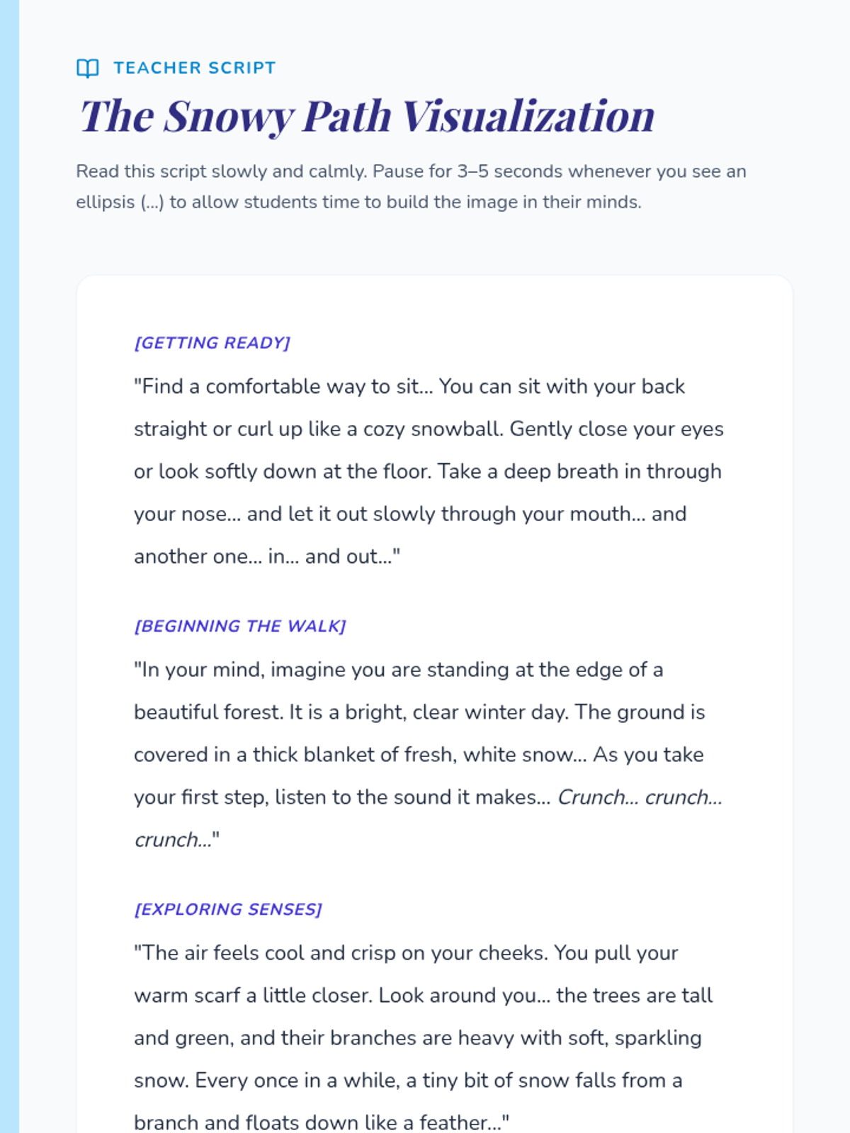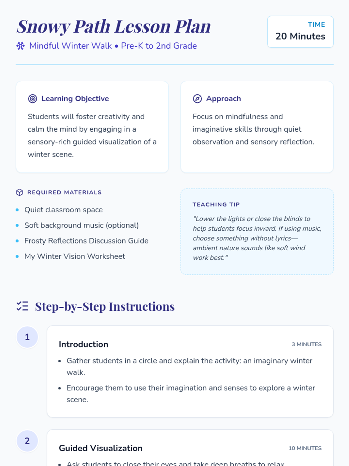 A calming, sensory-focused guided visualization lesson where students embark on an imaginary winter walk to develop mindfulness, focus, and creative thinking skills.