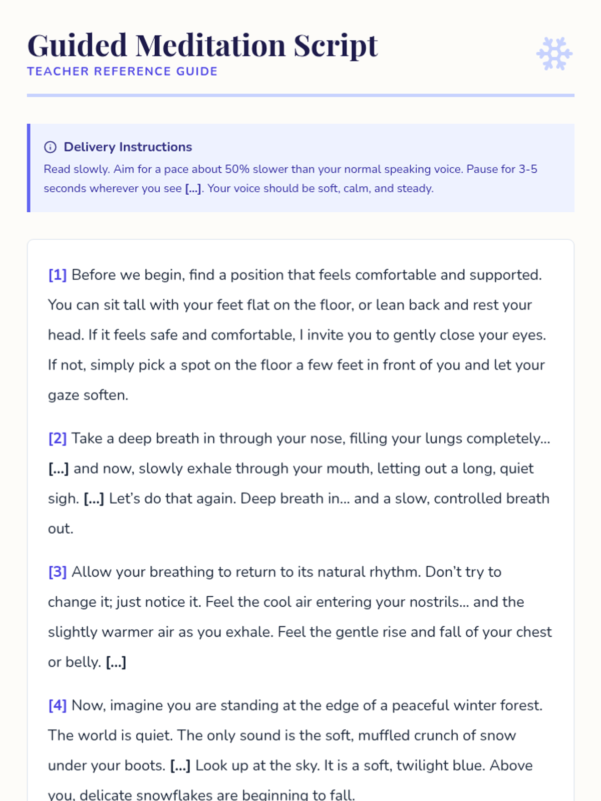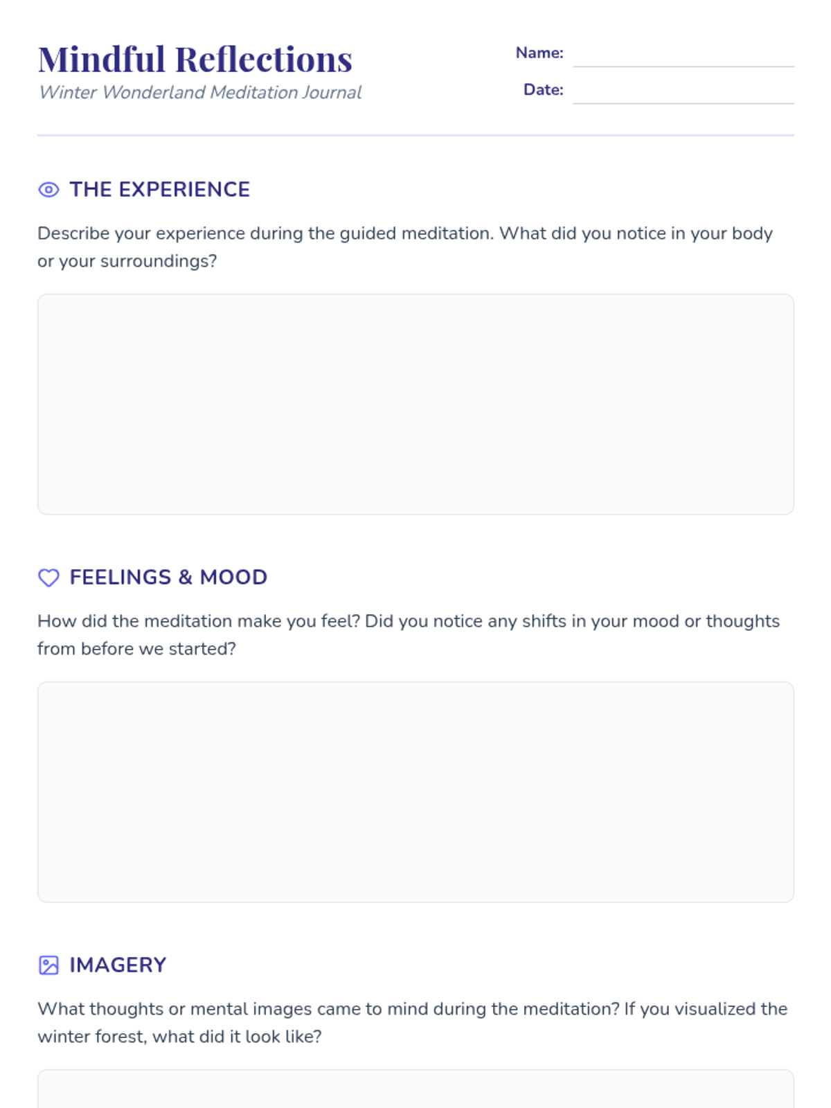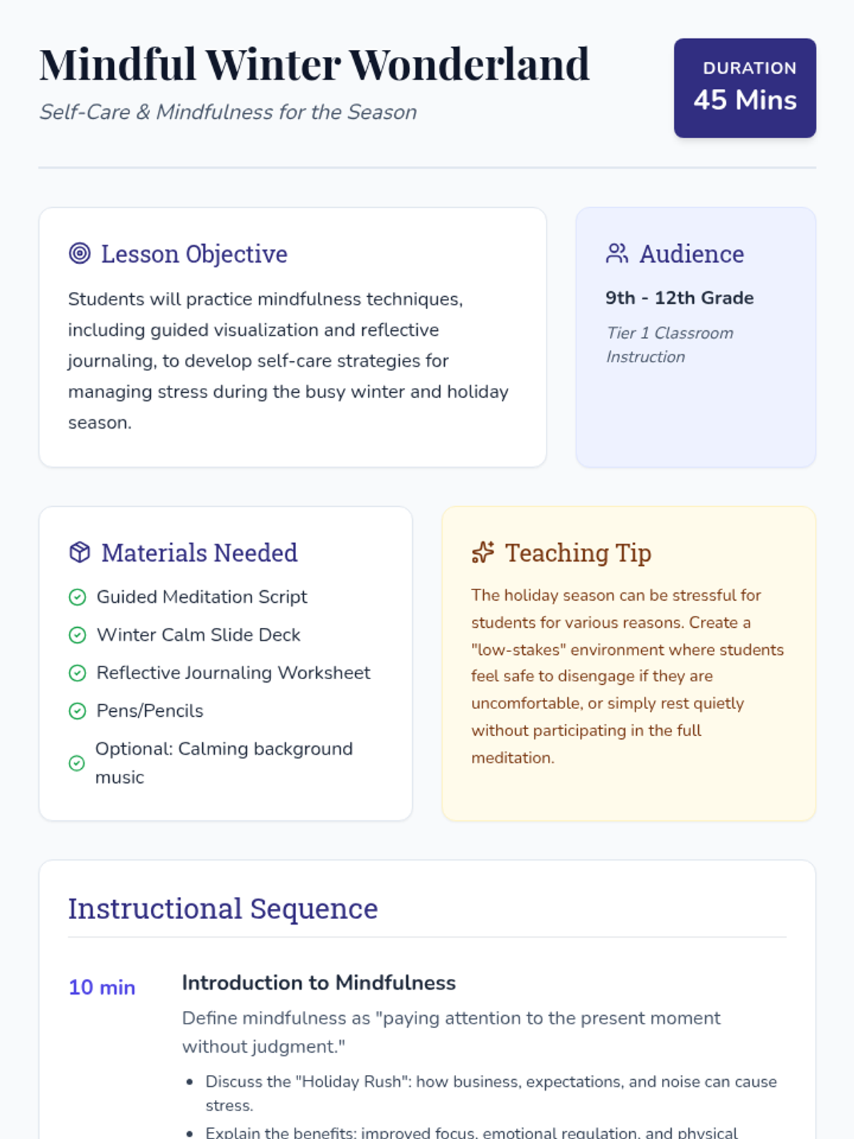 A high school lesson focused on mindfulness and self-care during the winter season, featuring guided meditation and reflective journaling.