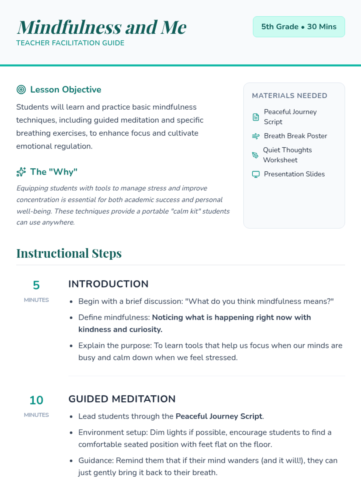 Students explore basic mindfulness techniques like guided meditation and breathing exercises to improve focus, emotional regulation, and stress management.