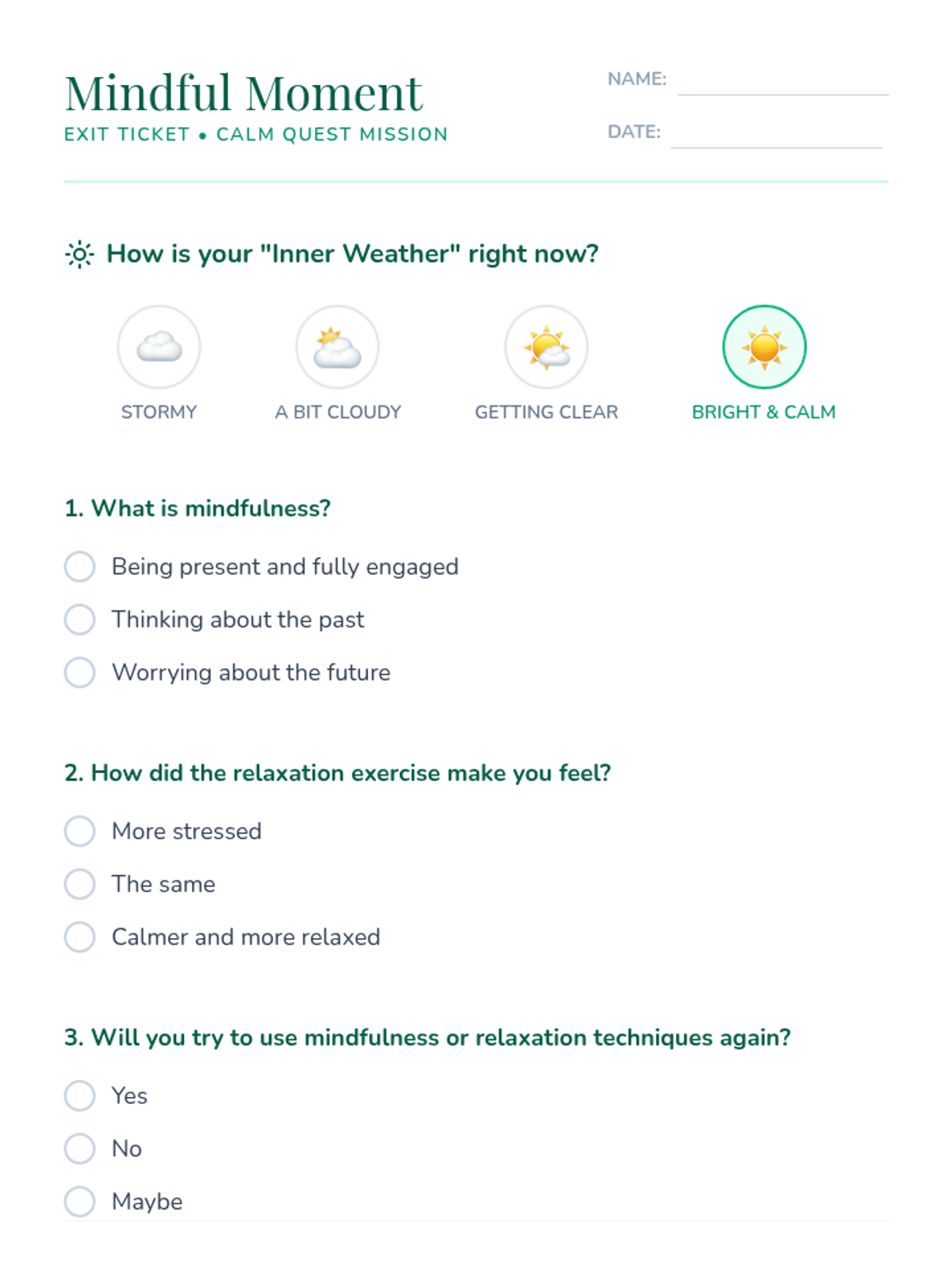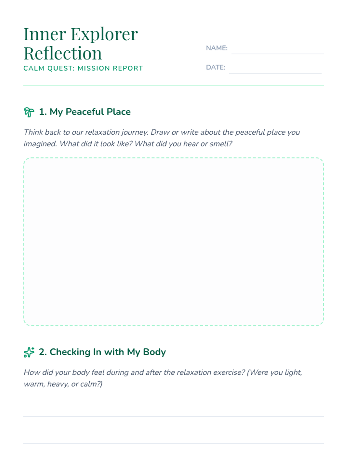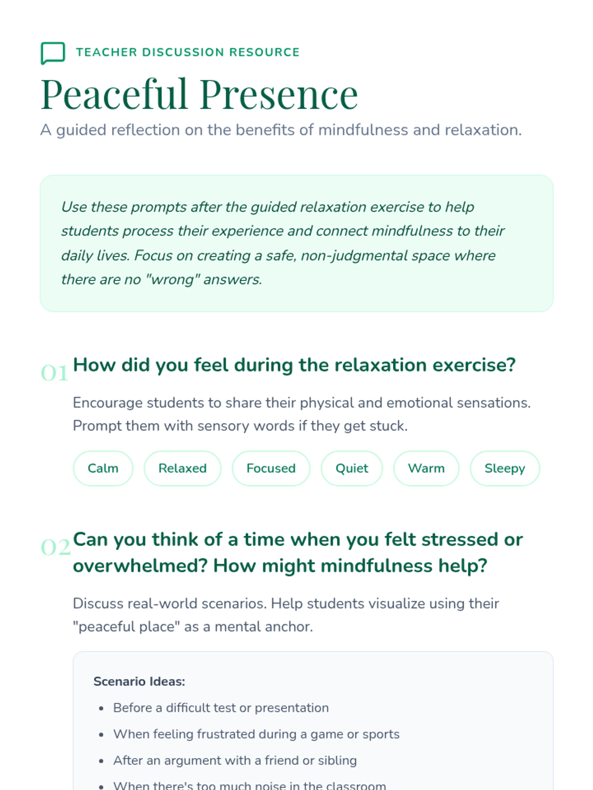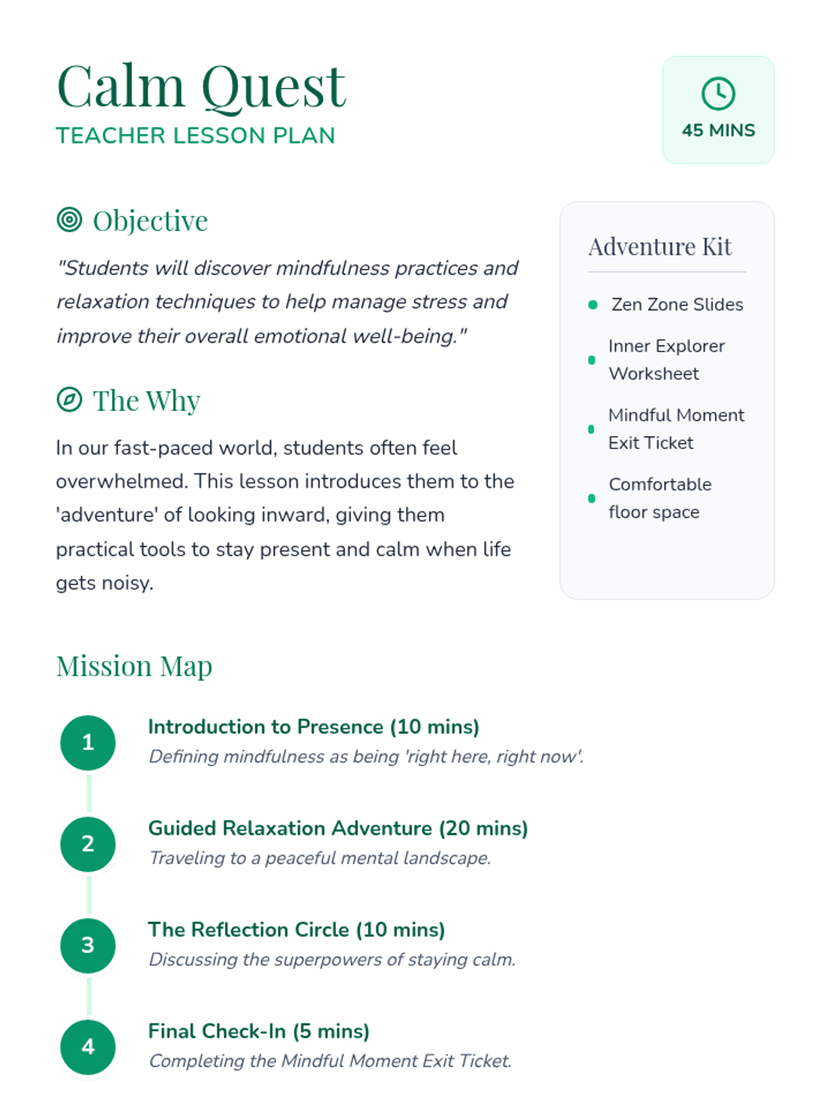 A foundational lesson introducing students to mindfulness practices and relaxation techniques through a guided 'adventure' to find their inner calm.