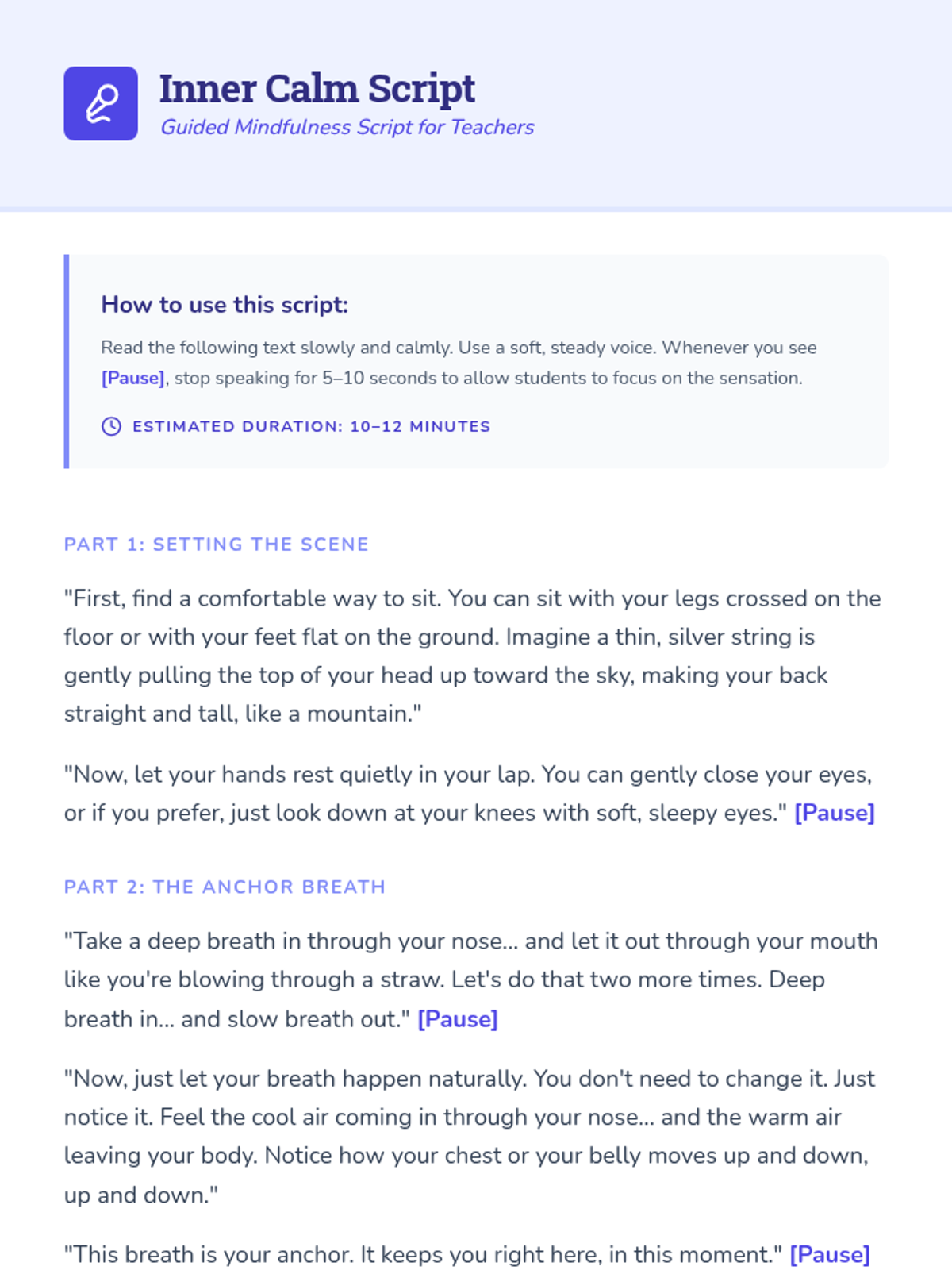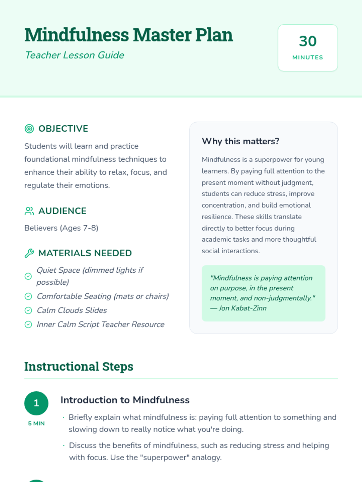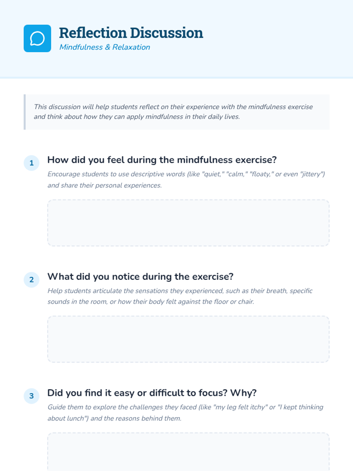 Students learn and practice mindfulness techniques, such as deep breathing and sensory awareness, to improve focus and mental well-being.