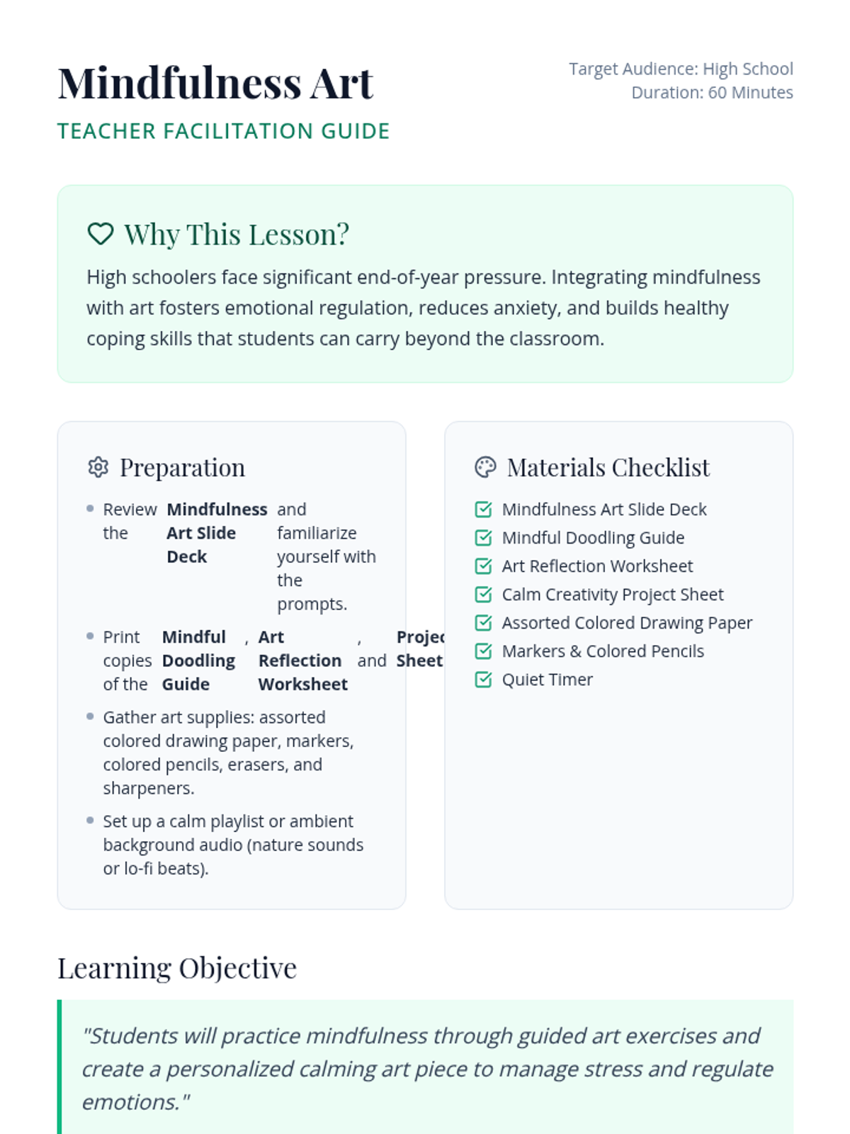 A 60-minute high school lesson that integrates mindfulness techniques with creative art practices to help students manage stress and regulate emotions during high-pressure periods.