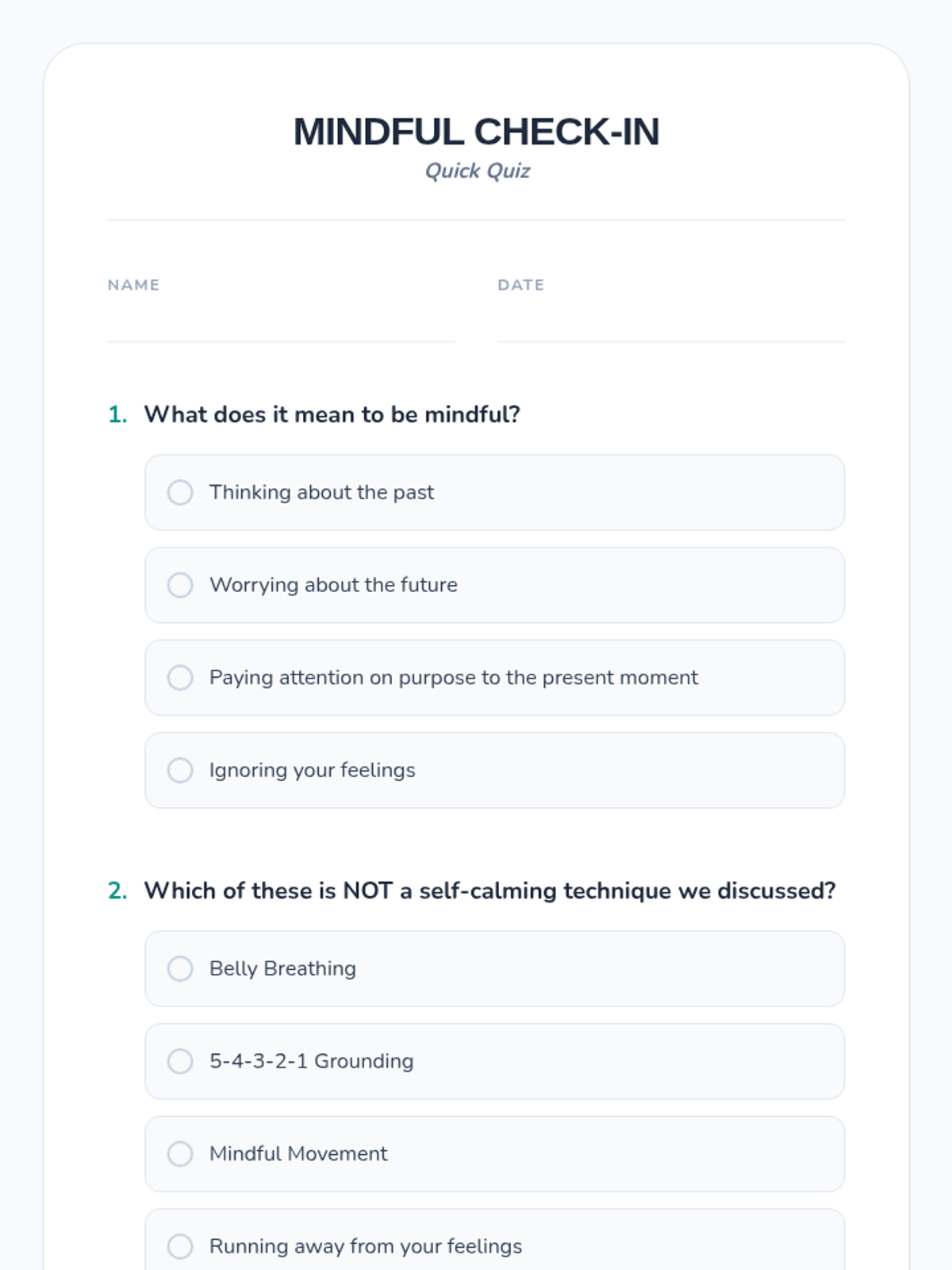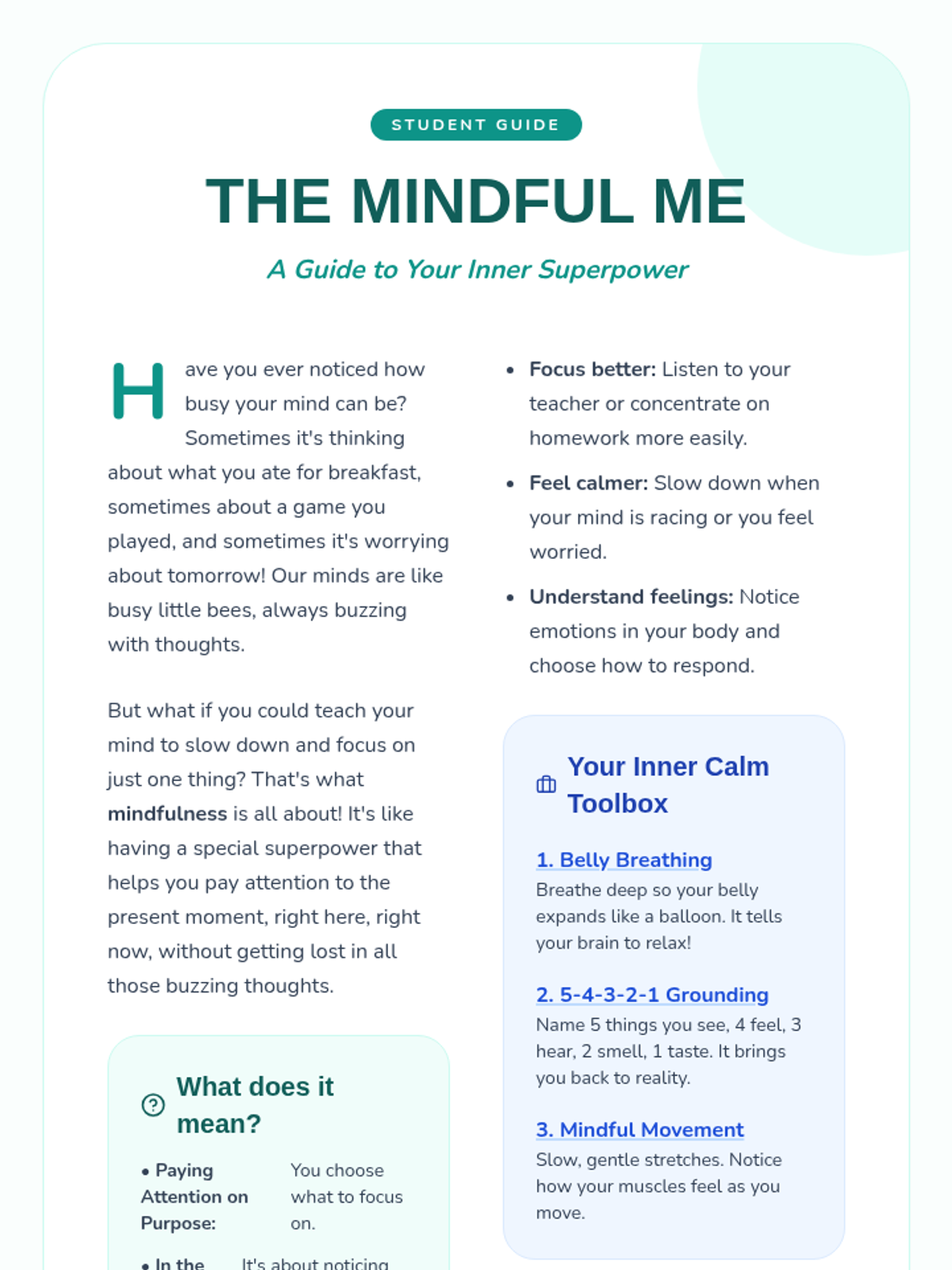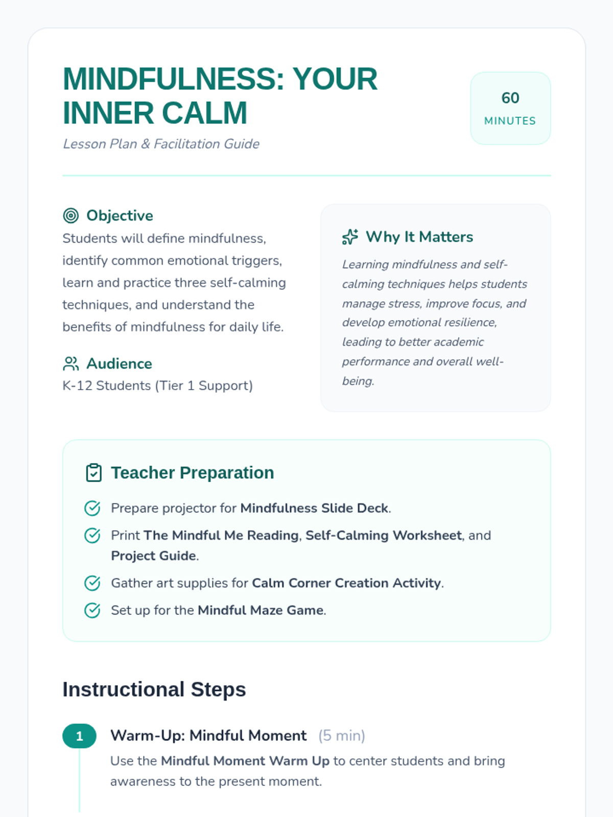 This lesson introduces K-12 students to mindfulness and self-calming techniques, teaching practical strategies to manage emotions and reduce stress for better emotional well-being.